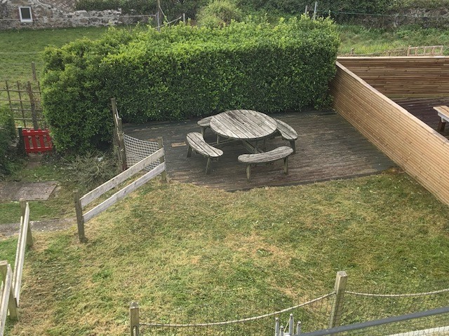 The rear garden is a good sized, mainly laid to lawn with a further decked seating area down in the corner and a gate with access out onto Bullans Hill