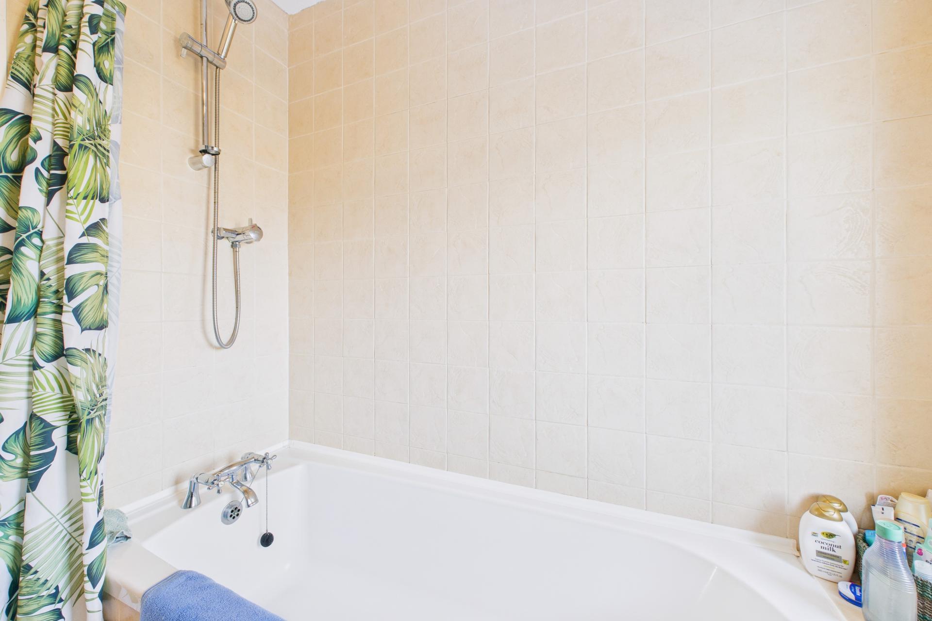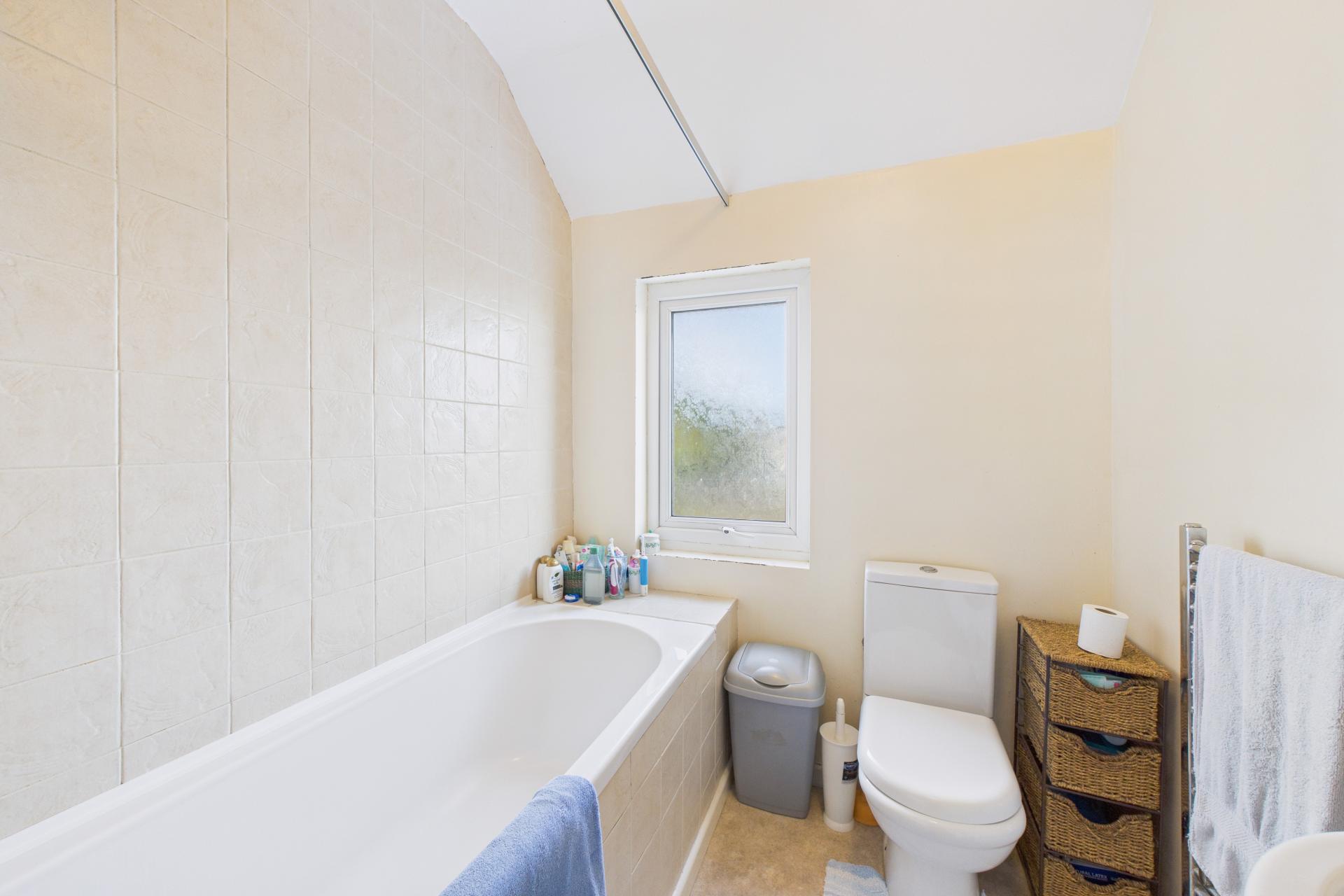 UPVC double glazed opaque window to the rear, panelled bath with mains connected shower over, close coupled WC, pedestal wash hand basin, stainless steel heated towel rail, part tiled walls