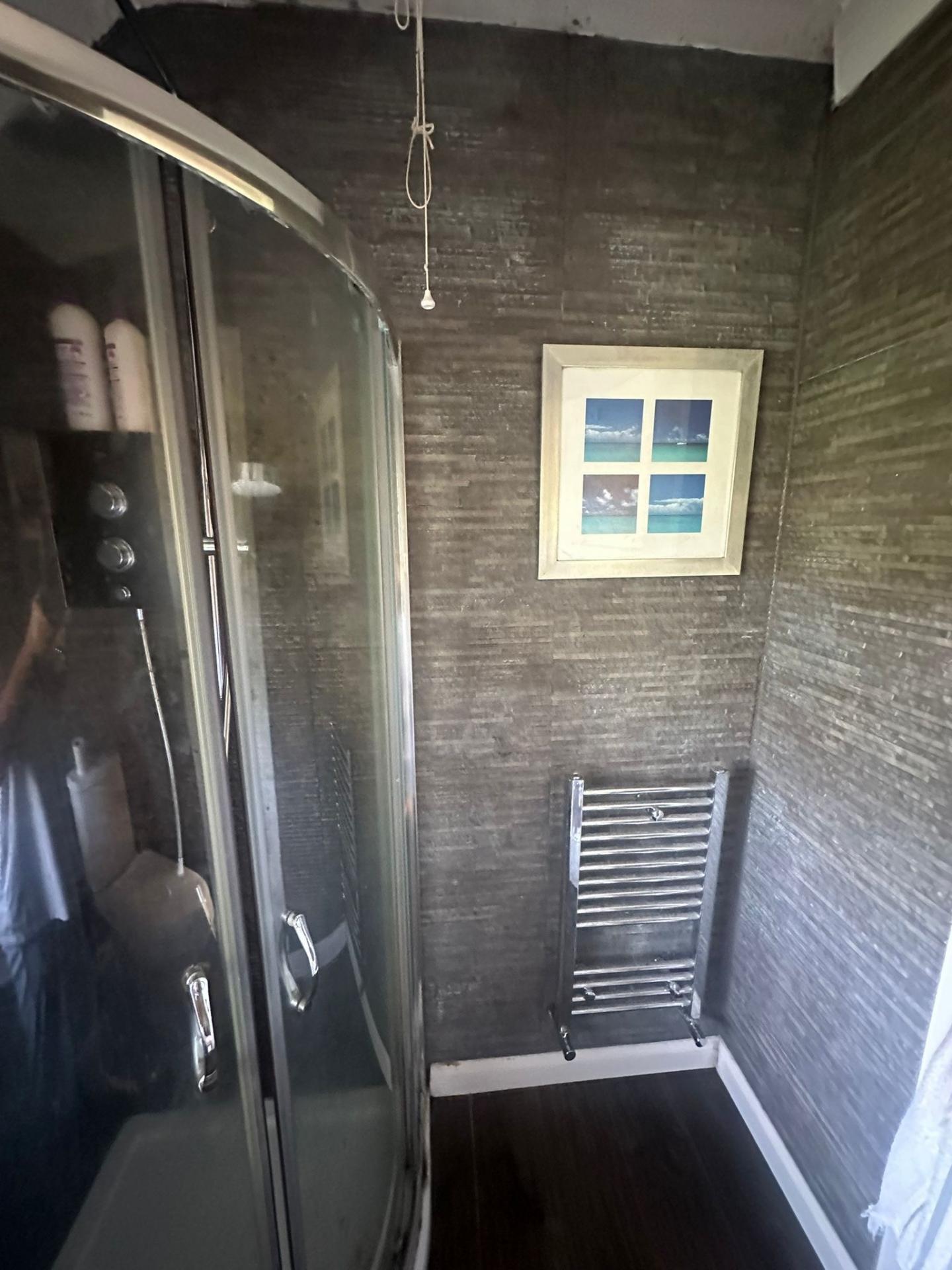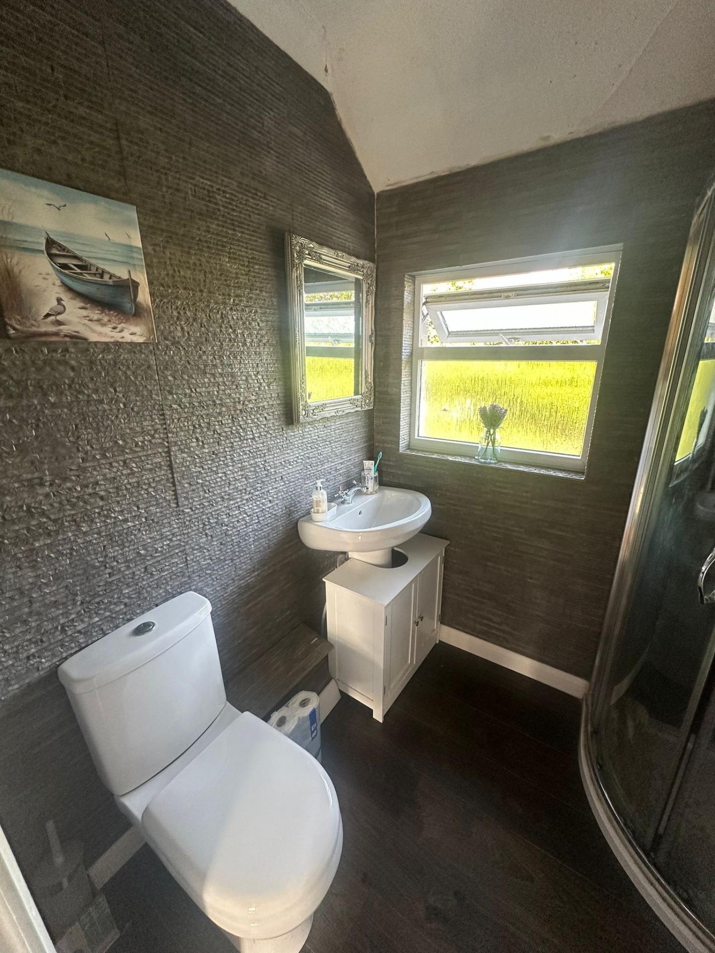 Frosted window to the rear, walk in shower cubicle with electric shower inset, enclosed WC, wash hand basin, tiled floor and walls.