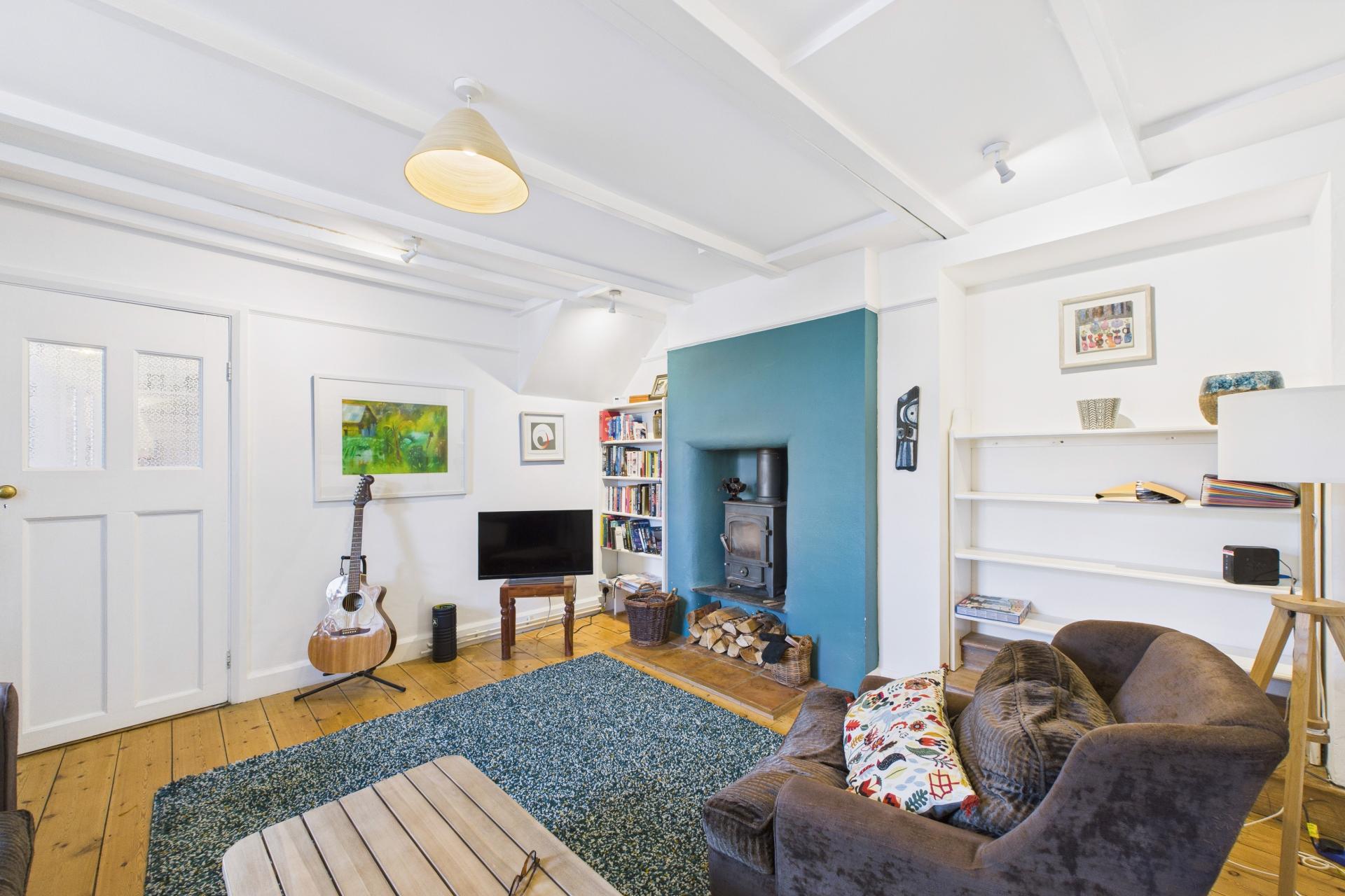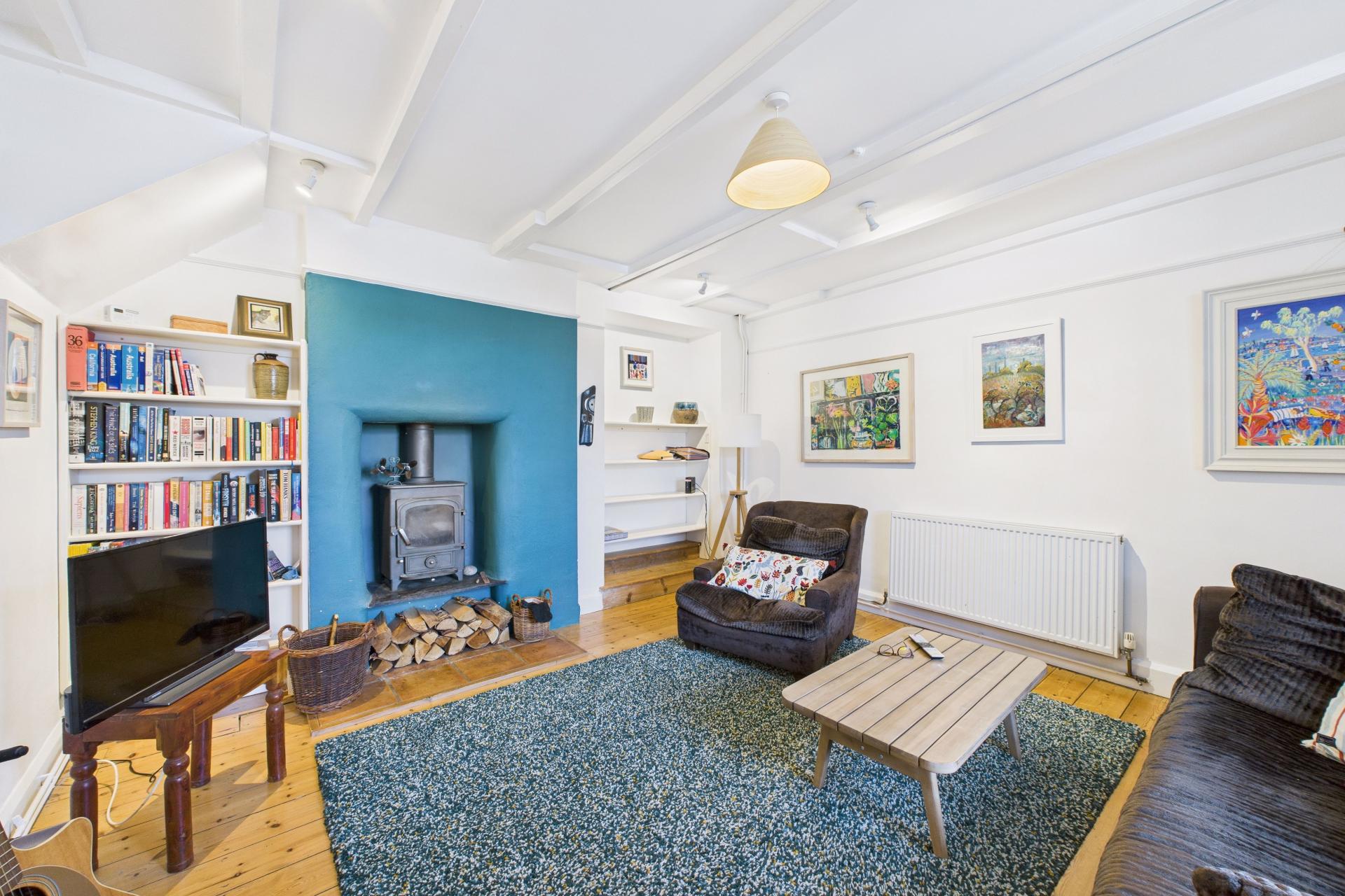 Super room with varnished exposed floorboards, sash window to the front, radiator, ample power points, raised log burner onset slate hearth, beamed ceiling, recess with shelving, TV point