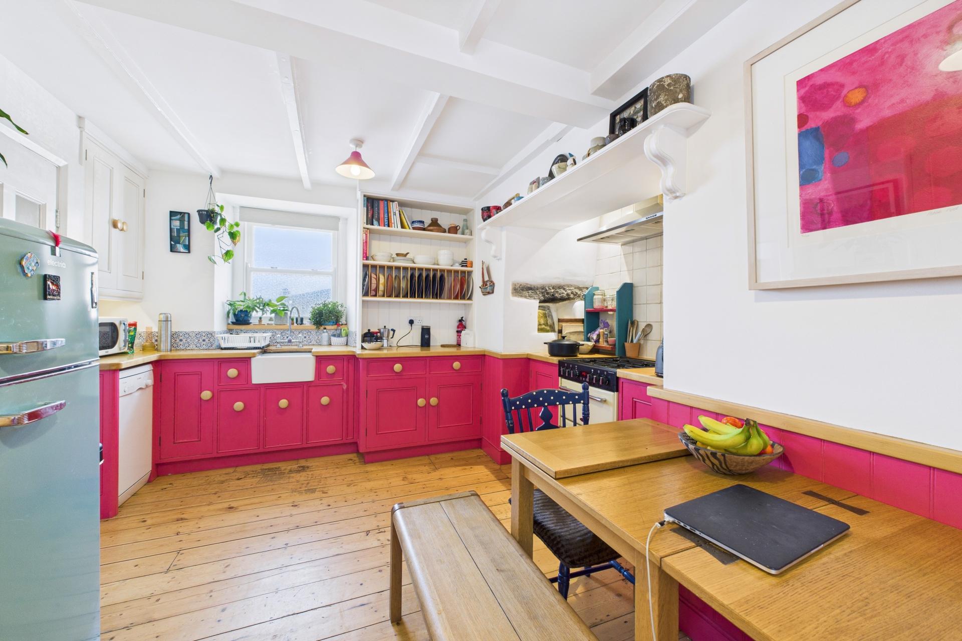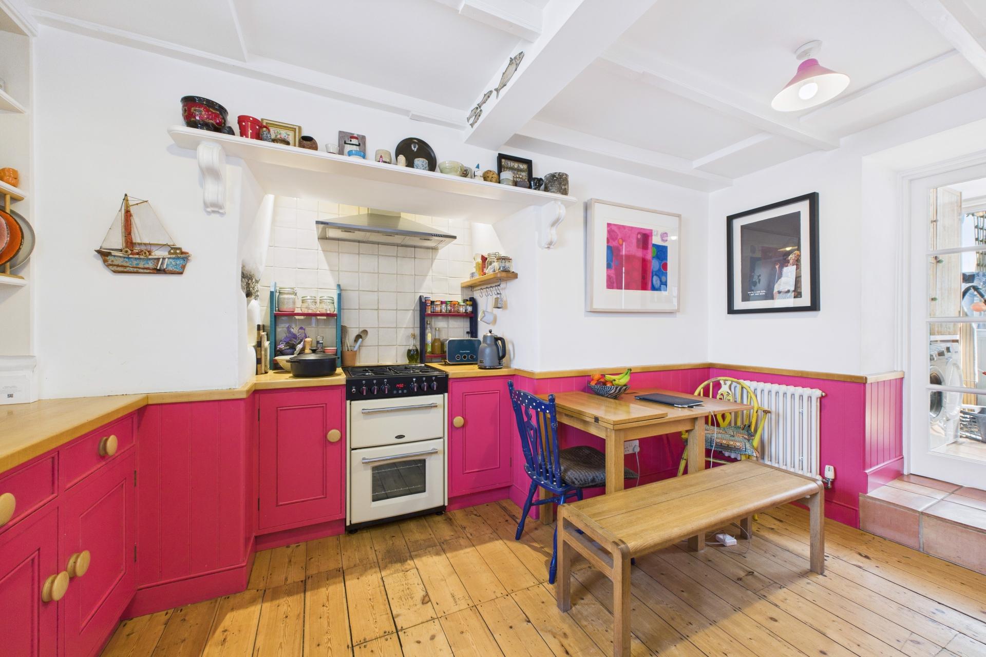 Varnished wood flooring, range of hand built eye and base level units with ample oak worktop surfaces over, Belfast sink unit with mixer tap over, sash window to the front, plumbing for dishwasher, recess with space for gas cooker and a unique old bread oven dating back we believe 200 years or more, space for fridge freezer, space for small dining table, Victorian style cast radiator, ample power points, under unit lighting, beamed ceiling, up steps to