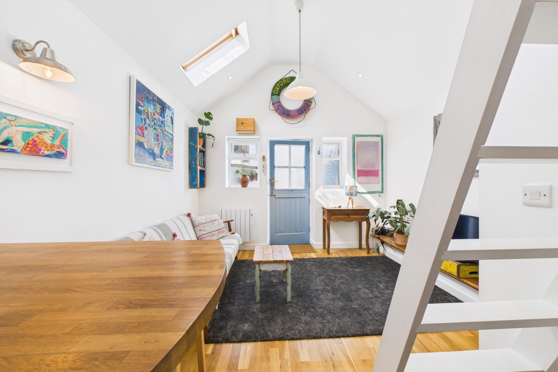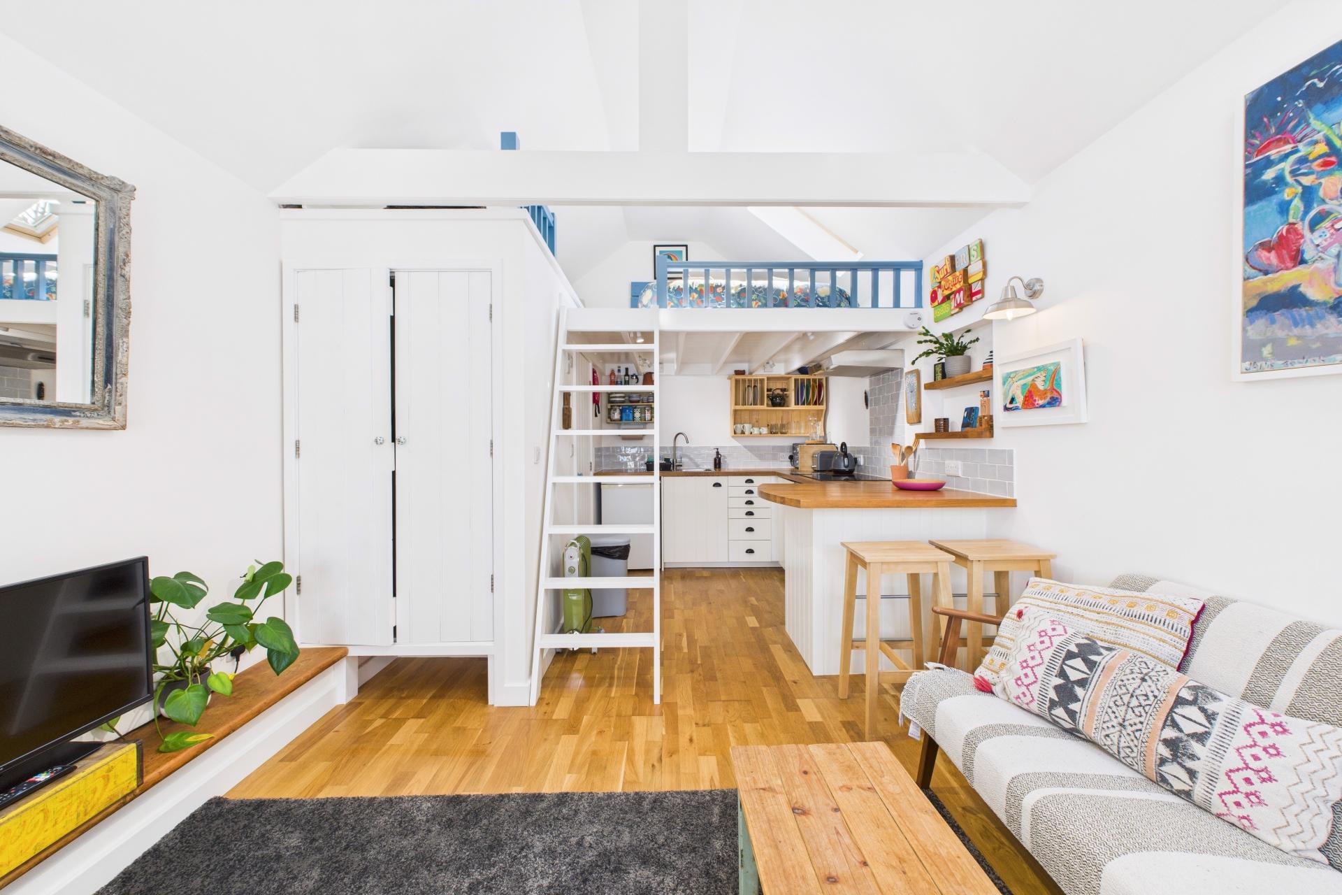 Wood stable and part glazed door with two windows either side, wood flooring, small raised plinth for TV, built in wardrobe housing hanging space and shelving, power points, TV point, ladder to mezzanine bedroom, Velux window, wall mounted electric radiator