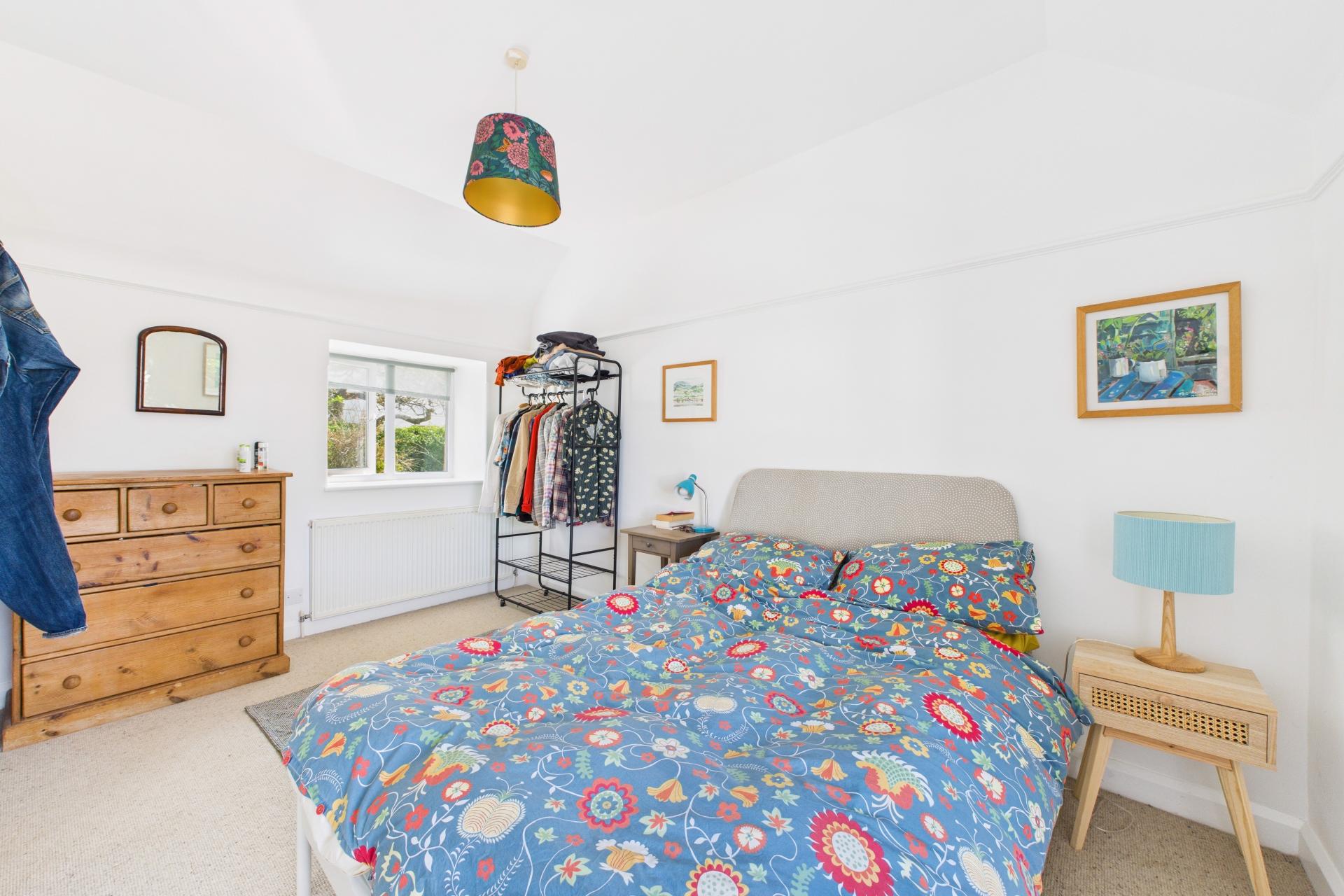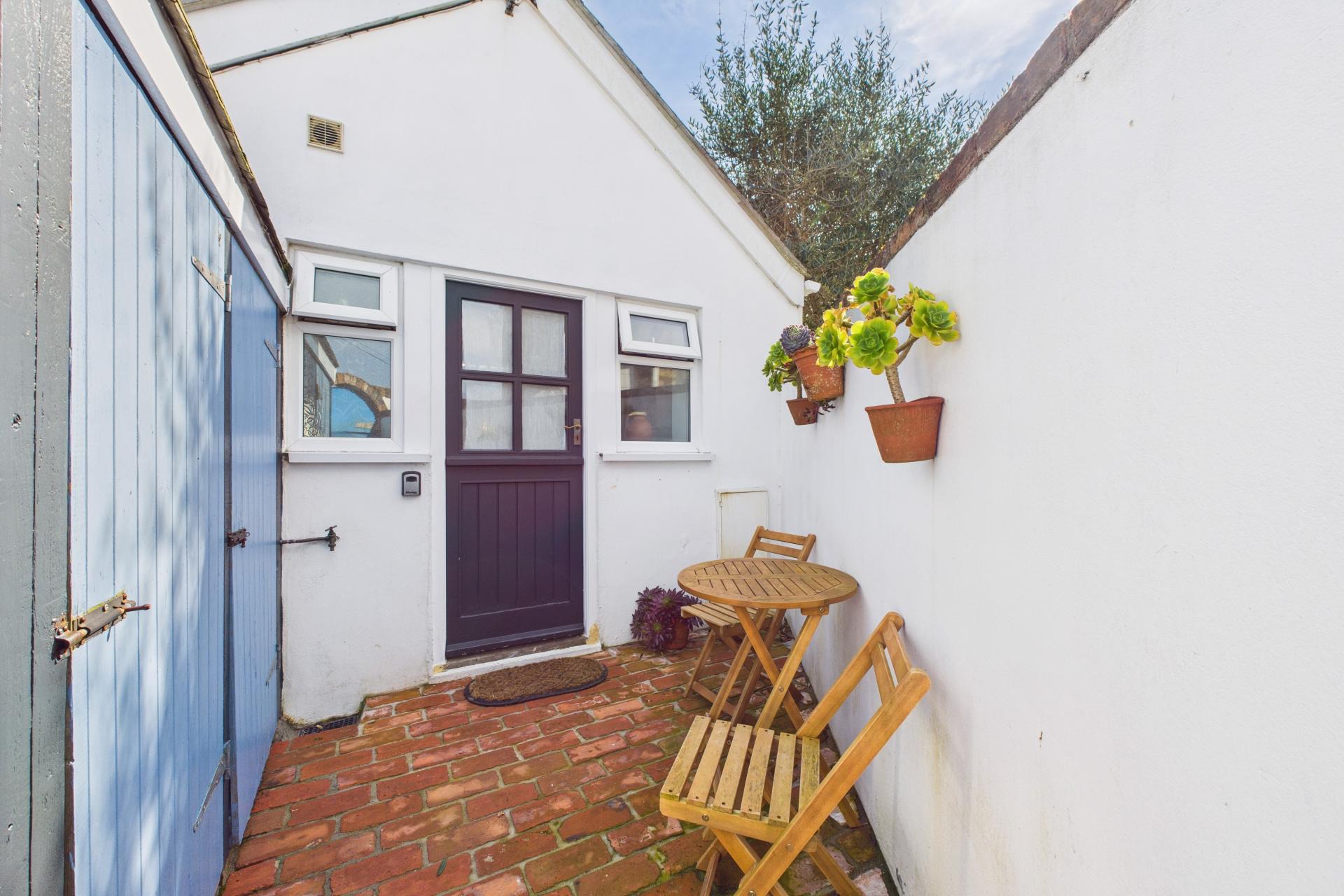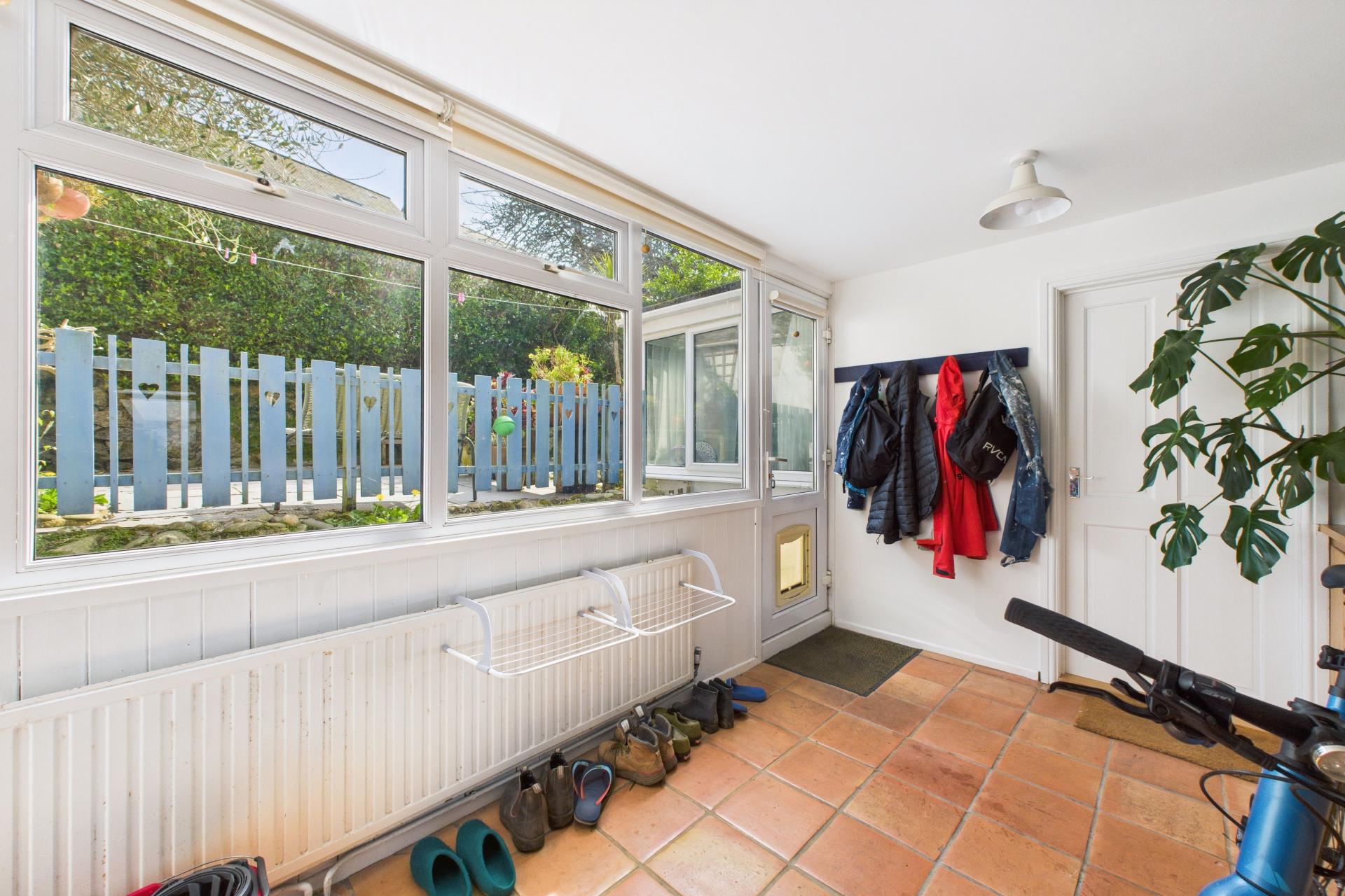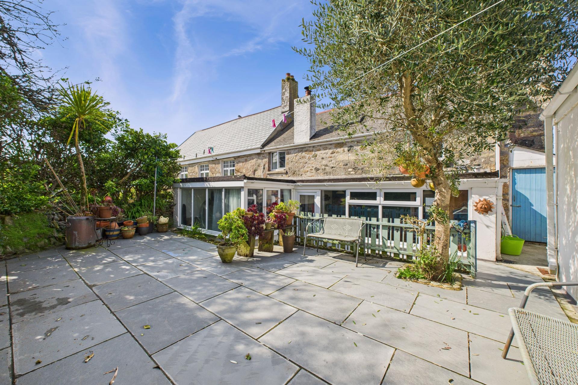 The main gardens are a real delight, private and a real sun trap all enclosed with Cornish hedging and mature hedging, there is a large patio area with planted Olive tree. There is gate access to a small area for storage and further gate access to the side