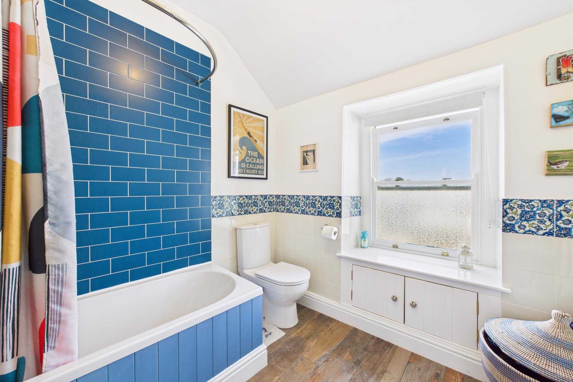Good sized bathroom with UPVC sash window to the front with storage under, part tiled walls, pedestal wash hand basin, panelled bath with mains connected shower over, close coupled WC, pedestal wash hand basin, Victorian style radiator