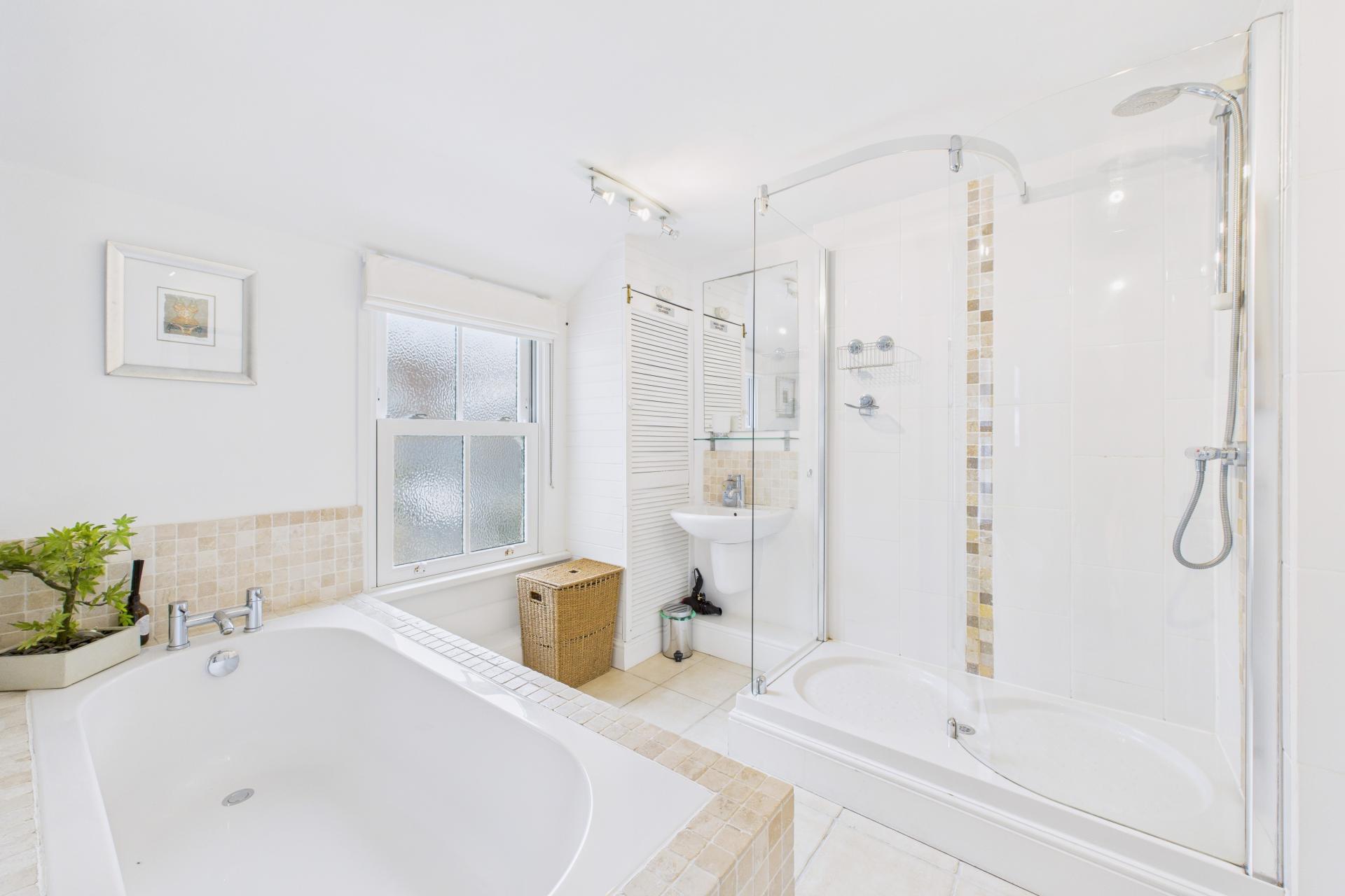 Beautifully appointed family bathroom and a great size with tiled flooring, patterned double glazed window to the side, large walk in shower cubicle with mains connected shower inset, wall hung wash hand basin, large bath with tiled surround, close coupled WC, stainless steel heated towel rail with smaller further window to the side
