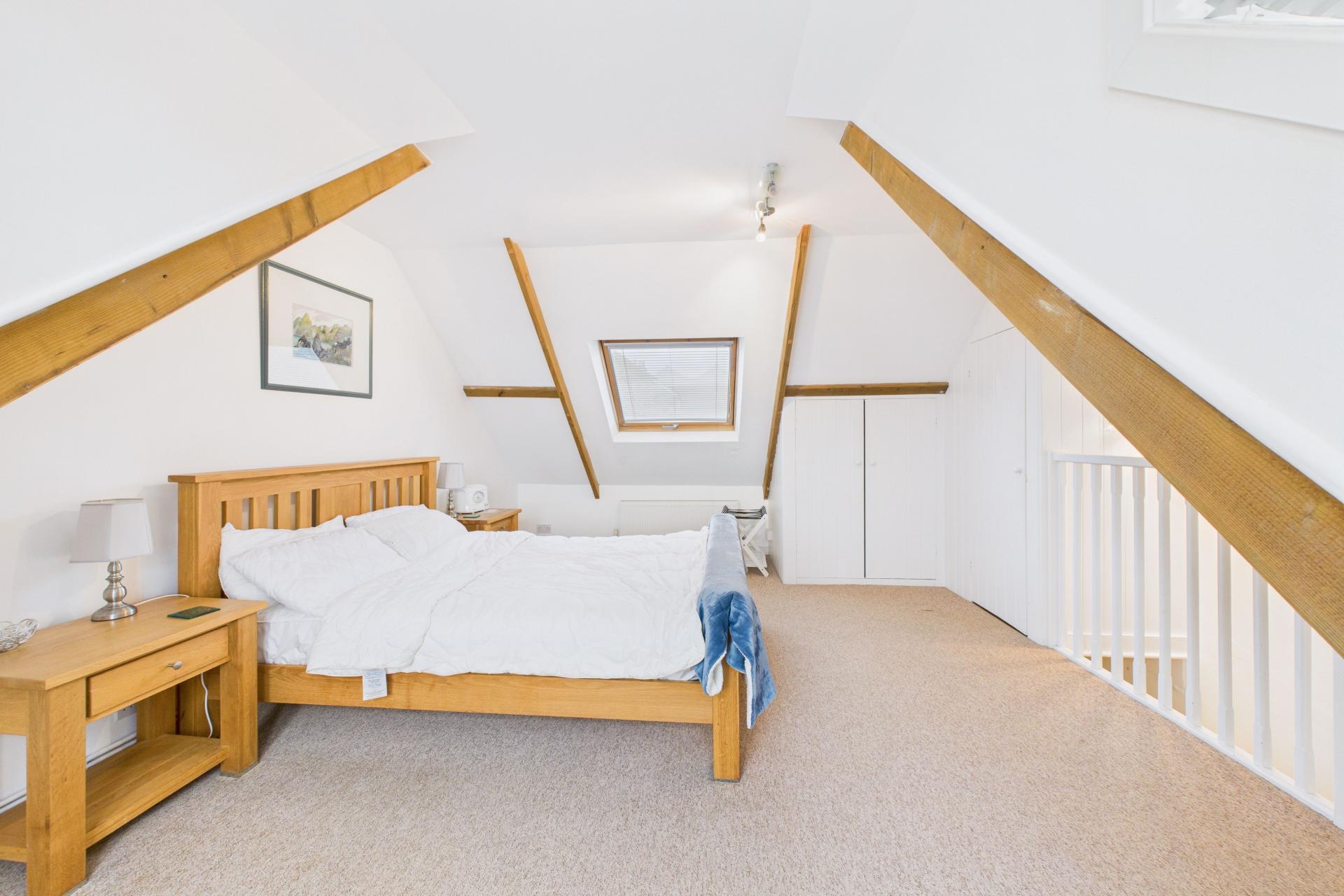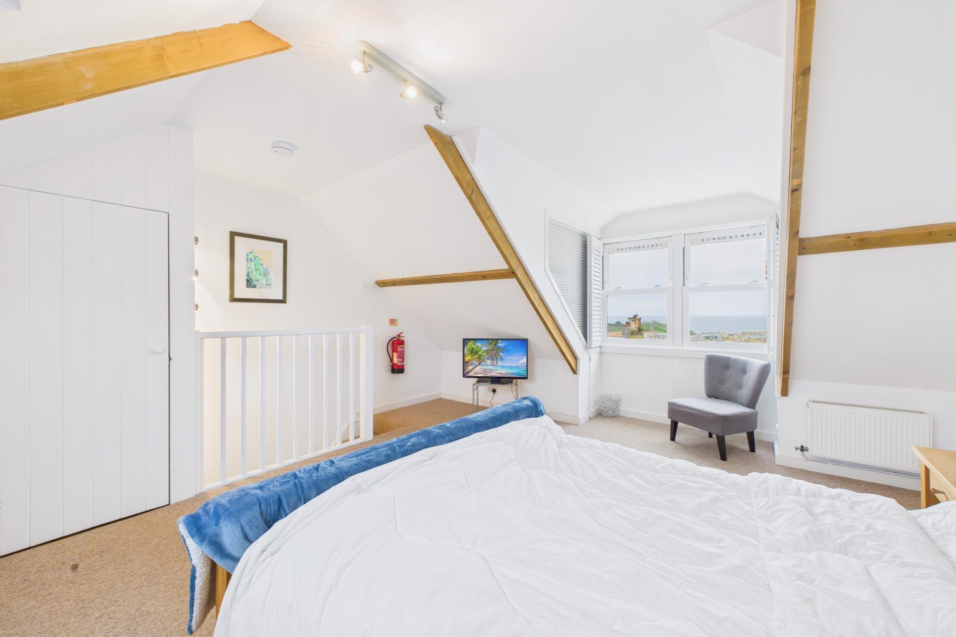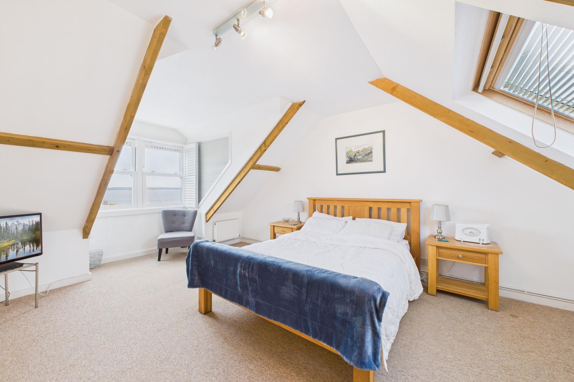 Super room, light and bright having large Velux window to the rear and a double glazed dormer window to the front offering superb sea and coastal views looking down onto the harbour with window shutters, two radiators, built in storage, power points, part apex pitched ceiling with exposed rafters, TV point, power points