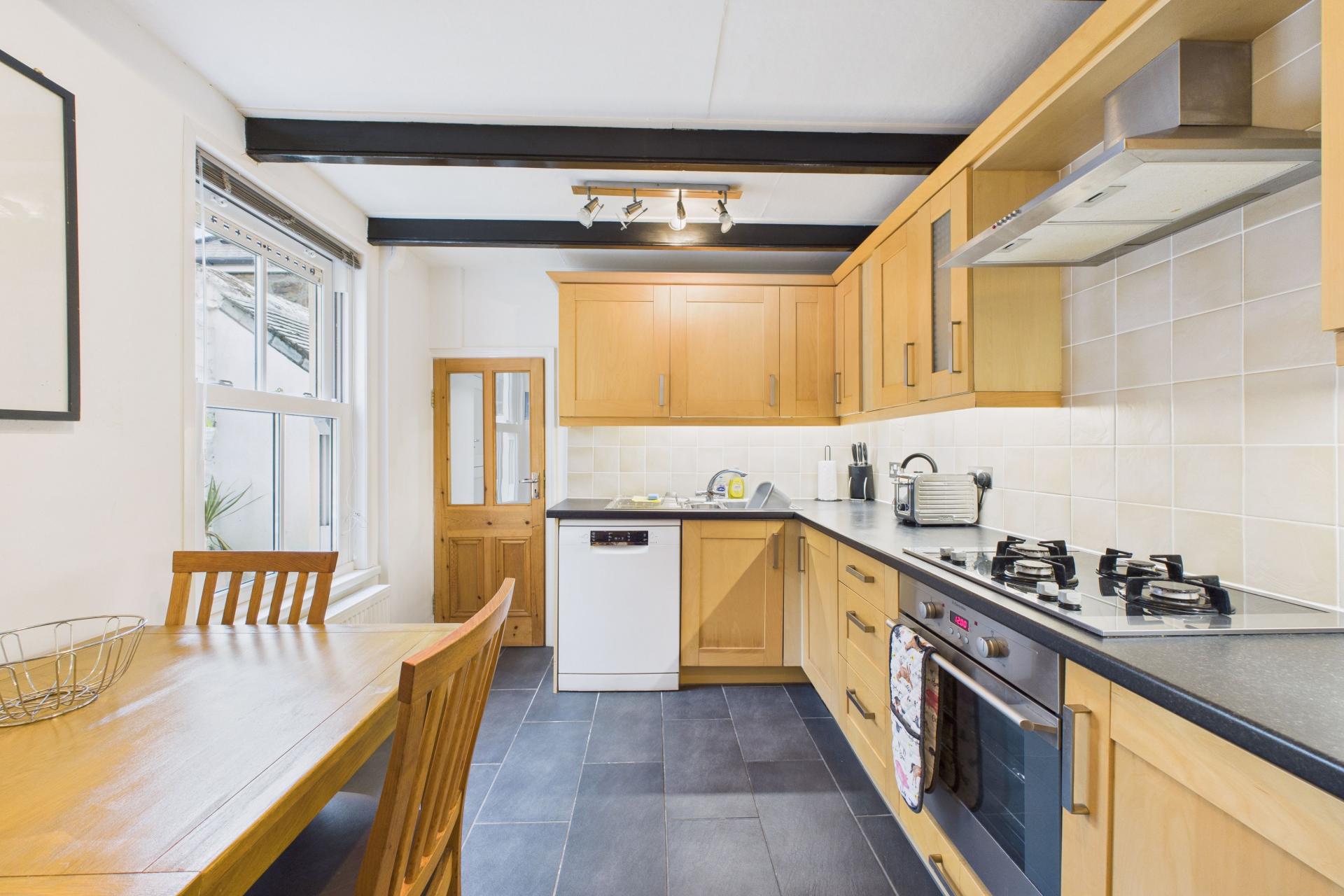 The property features two bathrooms (including a particularly large family bathroom) and a private enclosed rear courtyard, ideal for outdoor dining or relaxing after a day by the coast.