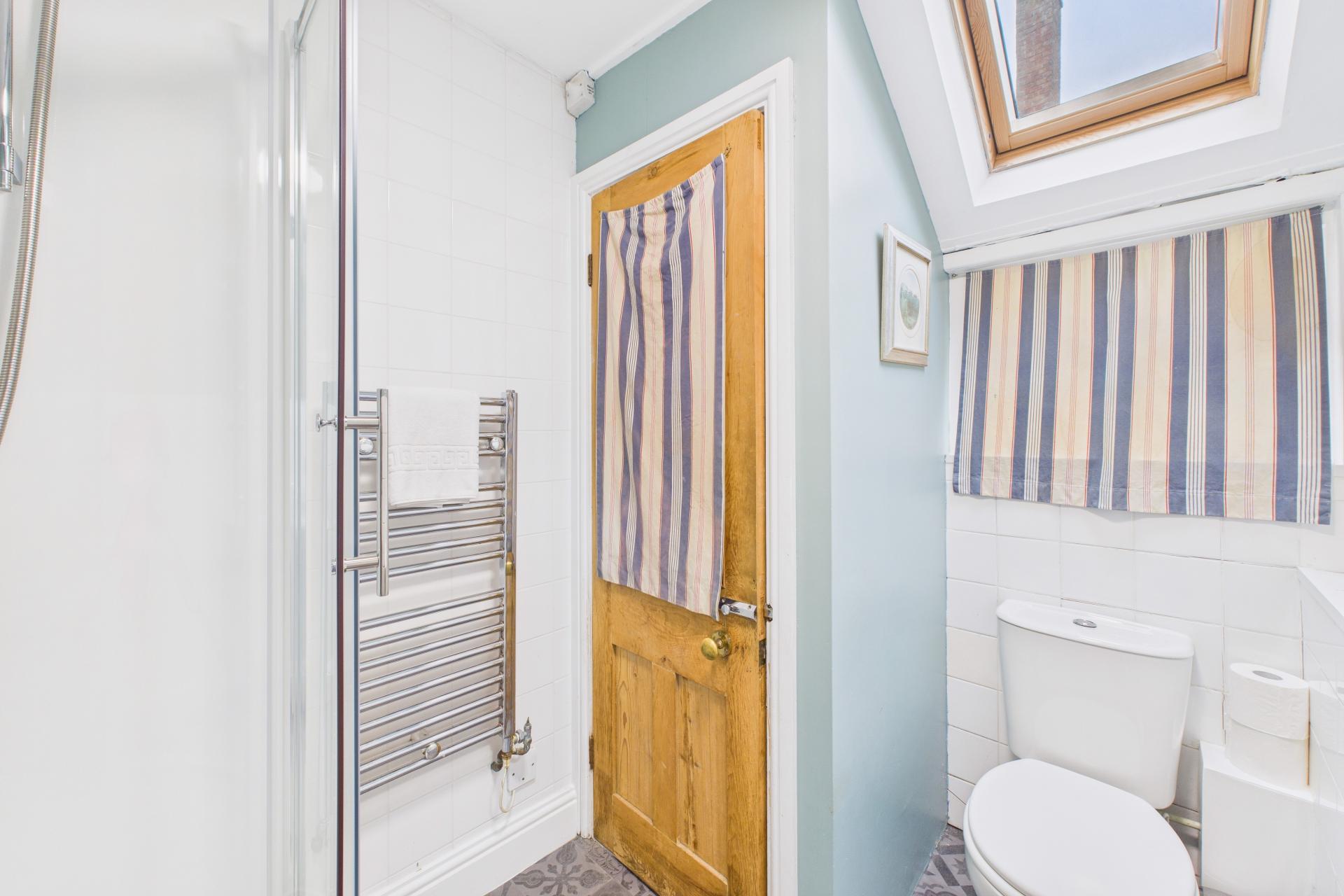 Velux window and further window to the side, close coupled WC, wall mounted wash hand basin, walk in corner shower unit with mains connected shower inset, stainless steel heated towel rail, part tiled wall and tiled floor