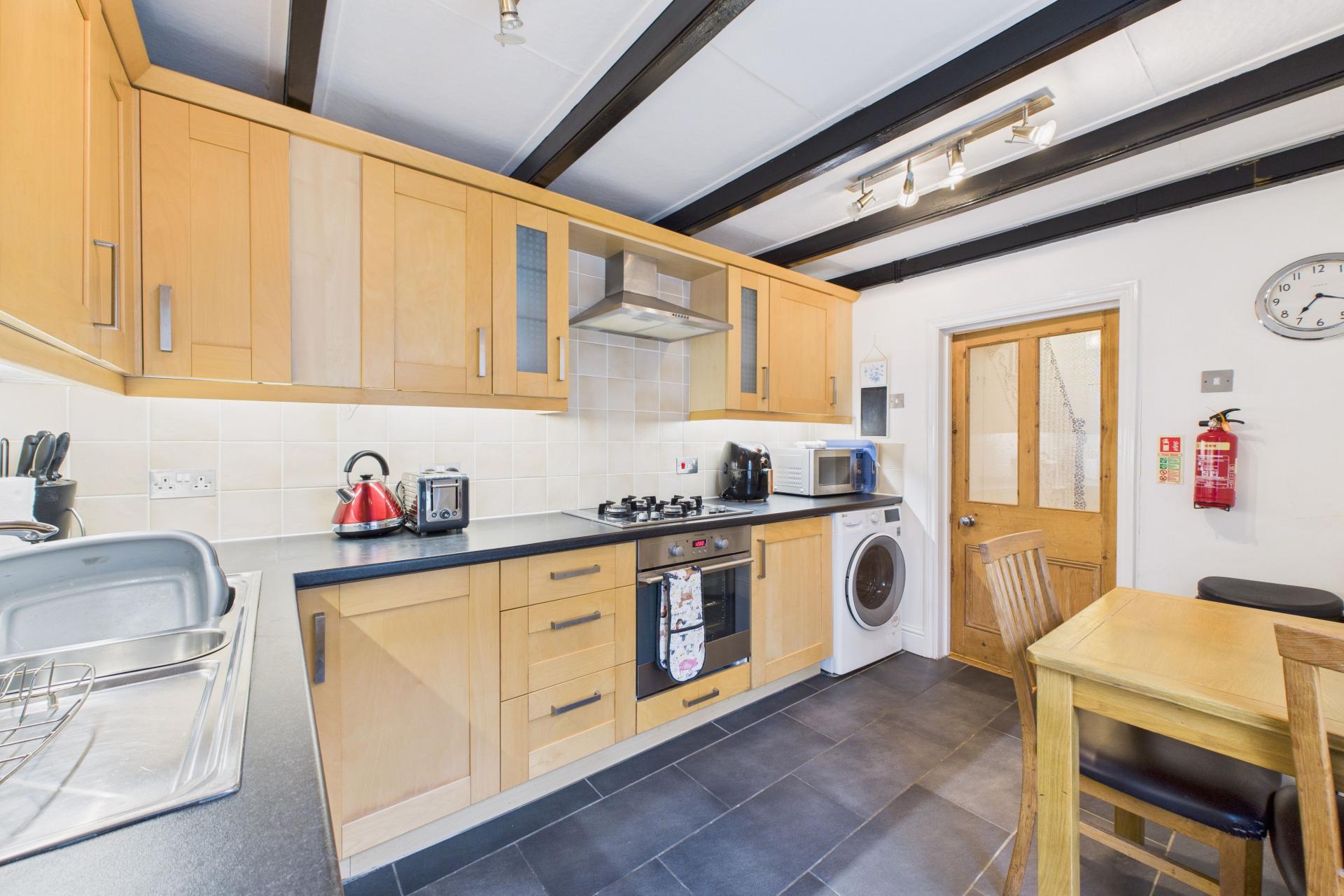 Double glazed window to the rear, radiator, tiled flooring, beamed ceiling, range of eye and base level units with worktop surfaces over, four ring gas hob with electric oven under and stainless steel hood and fan over, space for dishwasher, stainless steel sink unit and drainer with taps over, plumbing for washing machine, complimentary tiling, power points, integrated fridge, door to