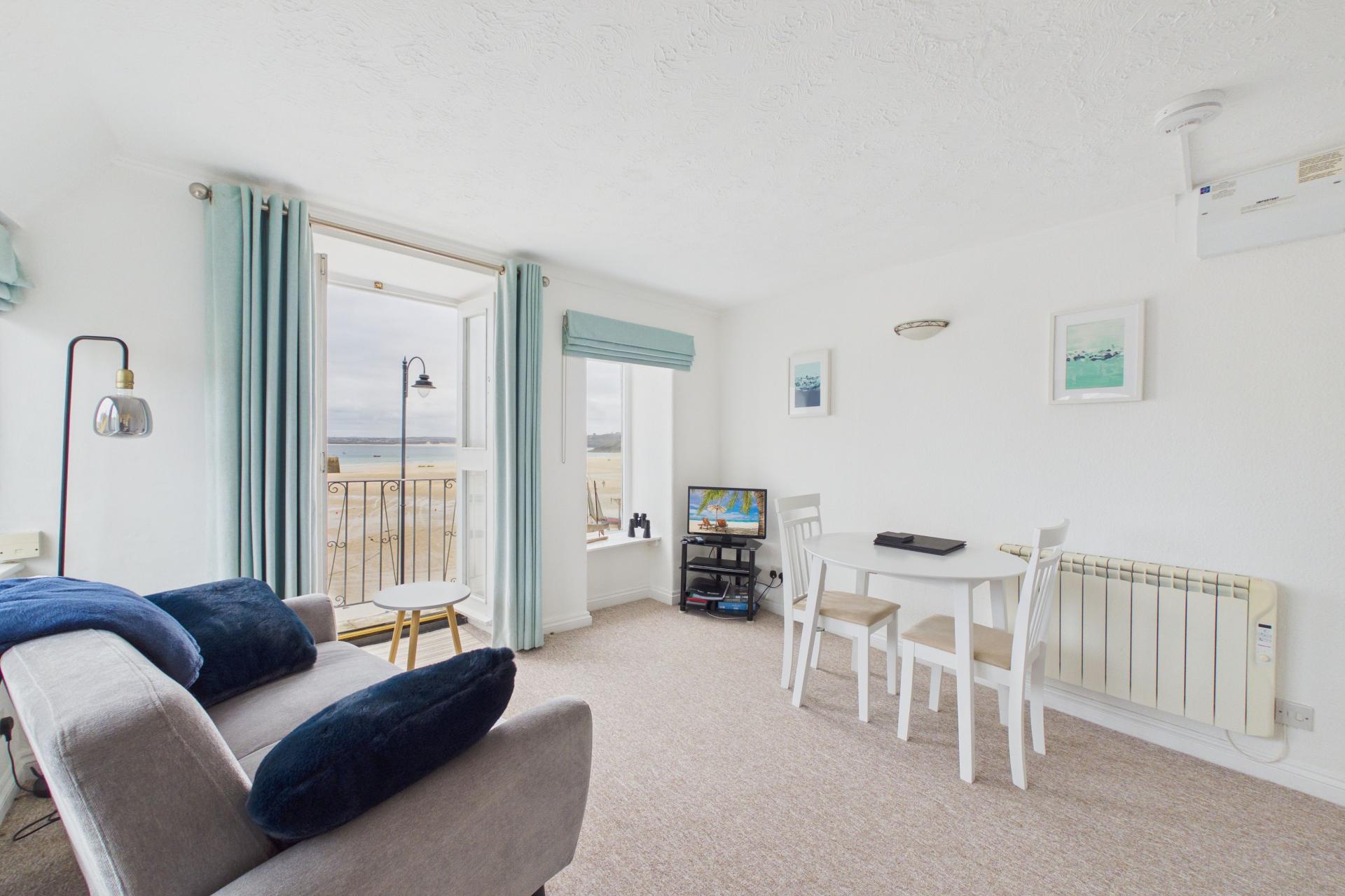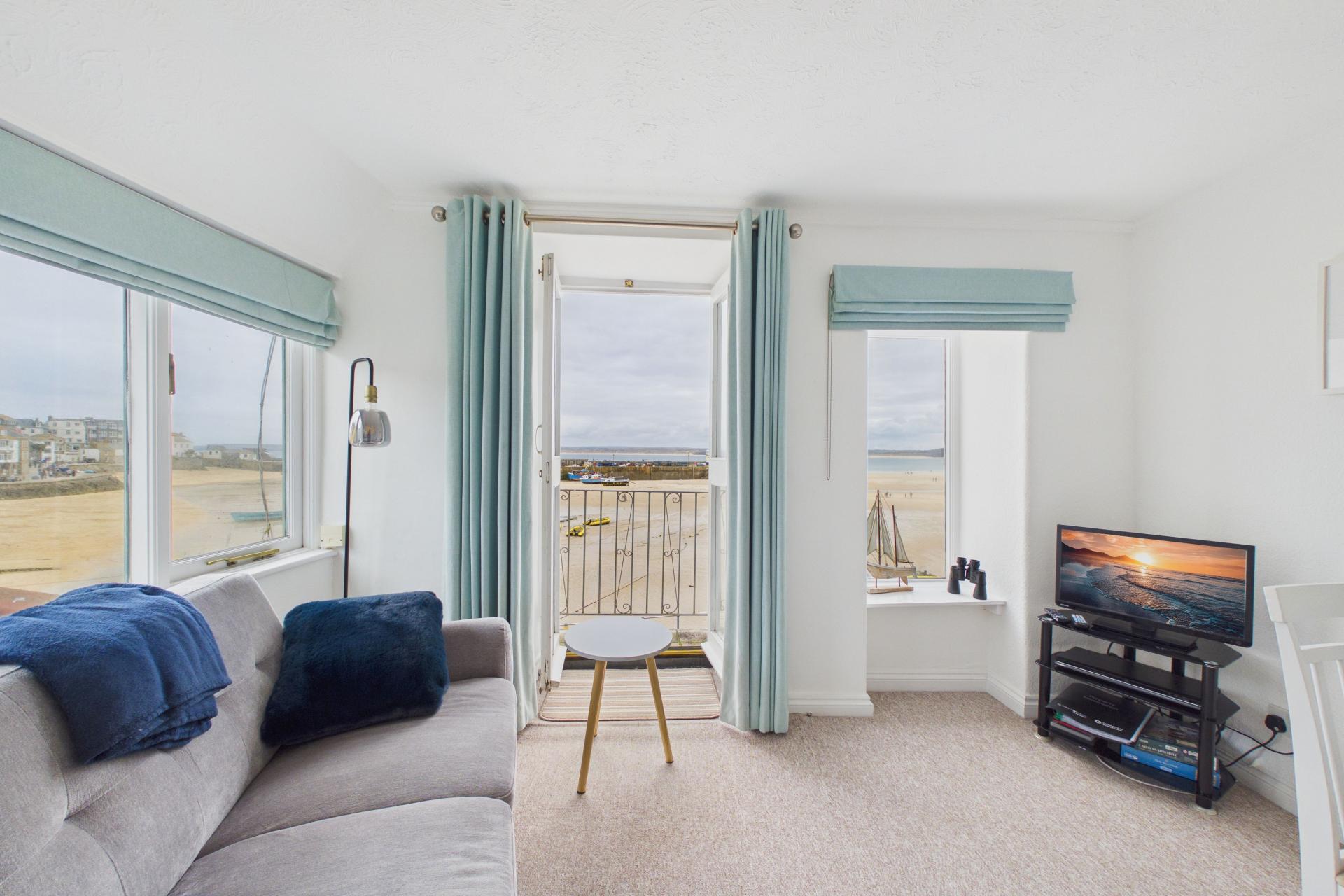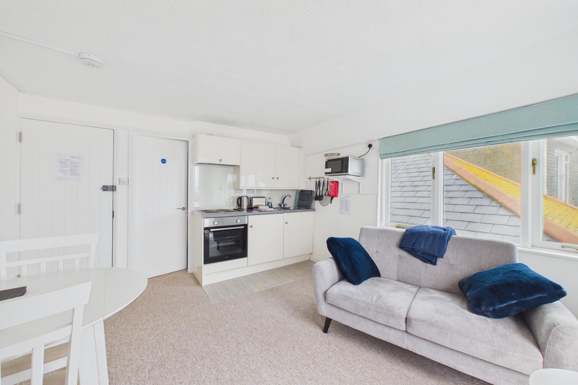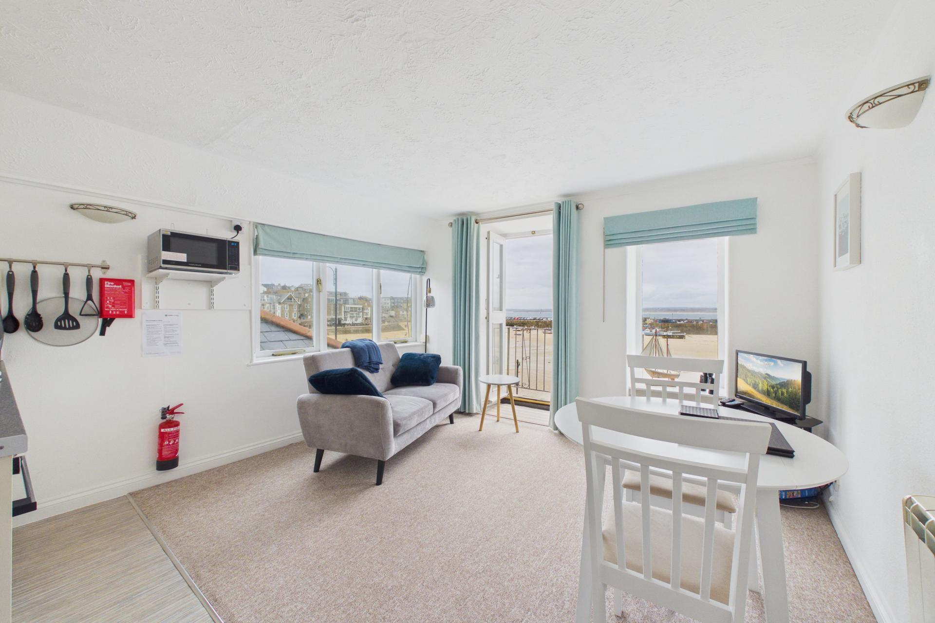 Lovely room, very bright and light offering numerous windows to the front and side with superb views and double doors opening out to to small balcony offering amazing views over St Ives Harbour and up along the coastline, TV point, power points, wall mounted electric radiator, Small kitchenette with stainless steel sink unit and drainer with taps over, integrated fridge with freezer box, four ring electric hob with electric oven under, power points.