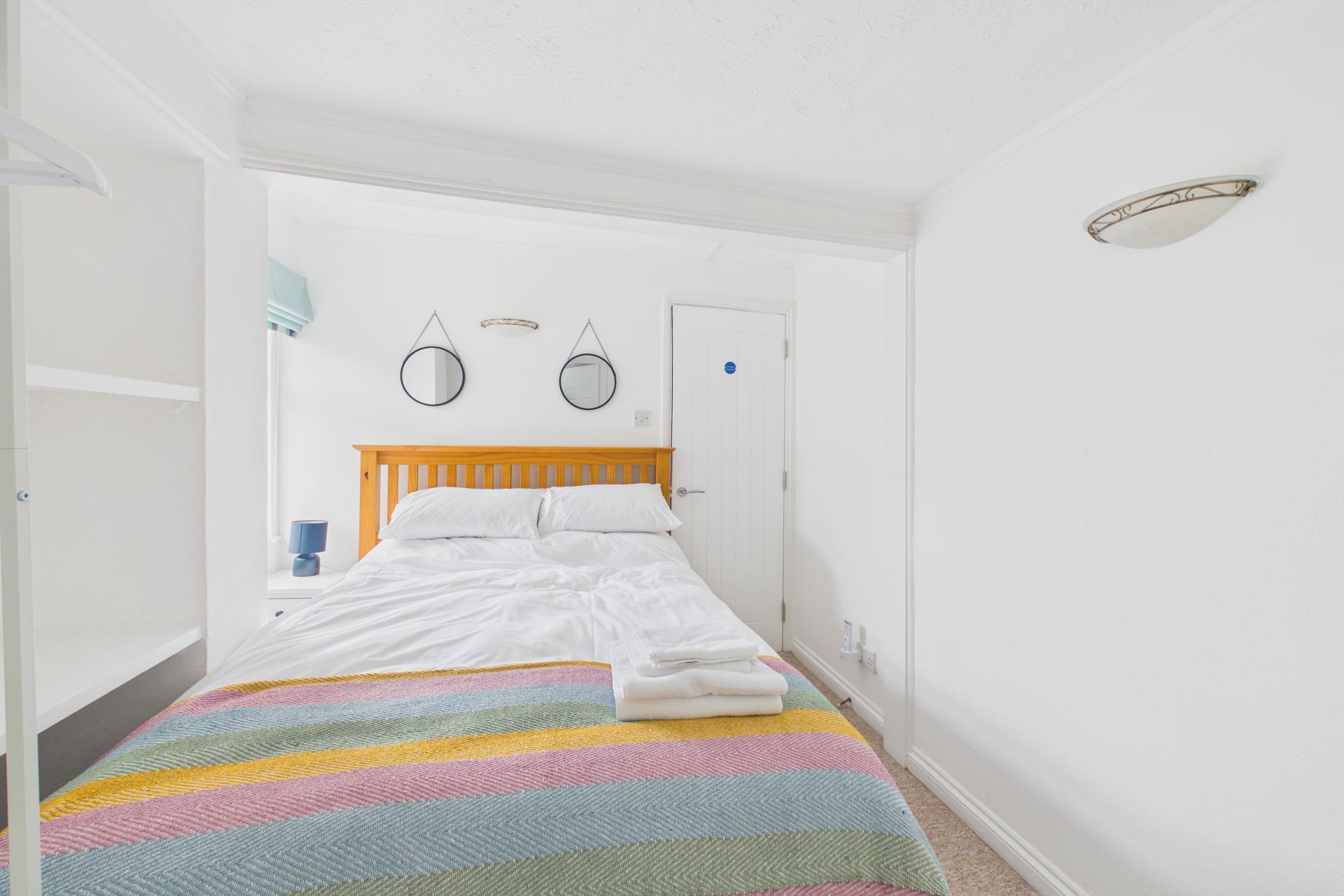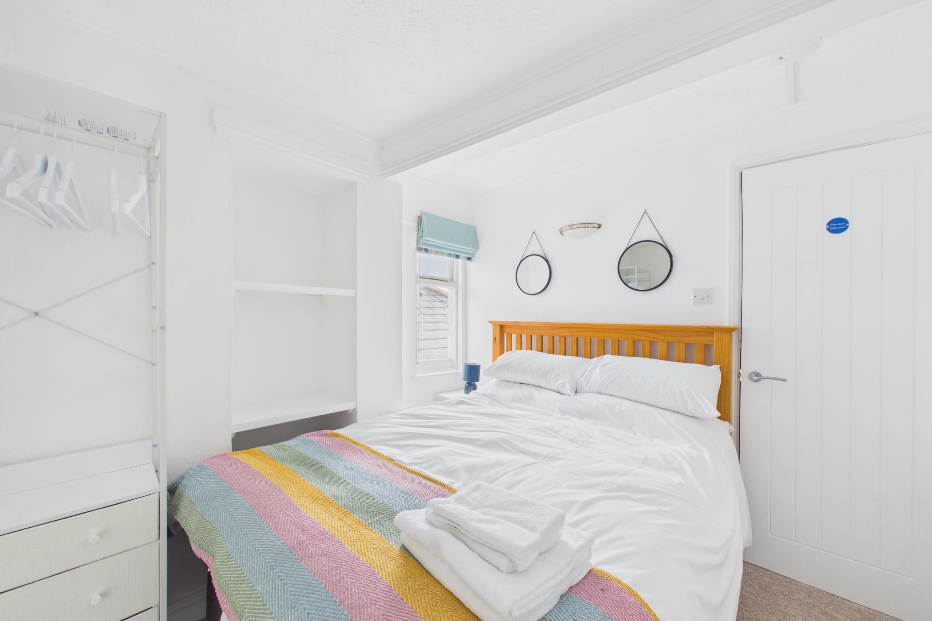 Good double room with window to the side, with a glimpse of the sea, recess with shelving and space for wardrobe, wall mounted electric radiator, power points, door to