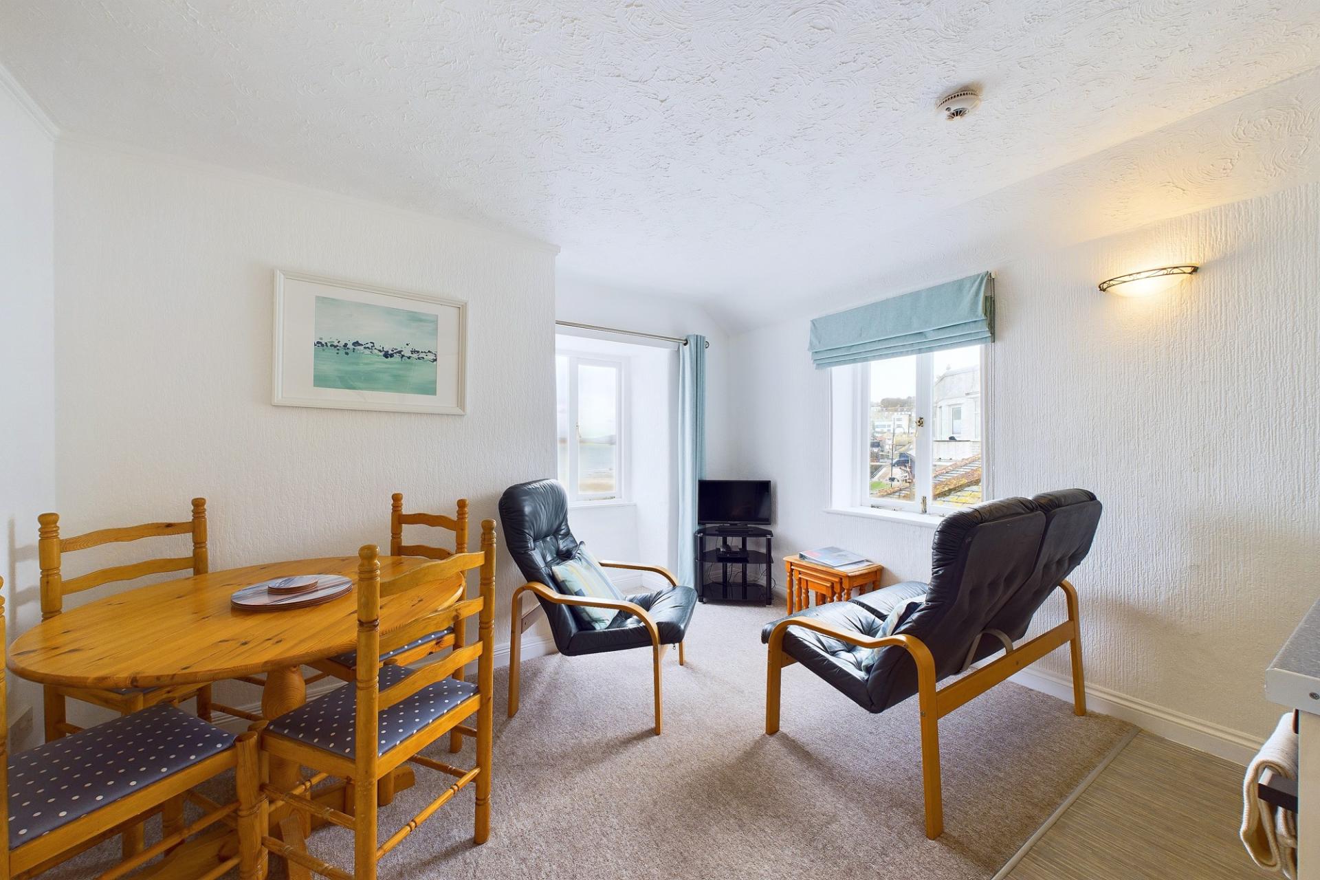 Open plan living room with dual aspect windows to the front and side opening up with superb views over the world famous St Ives Harbour and up along the coastline to St Ives Bay and Godrevy Lighthouse in the distance, power points, wall mounted electric radiator, power points, TV point, kitchenette comprising stainless steel wash hand basin with taps over, four ring electric hob with electric oven under and extractor over, integrated fridge with freezer box, power points, small entrance hallway and door to: