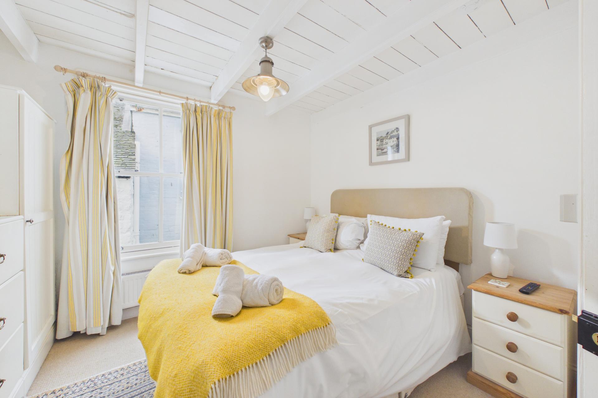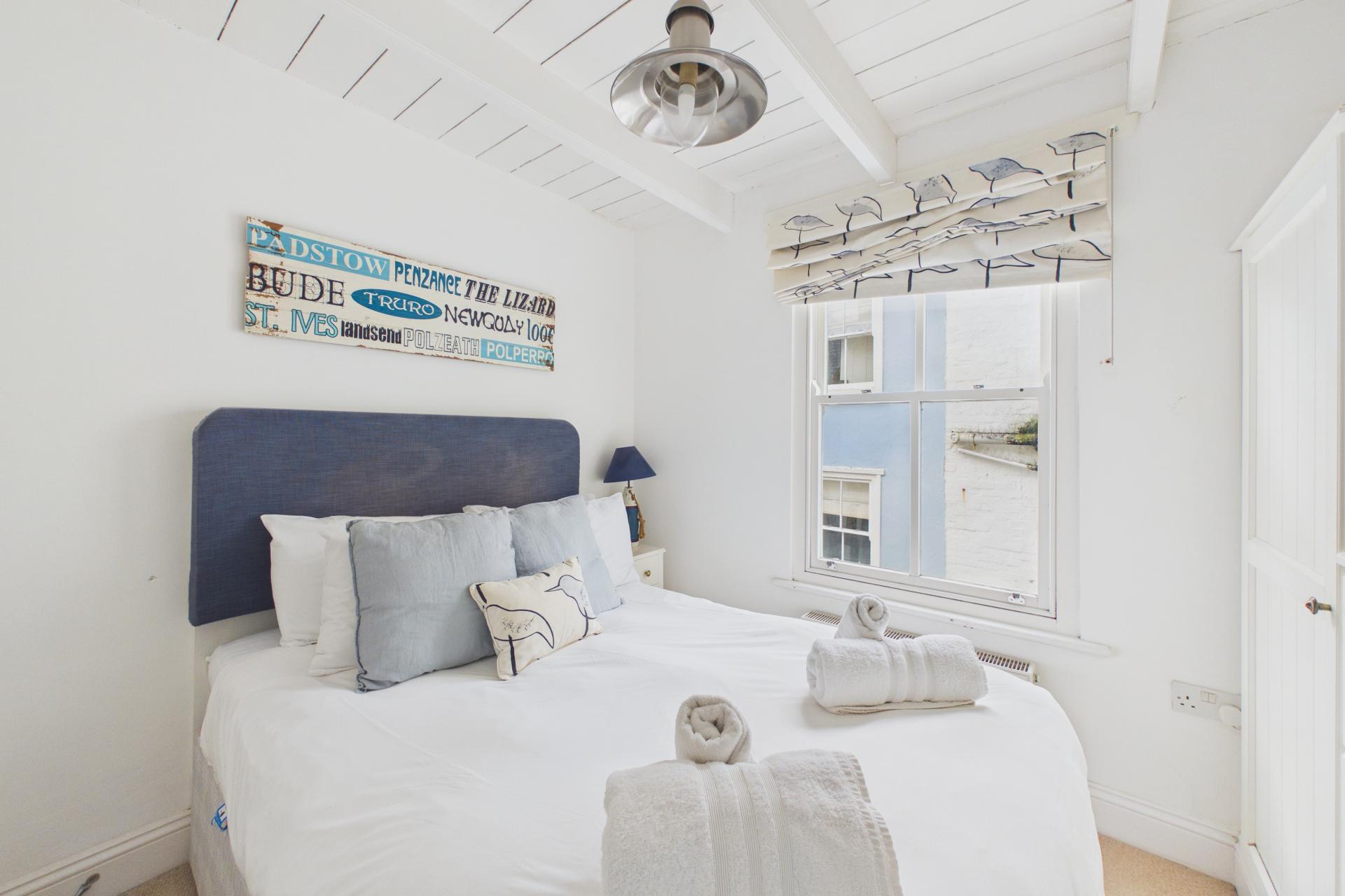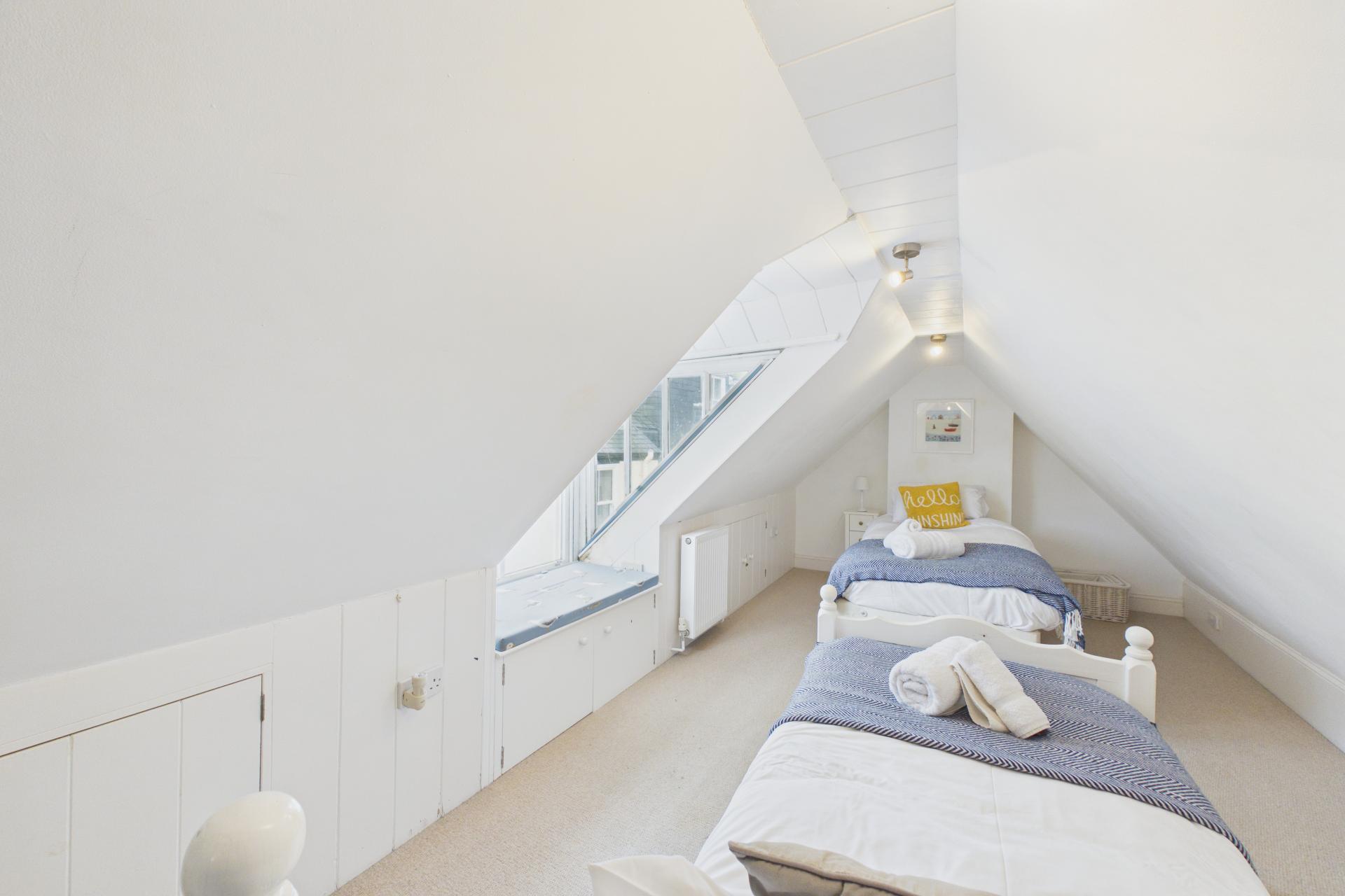 Slight restricted head room with pitched ceiling, storage under the eaves, power points, radiator, dormer window to the front offering some lovely views down towards the harbour over the character roof tops