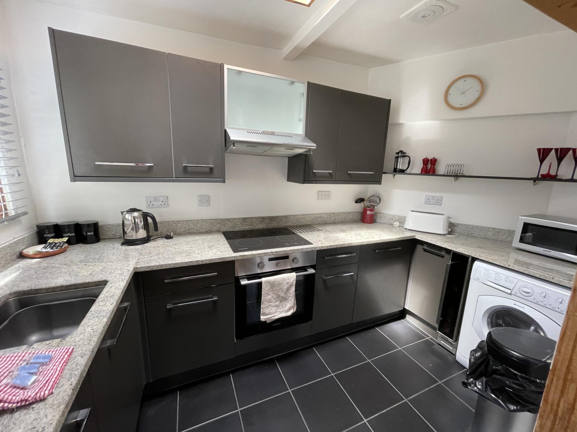 Range of eye and base level units with ample granite worktop surfaces over, 4 ring electric hob with extractor fan over with electric oven under, stainless steel sink unit inset worktop, window to the side, plumbing for washing machine, small wind cooler, plumbing for dishwasher, ample power points