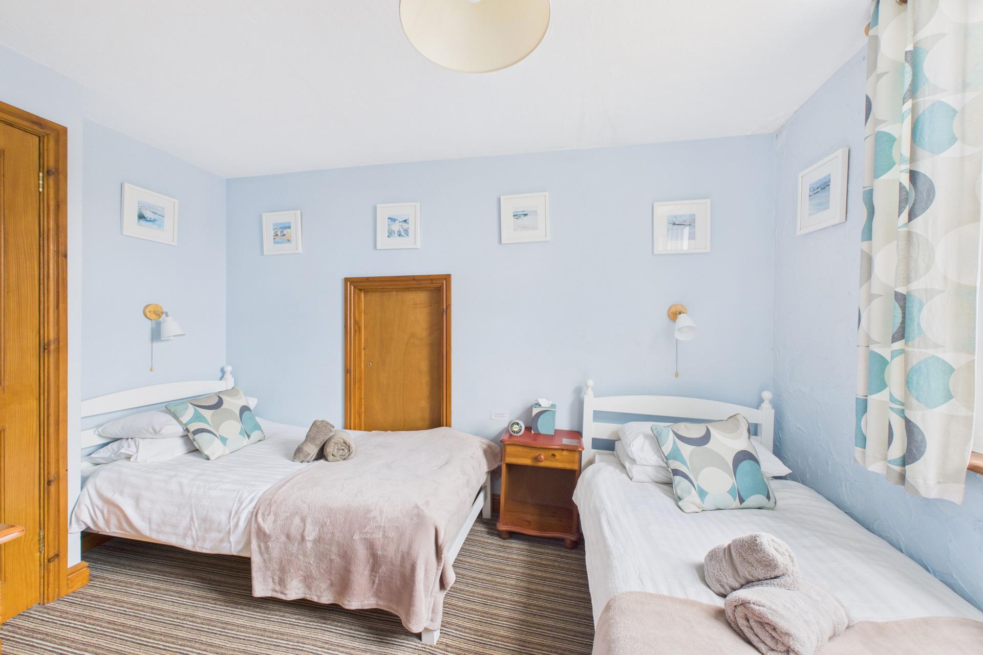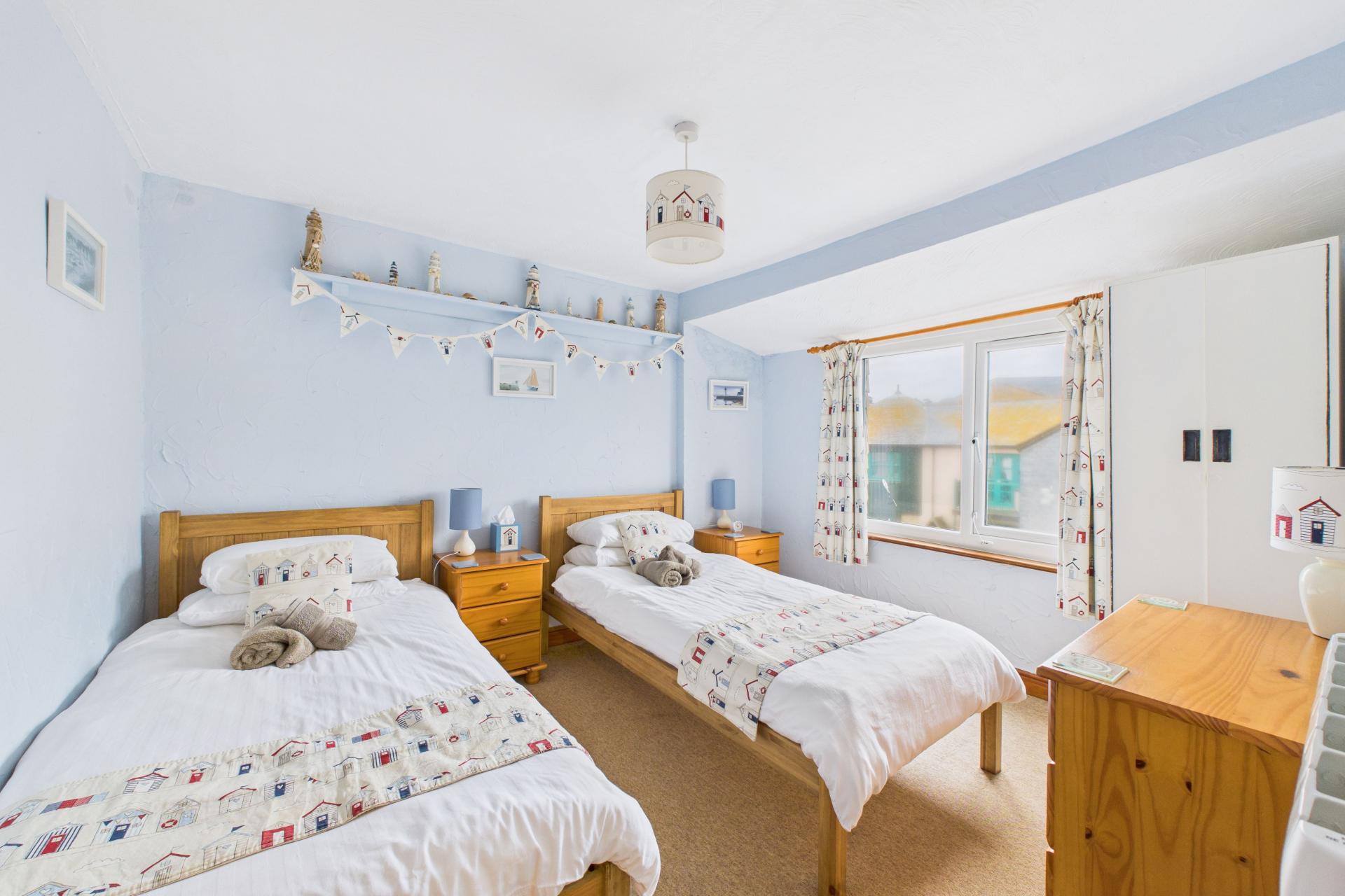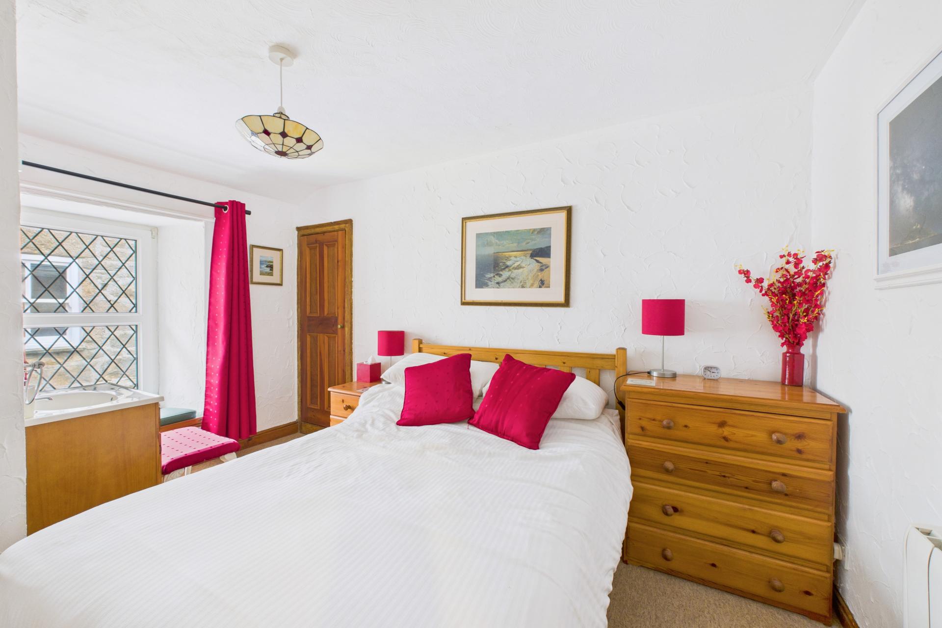 Double glazed dormer window to the rear with a glimpse of the sea, electric wall heater, built in wardrobe and further eaves storage, TV and power points, door to