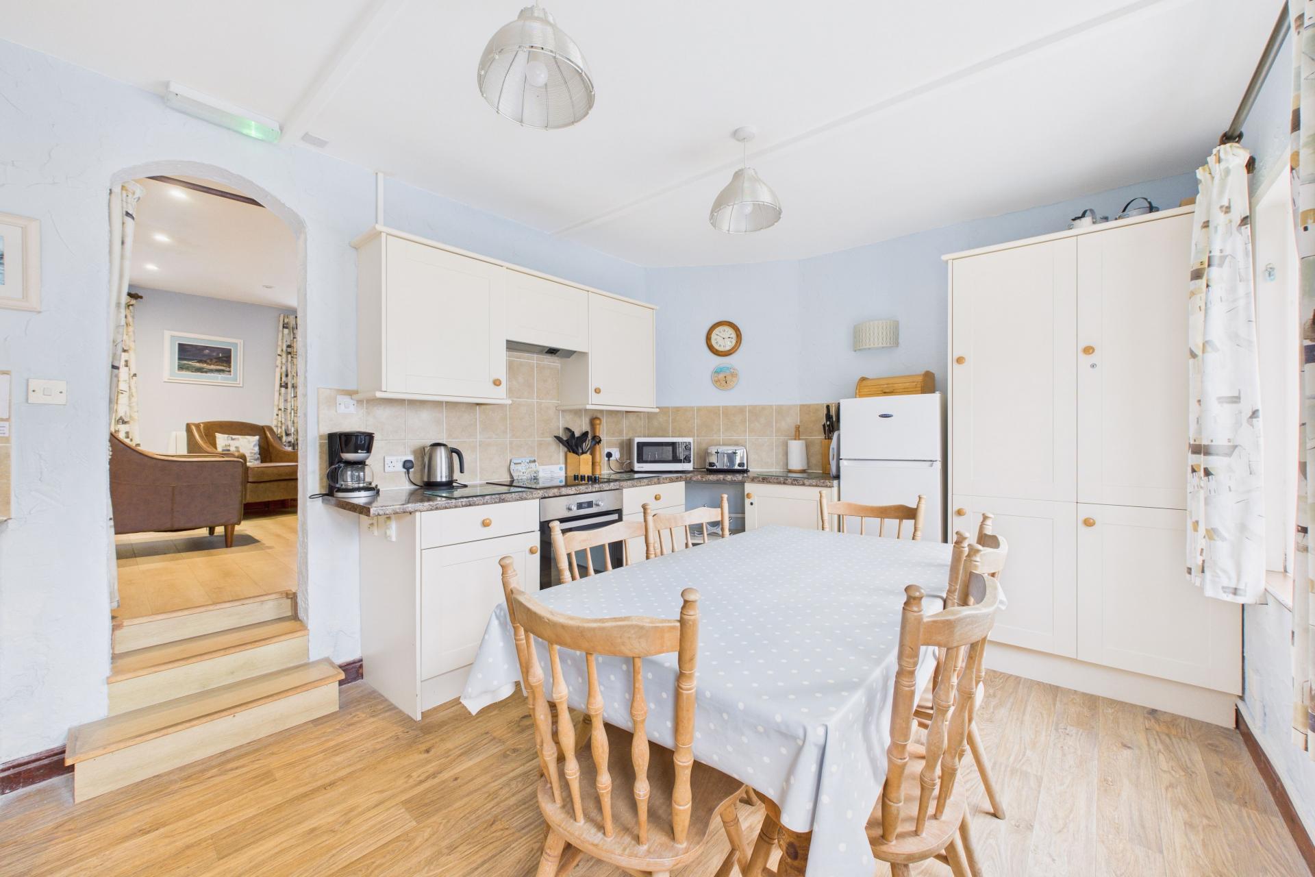 Extensive range of eye and base level units with ample worktop surfaces over, stainless steel sink unit and drainer with taps over, four ring electric hob with electric oven under and extractor fan over, space for fridge / freezer, integrated dishwasher, washer / dryer, power points, electric wall heater, double glazed windows and door out to the rear