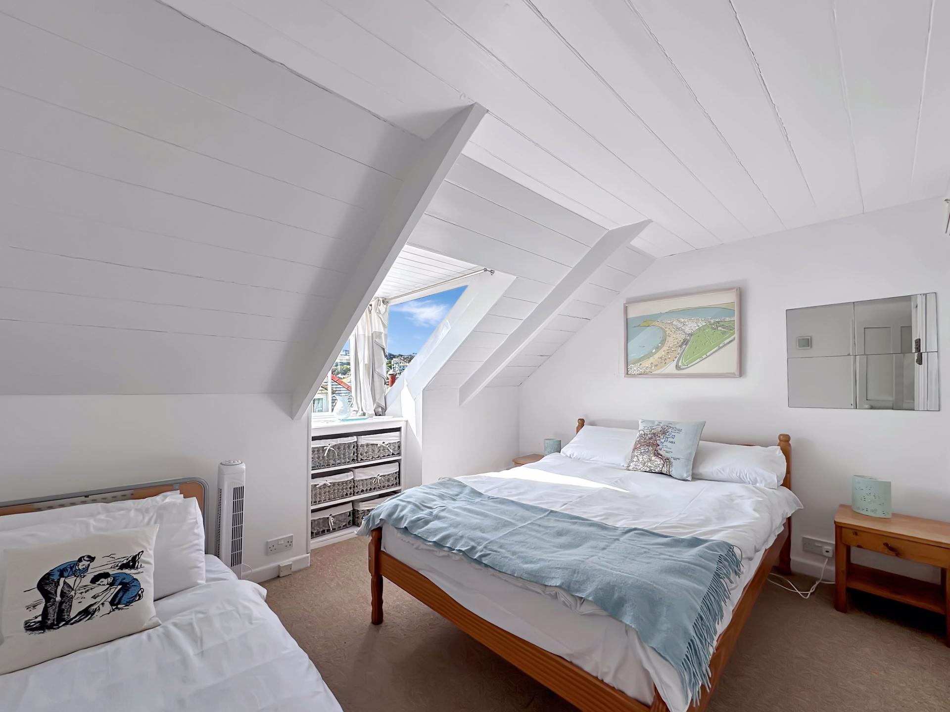 Another lovely light room with dormer window to the front with views of the sea, radiator, power points, built in wardrobe housing hanging space and shelving