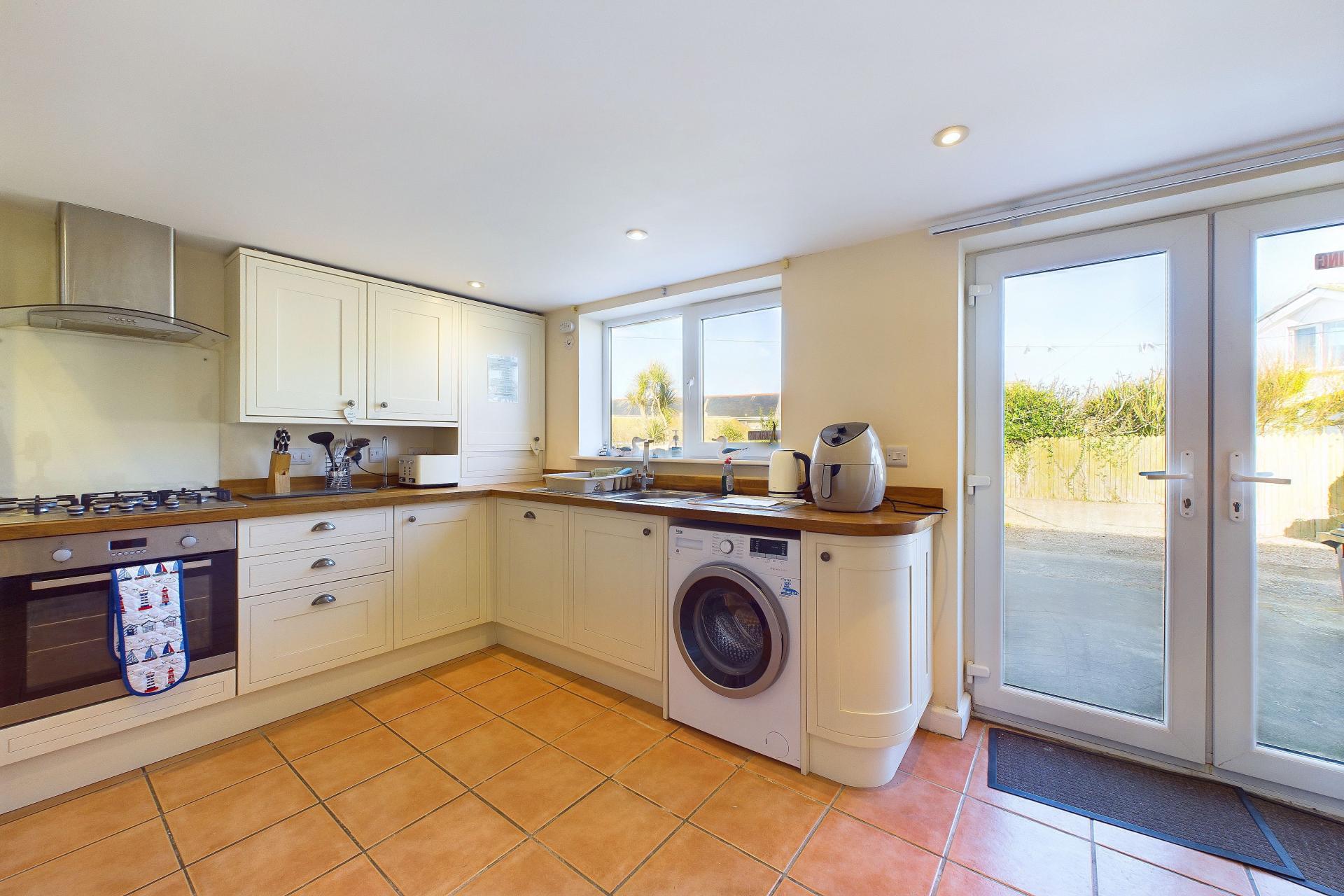 Tiled flooring, extensive range of eye and base level units with ample worktop surfaces over, stainless steel sink unit and drainer with taps over, five ring gas hob with electric oven under and stainless steel extractor fan and hood over, UPVC double glazed windows to the rear and UPVC double glazed double doors opening out to the rear and the properties off road parking spaces. Plumbing for washing machine, integrated dishwasher, space for fridge freezer, corner cupboard housing the boiler, space for large dining table, radiator