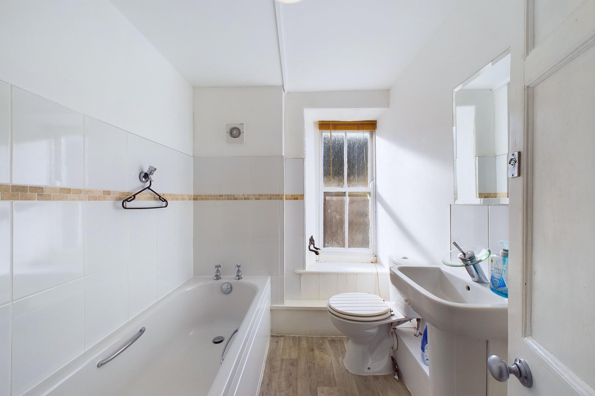Panelled bath, wall hung wash hand basin, close coupled WC, sash window to the front, part tiled walls