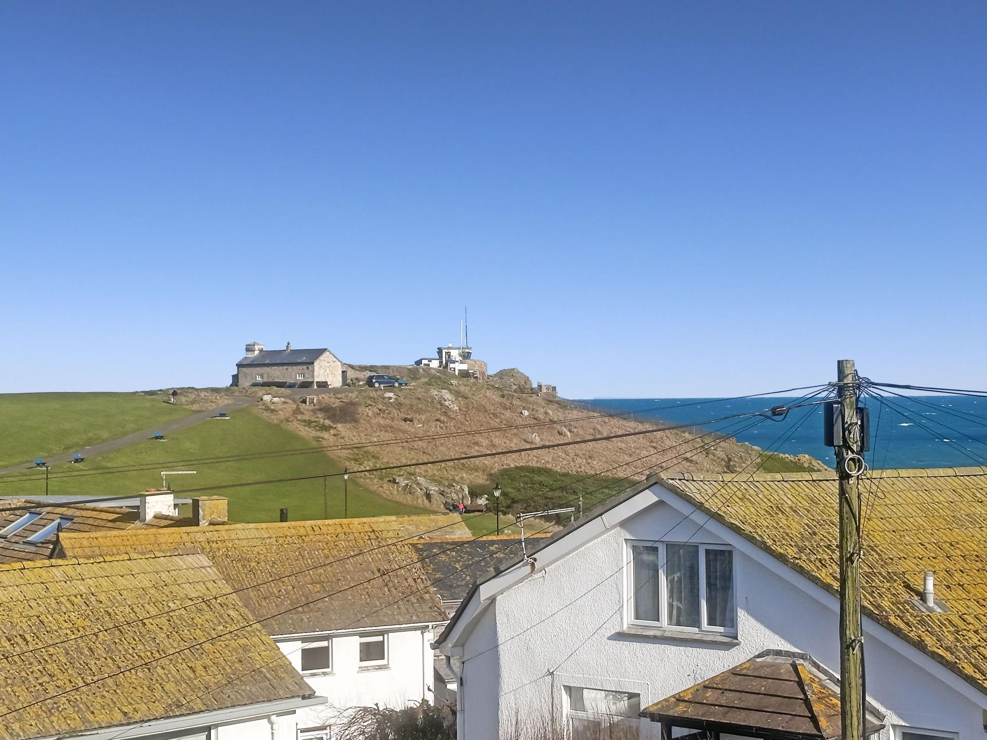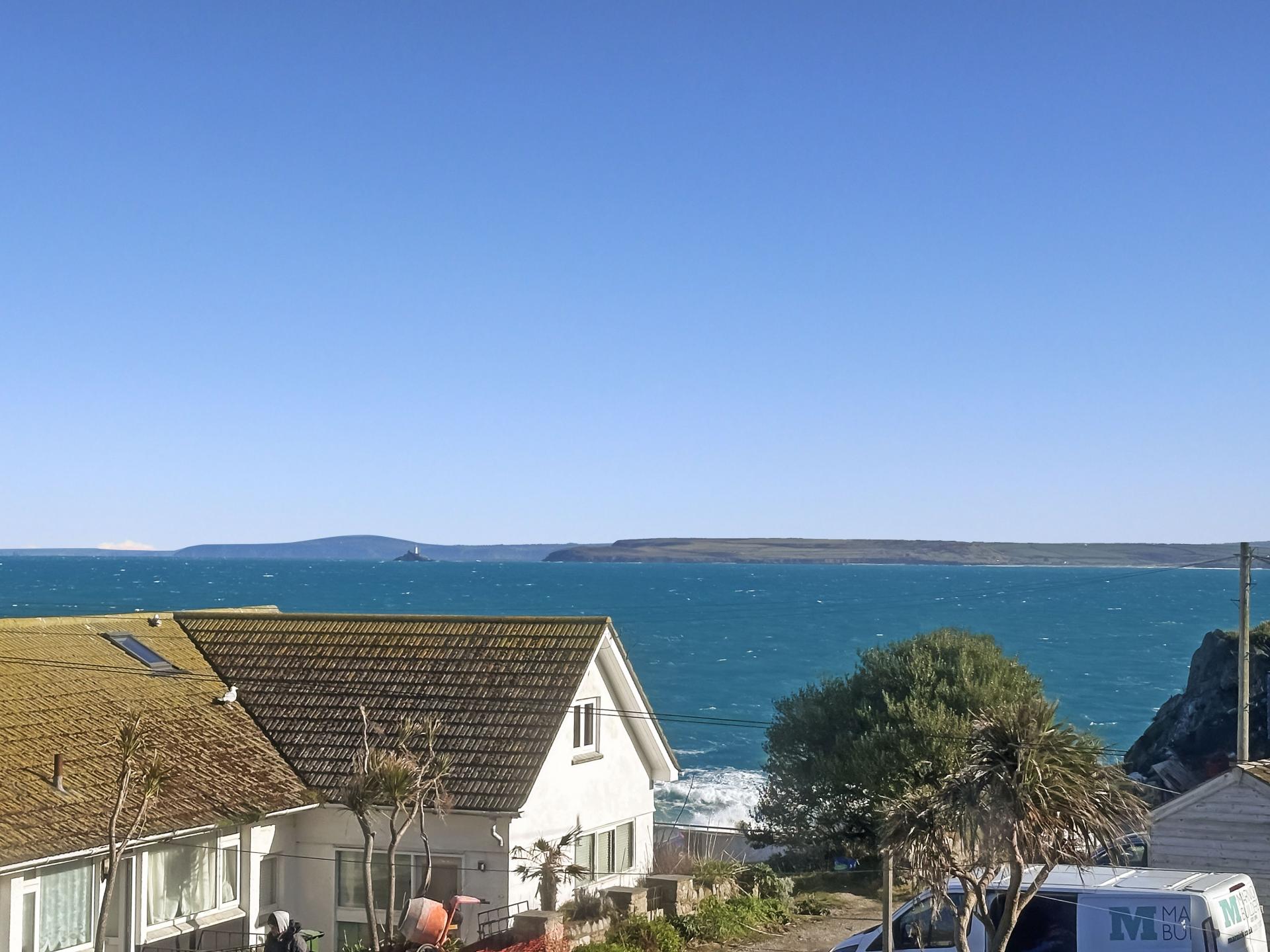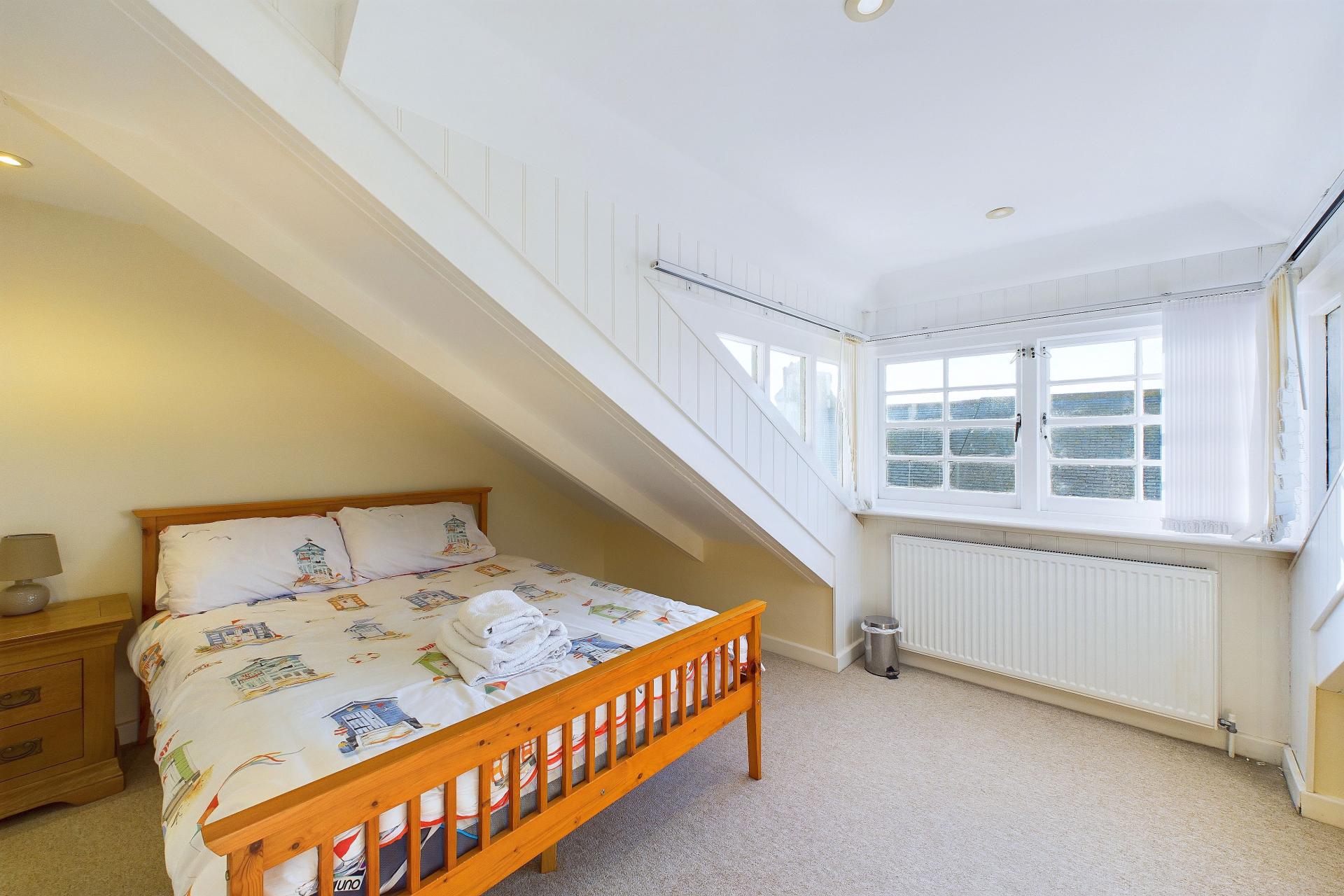 Good double bedroom with pitched eaves, dormer window to the rear with super far reaching views over The Island and over to the surrounding coastline to Porthgwidden into the distance, power points, radiator