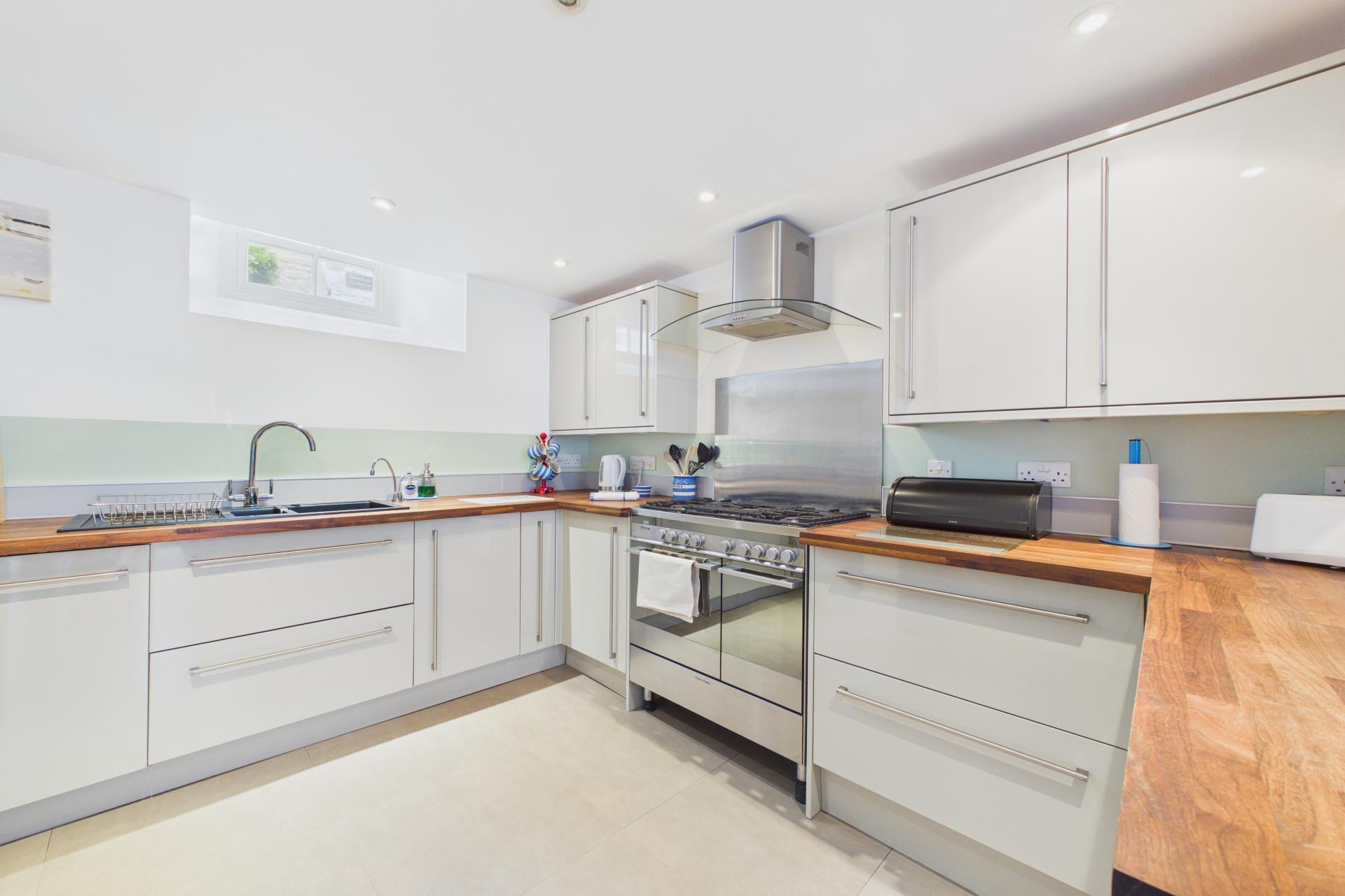 Kitchen comprises an extensive range of eye and base level modern units with ample oak worktop surfaces over, continuation of the tiled flooring, one and a quarter composite sink unit and drainer, large range style gas cooker and five ring hob with glazed and stainless steel hood and fan over integrated dishwasher, space for fridge freezer, ample power points, window to the rear, door to