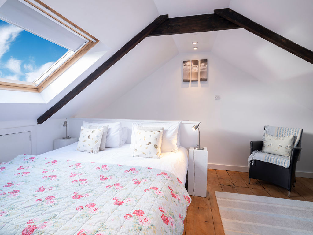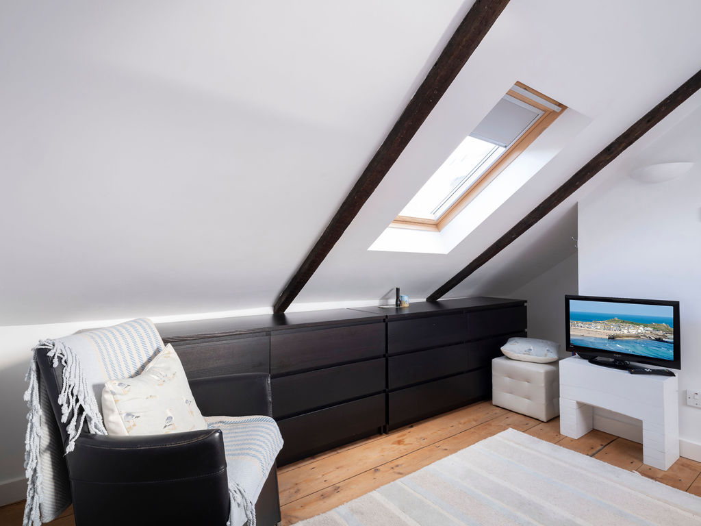 Two Velux skylights, exposed rafters, wood floor, radiator, storage under the eaves, power points, TV point, door to