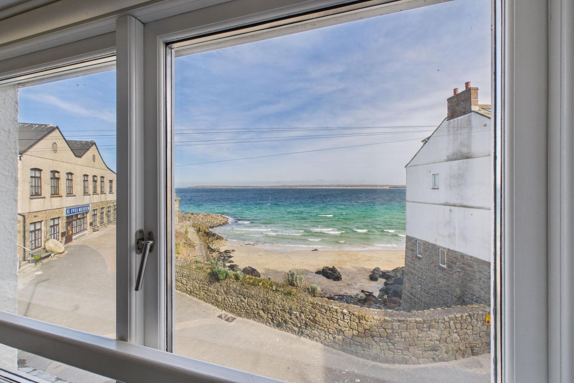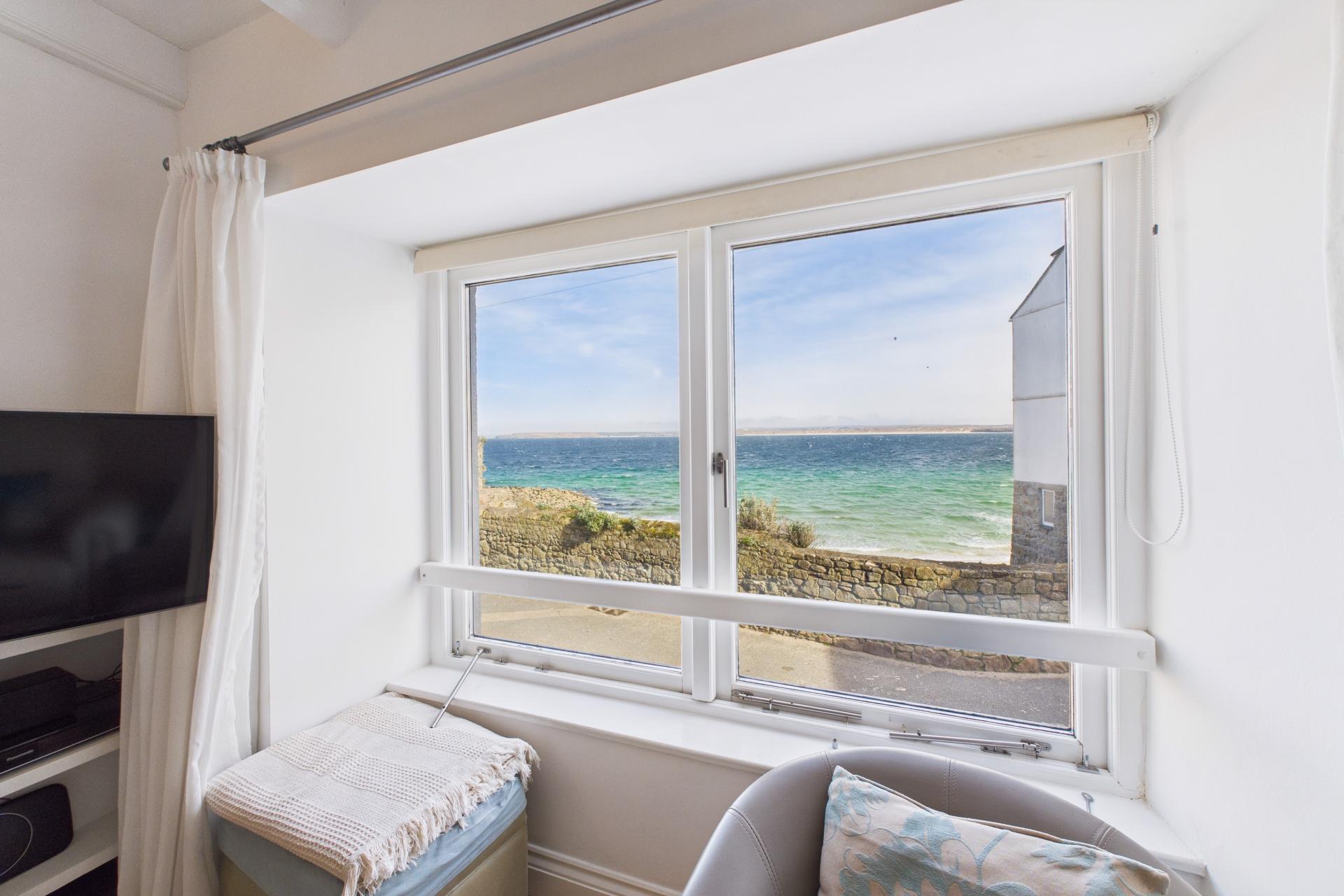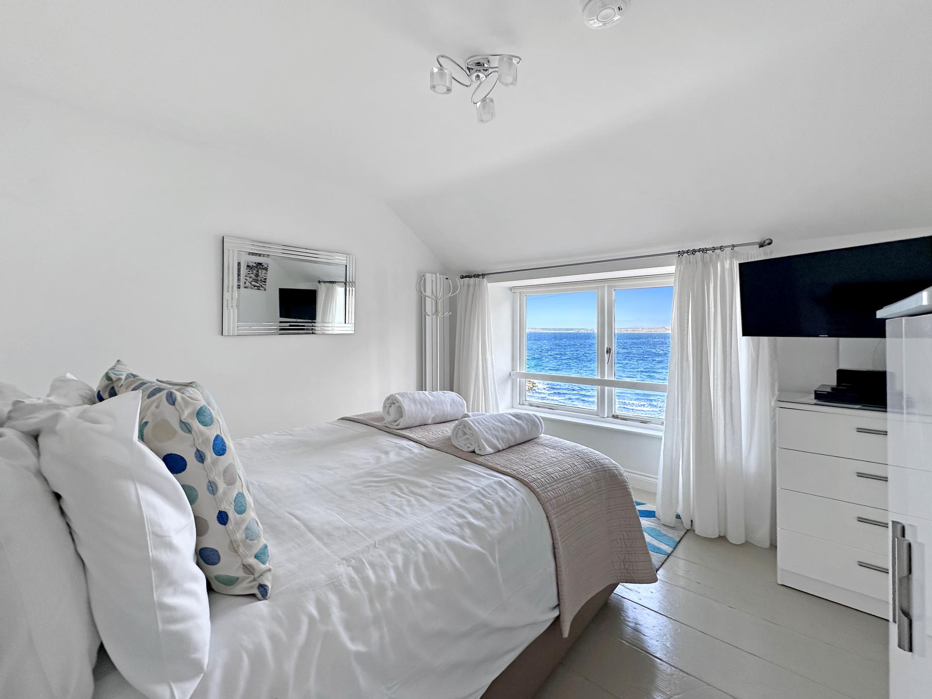 Another beautiful and light space with large fully opening windows to the front offering outstanding views over Bamaluz Beach, the sea and the North Cornish coastline up to Godrevy Lighthouse. Continuation of the oak flooring, ample power points, fireplace with working multi fuel burner inset, radiator, TV point and recess with shelving, door down to bedroom
