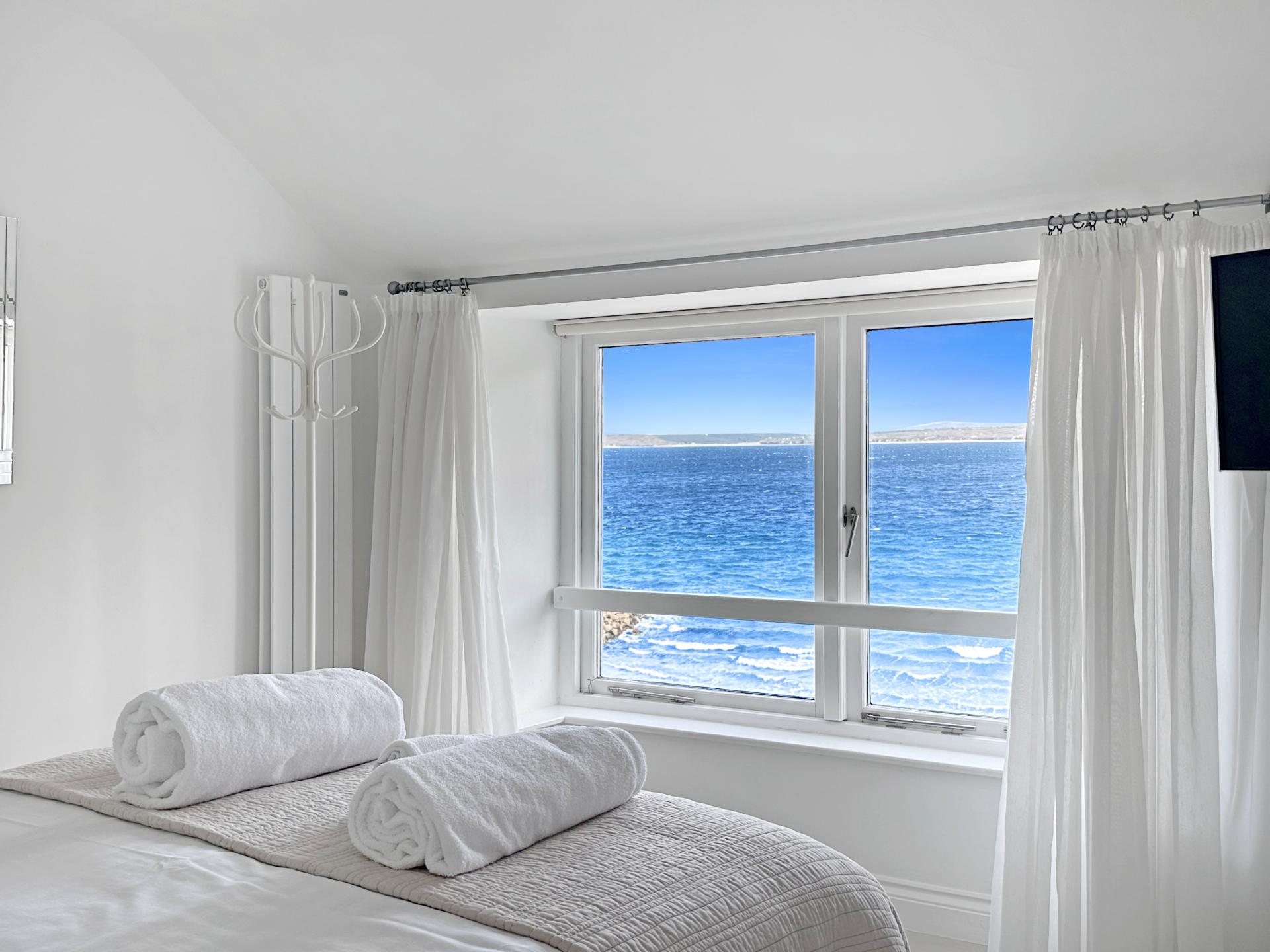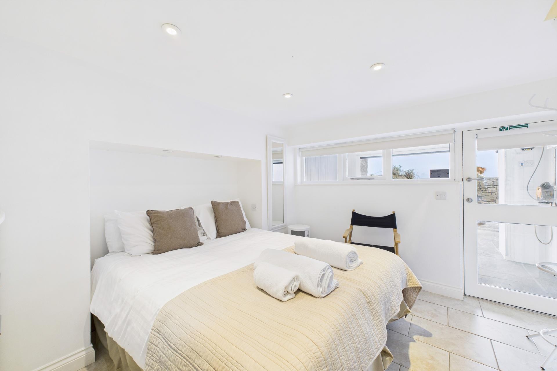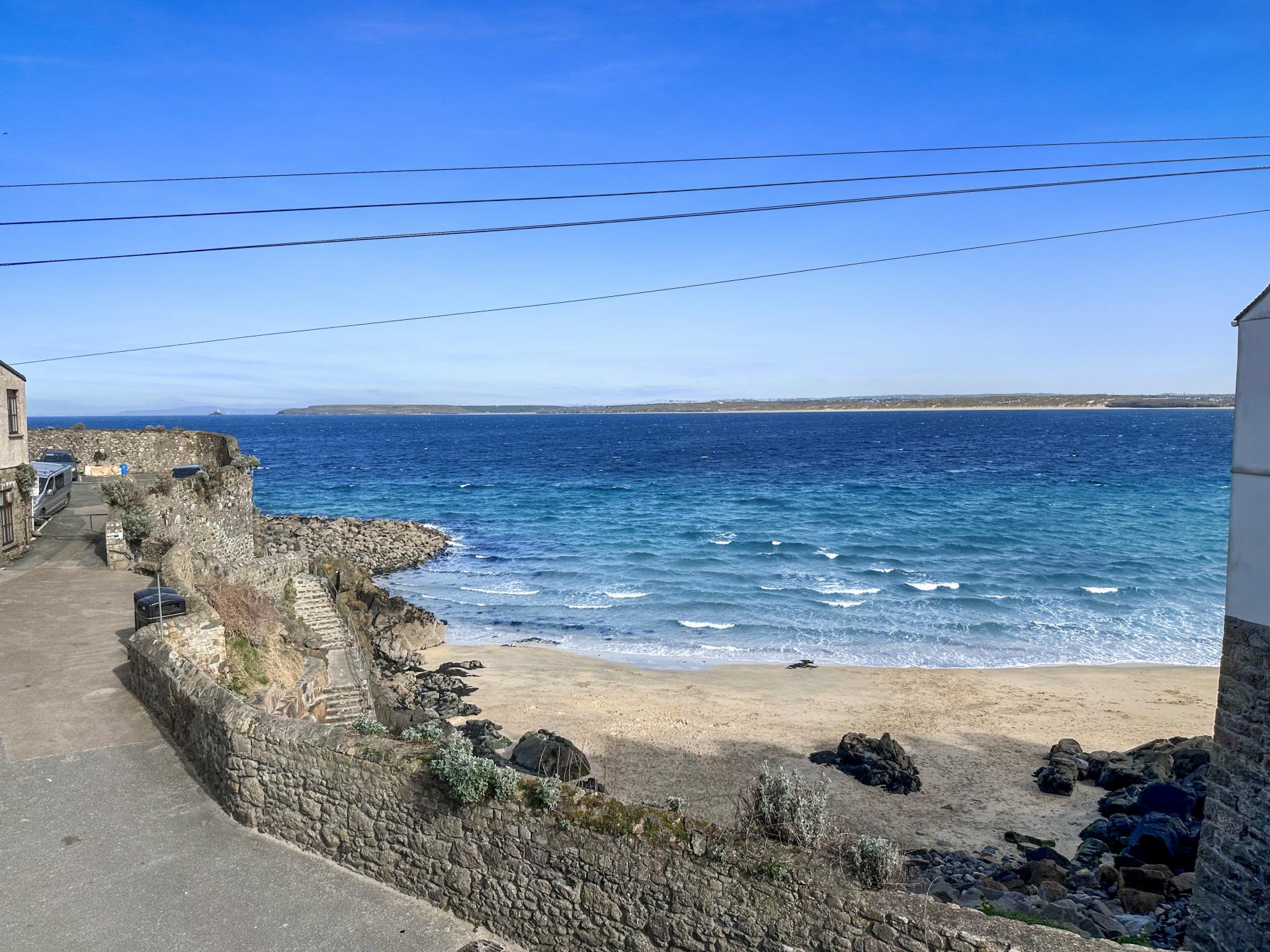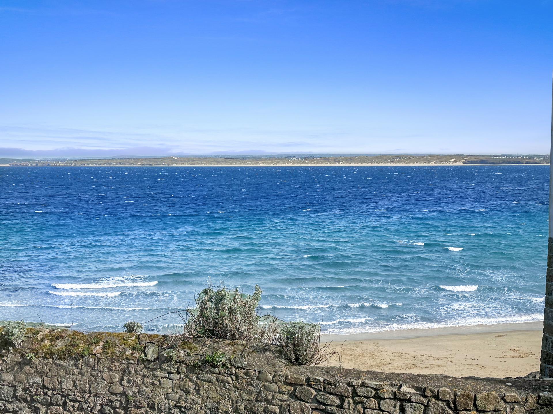 Another beautiful and light space with large fully opening windows to the front offering outstanding views over Bamaluz Beach, the sea and the North Cornish coastline up to Godrevy Lighthouse. Continuation of the oak flooring, ample power points, fireplace with working multi fuel burner inset, radiator, TV point and recess with shelving, door down to bedroom