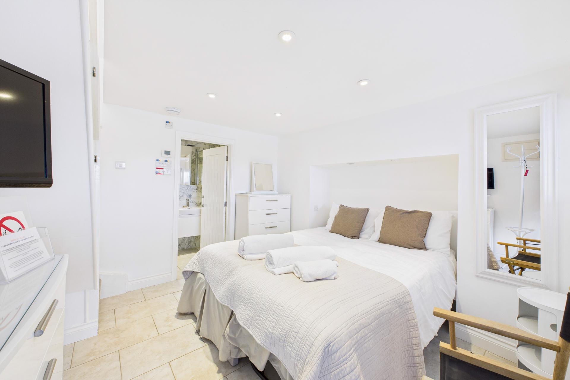 Great sized bedroom with tiled flooring, window and door leading out to the front and into the parking space / storage area, power points, radiator, door to en-suite, underfloor heating