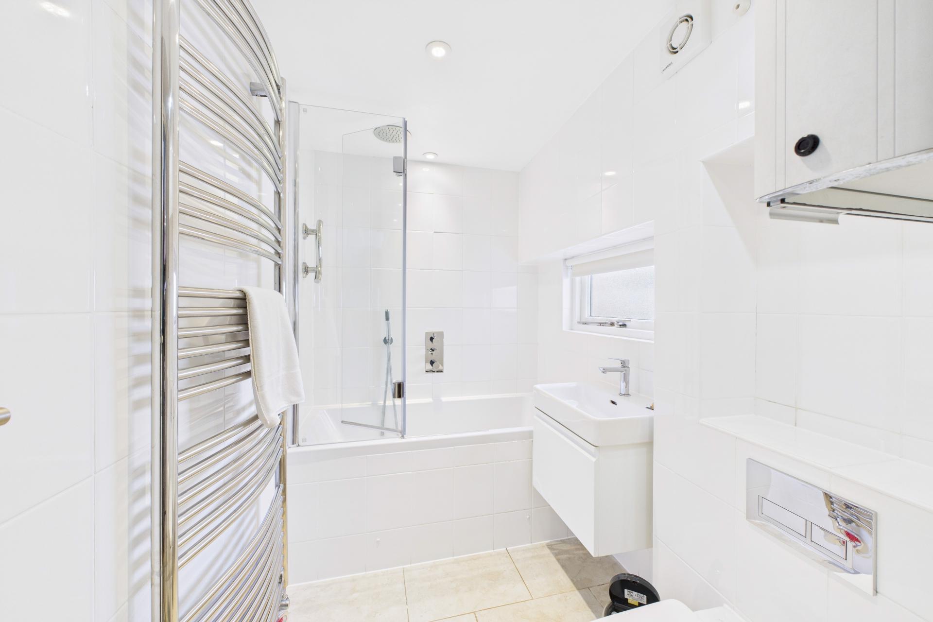 Tiled flooring, plumbing for washing machine and space for dryer, stainless steel heated towel rail, wall mounted ceramic sink unit with storage drawers under, close coupled WC, large walk in shower cubicle with mains connected shower offering rainfall head and detachable handheld shower, underfloor heating
