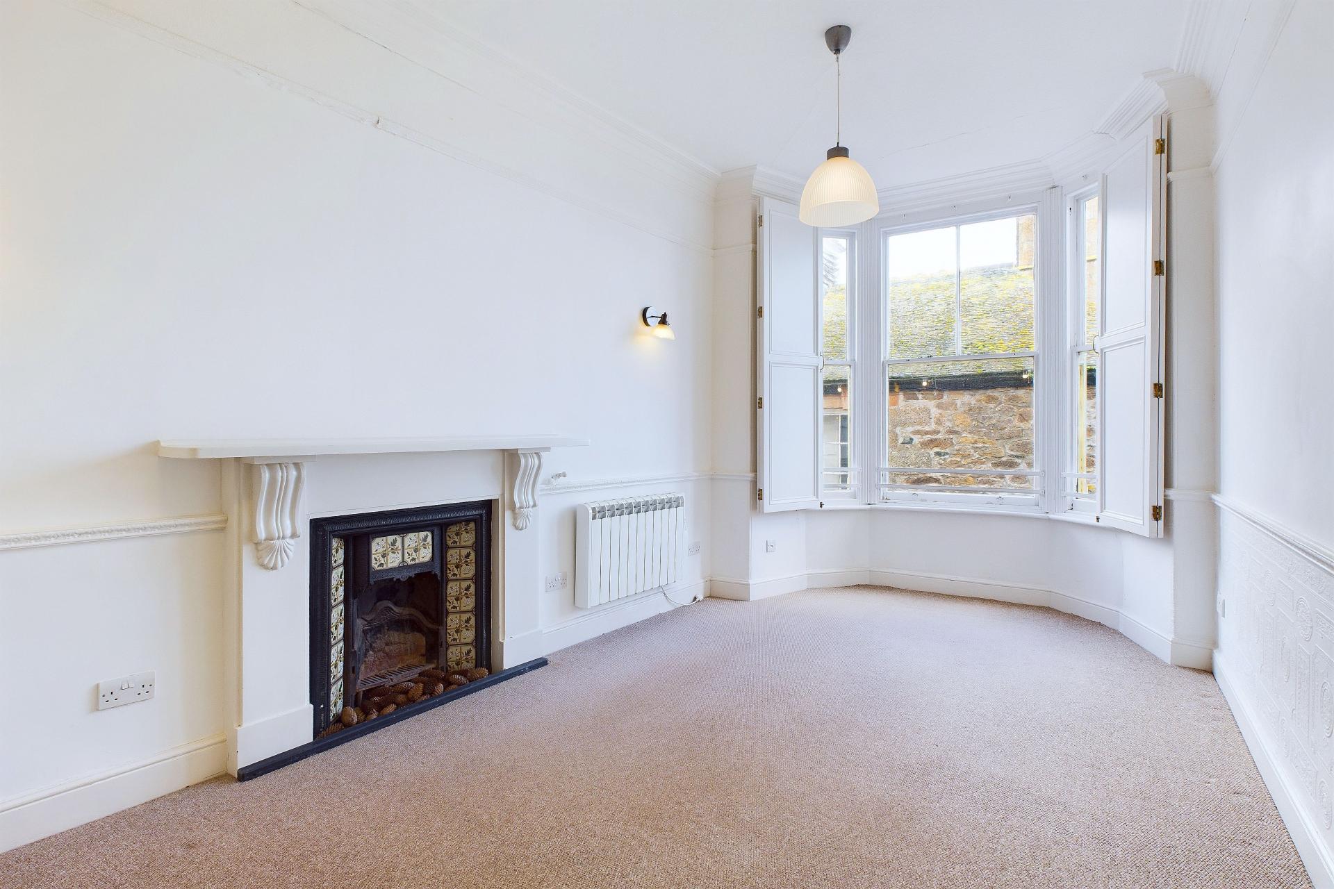 Another well proportioned room with bay window to the front with window shutters offering the same interesting views over Market Place towards the Parish Church and gardens over to the sea, cornice ceiling, Dimplex economy 7 night storage heater, built in wardrobes housing hanging space and shelving, power points, wood surround fireplace with tiled fireplace inset, fitted wall lights and 2 central lights, carpeted