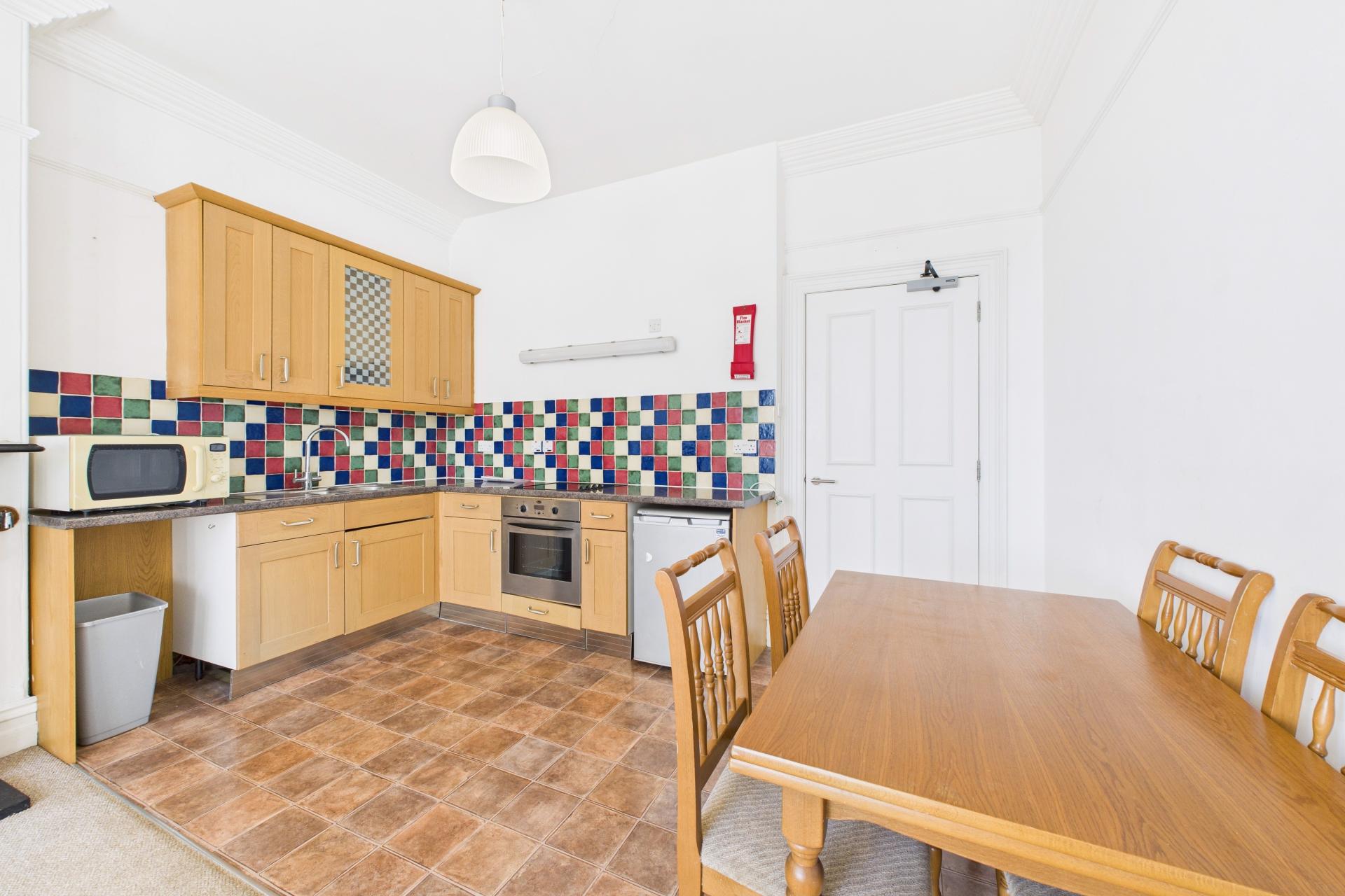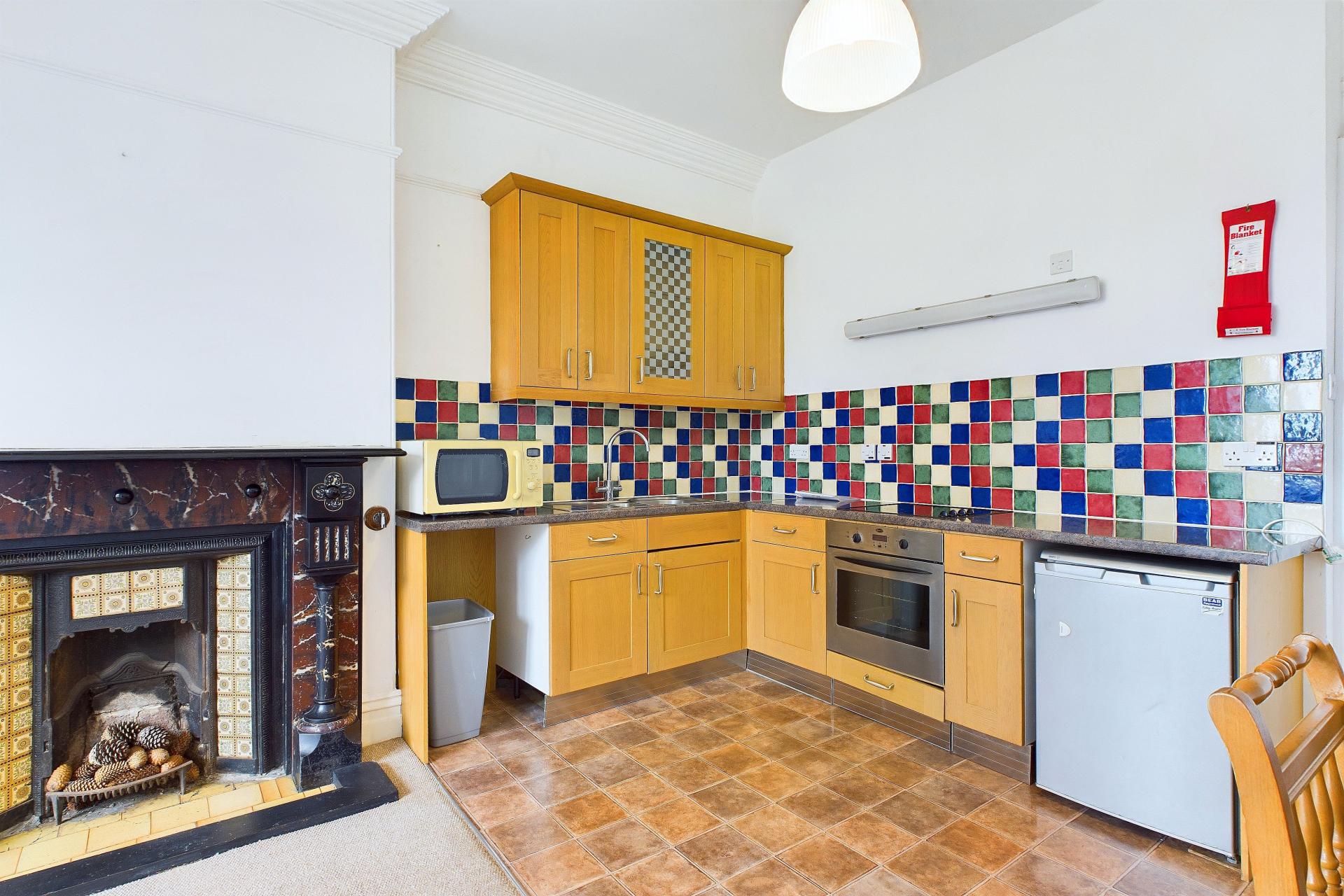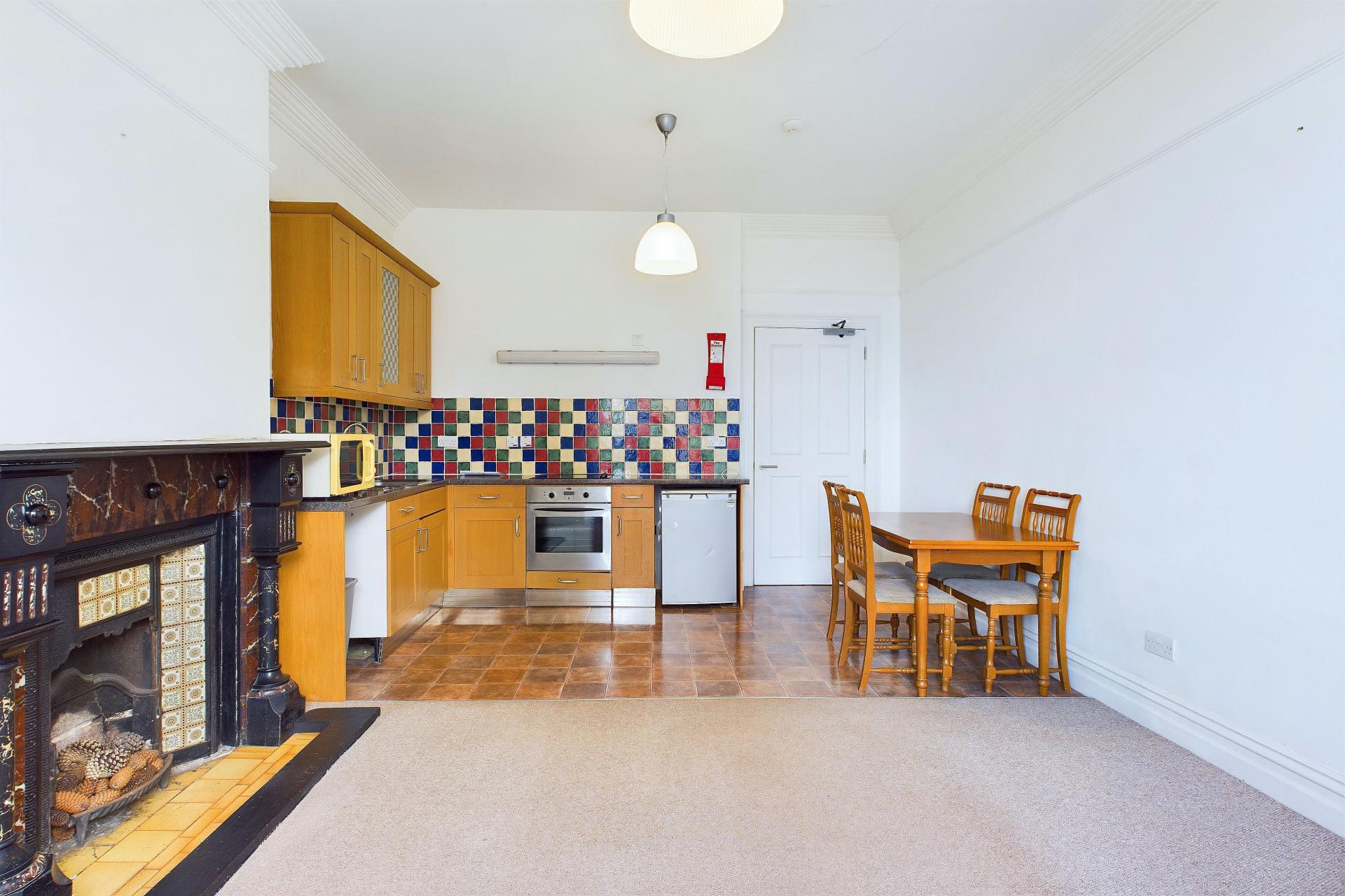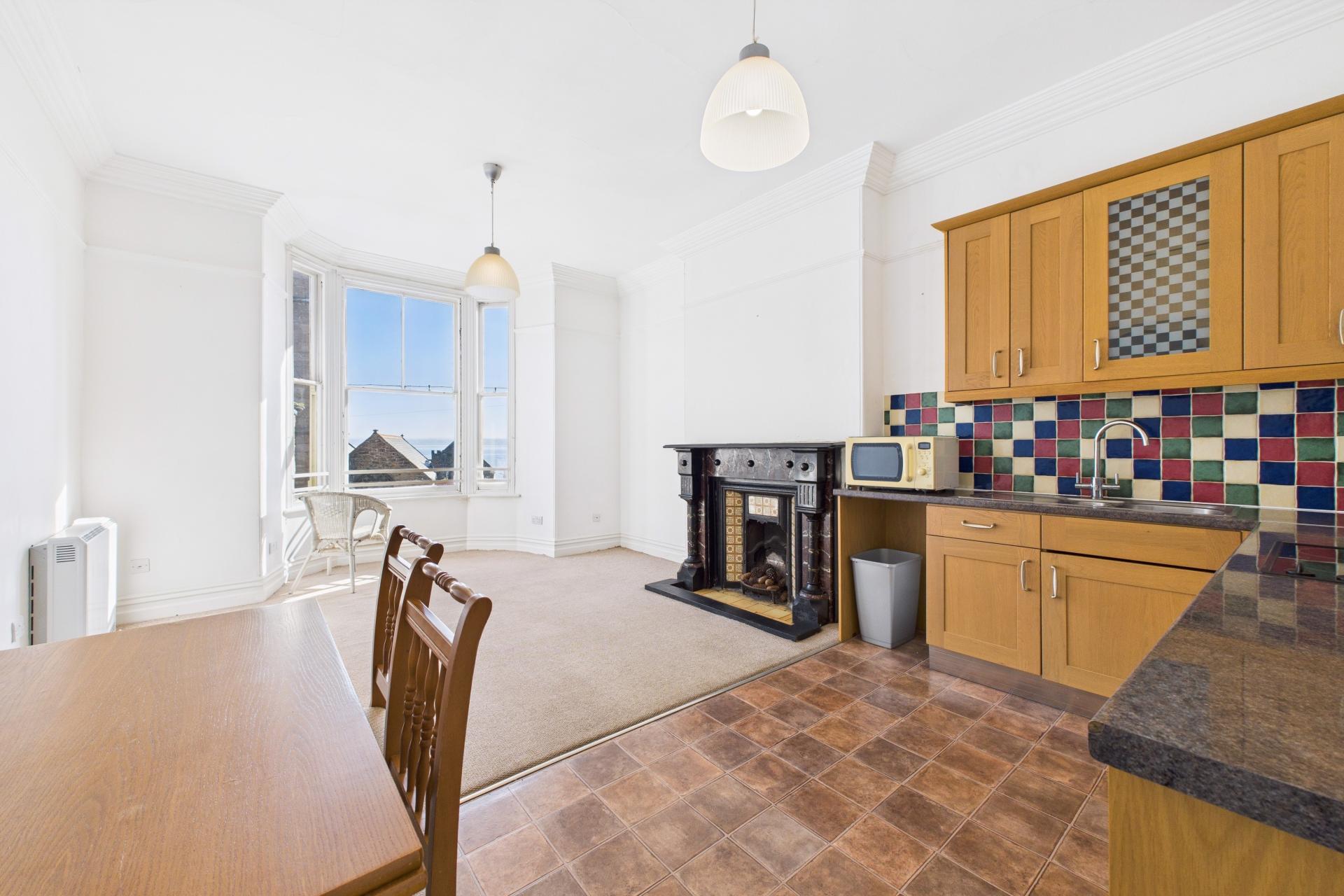 Splendid room with large bay window offering interesting views over Market Place, The Memorial Gardens and over towards the sea taking in the Parish Church and gardens. Dimplex economy 7 night storage heater, feature marble fireplace and tiled inset, carpeted. Kitchen area comprises a range of eye and base level units with ample worktop space over, four ring electric hob with electric oven under, space for dishwasher / washing machine, space for fridge and room for a larger fridge freezer. Stainless steel sink unit and drainer with taps over, complimentary tiling, power points, 2 central lights within the room, vinyl flooring