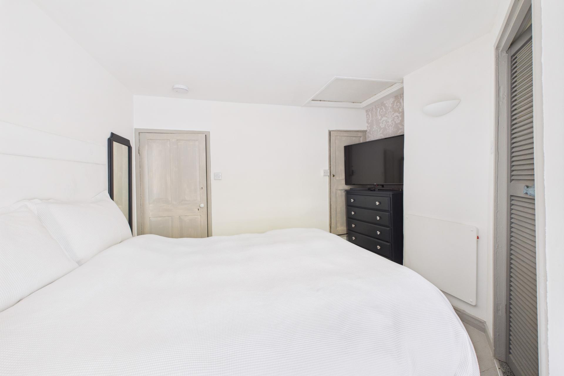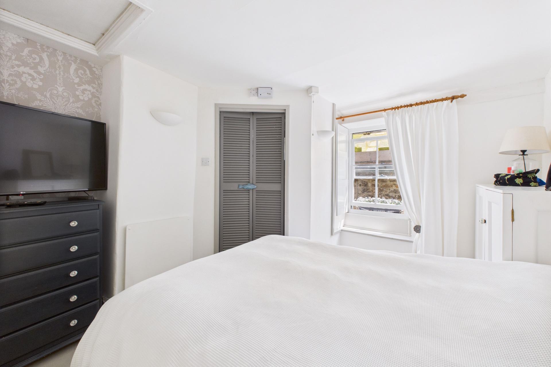Good sized bedroom with multi pane sash window to the front with window seat, white painted exposed floor boards, electric wall heated, TV point, power points, storage cupboard over the stairs, Louvre doors into