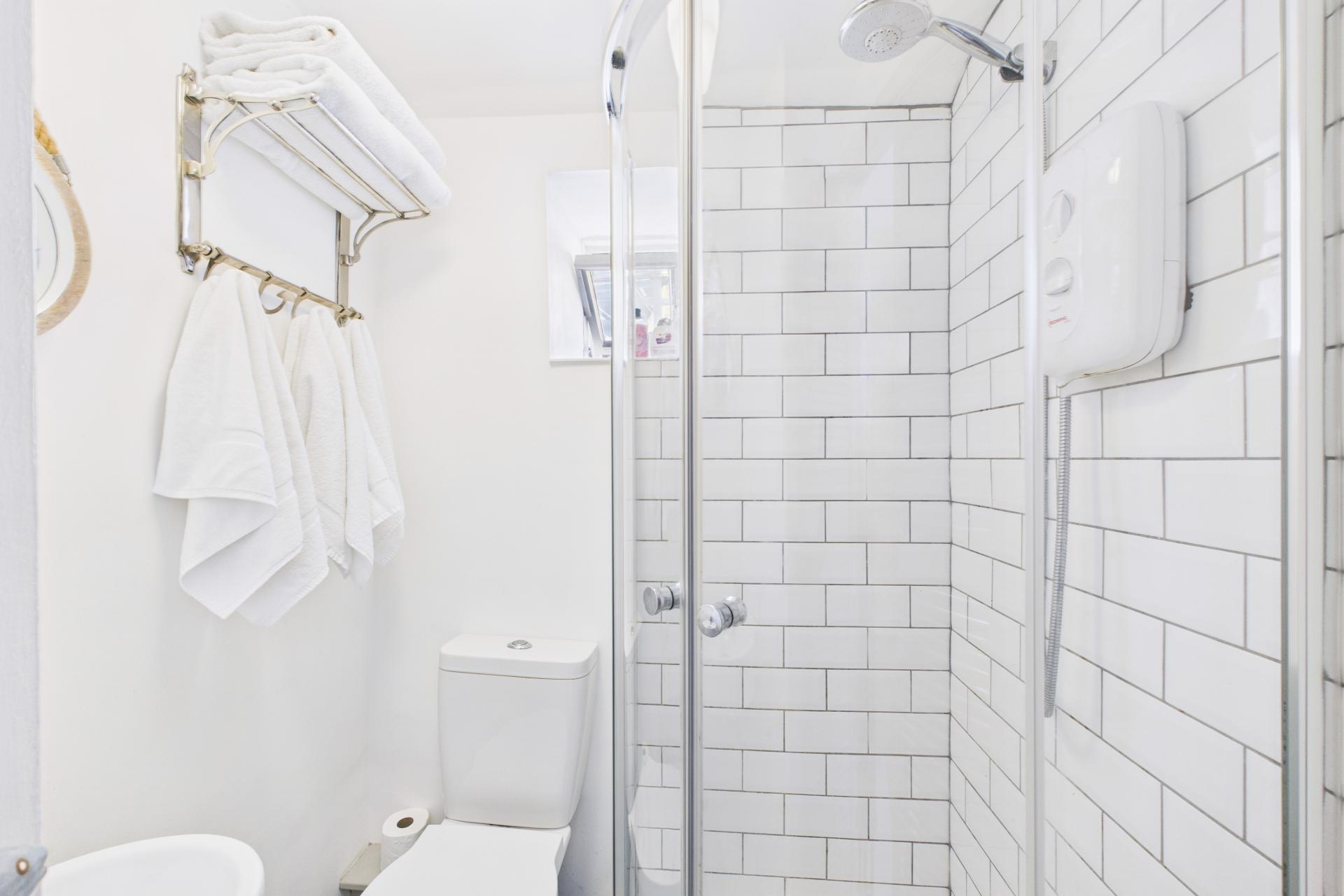 Walk in shower cubicle with electric shower and tiled inset, close coupled WC, corner wash hand basin, small window to the front