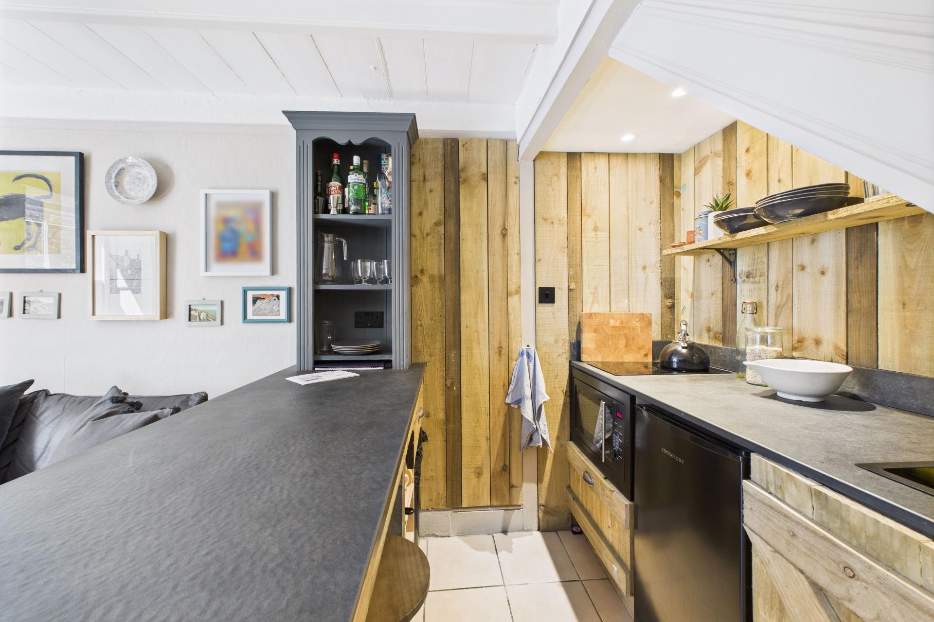 Beautiful room with tiled flooring, multi pane sash window the front with window seat and shutters, beamed ceilings, electric wall heater, power points, space and point for wall mounted TV, stairs to first floor. Kitchen: Bespoke hand crafted kitchen with base level units and slate worktop surfaces, breakfast bar area with further slate worktop, composite inset sink unit and drainer, two ring electric hob with electric oven under space for fridge, wood panel walls, power points, small cupboard under the stairs