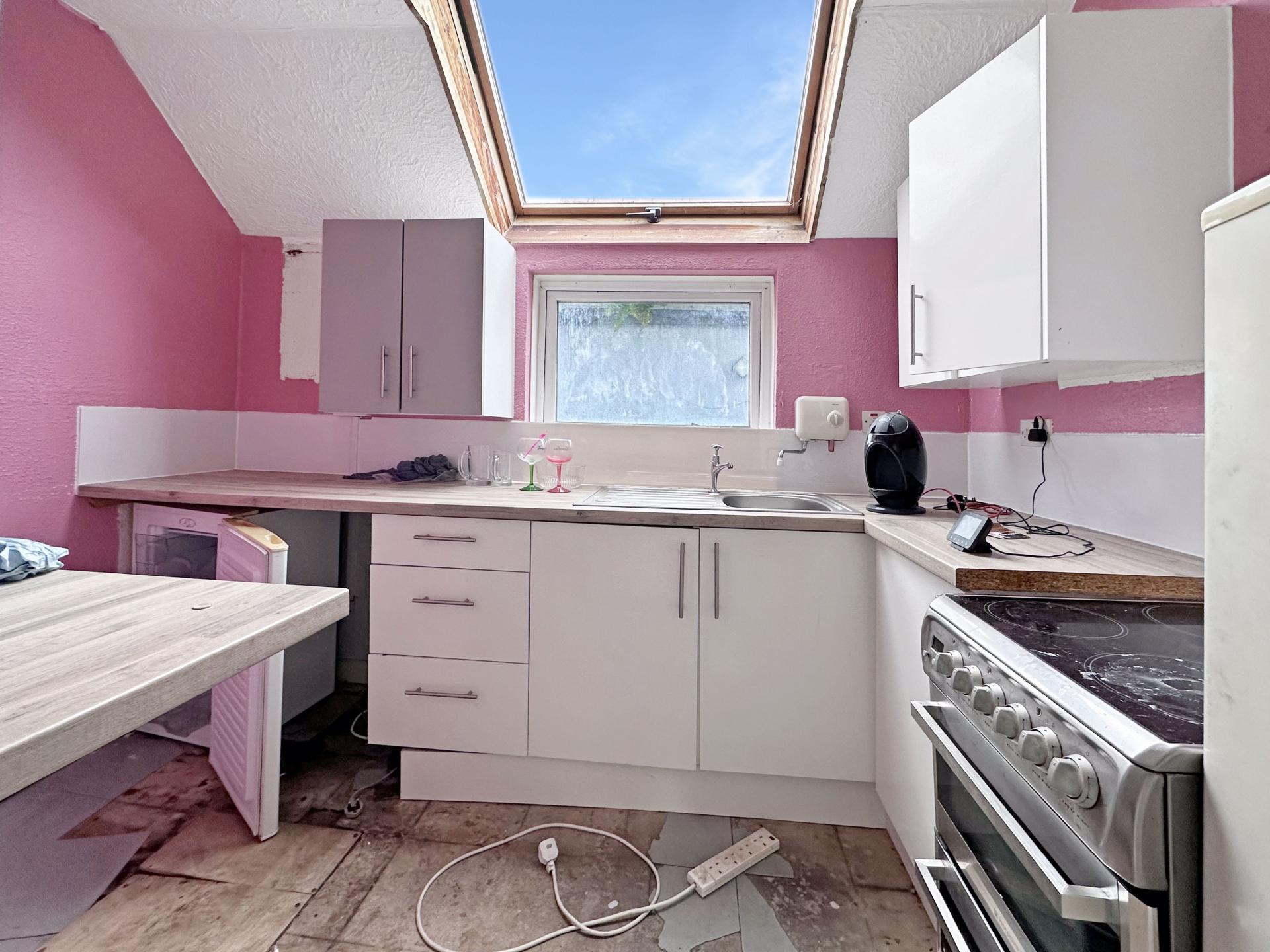 Skylight, range of base level and eye level units, space for fridge and cooker, power points, window to the rear