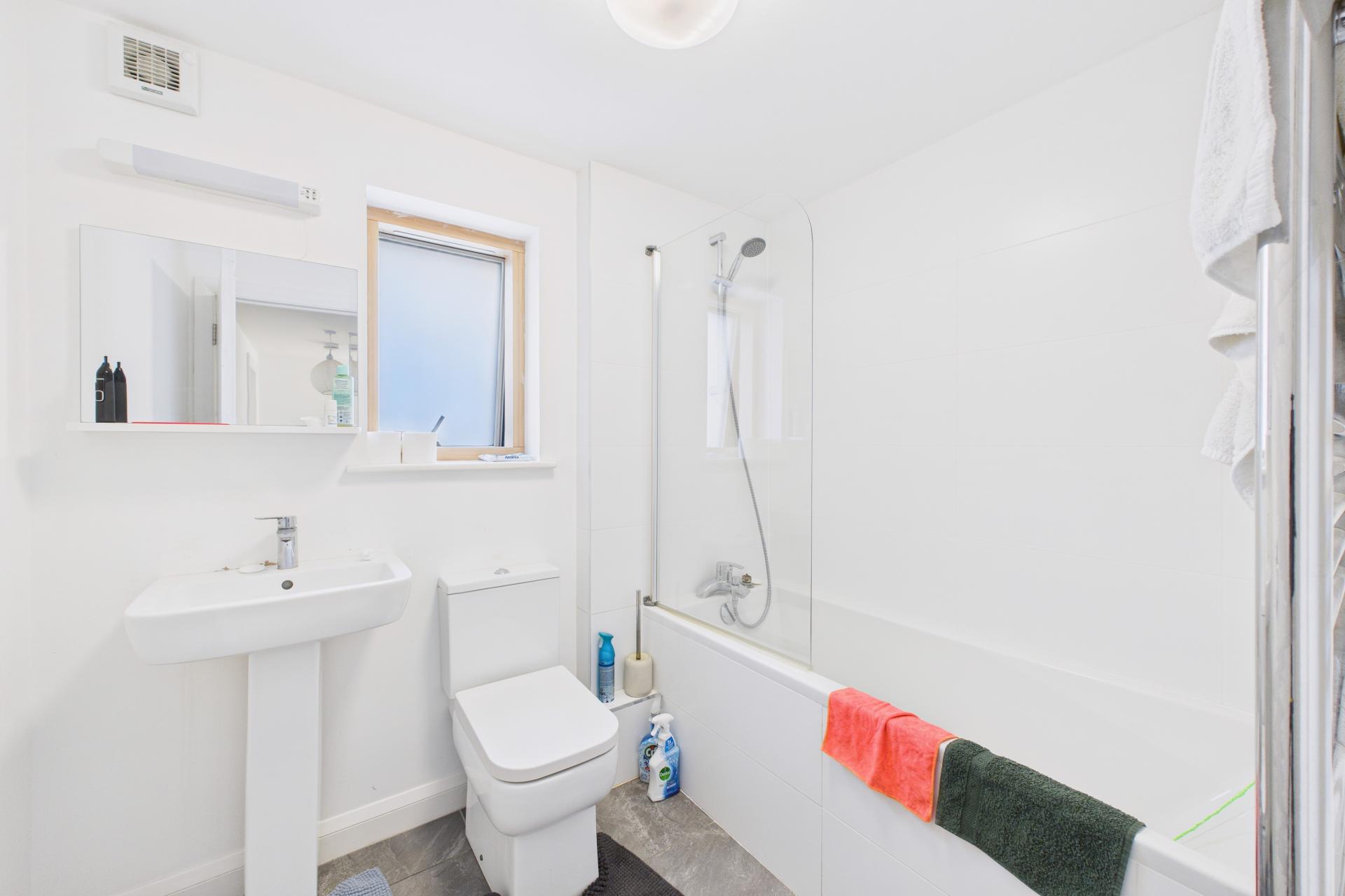 Opaque window to the front, pedestal wash hand basin, close coupled WC, panelled bath with shower screen and shower attachment shower over , stainless steel heated towel rail