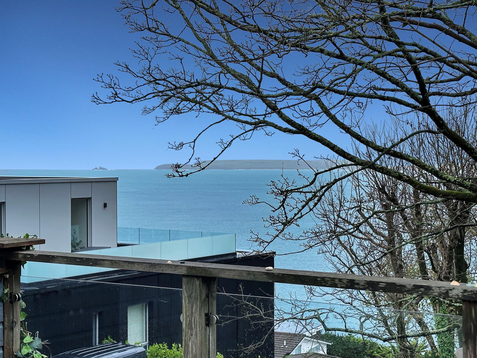 Lovely large balcony offering fine sea views, wood balustrade with glazed inserts
