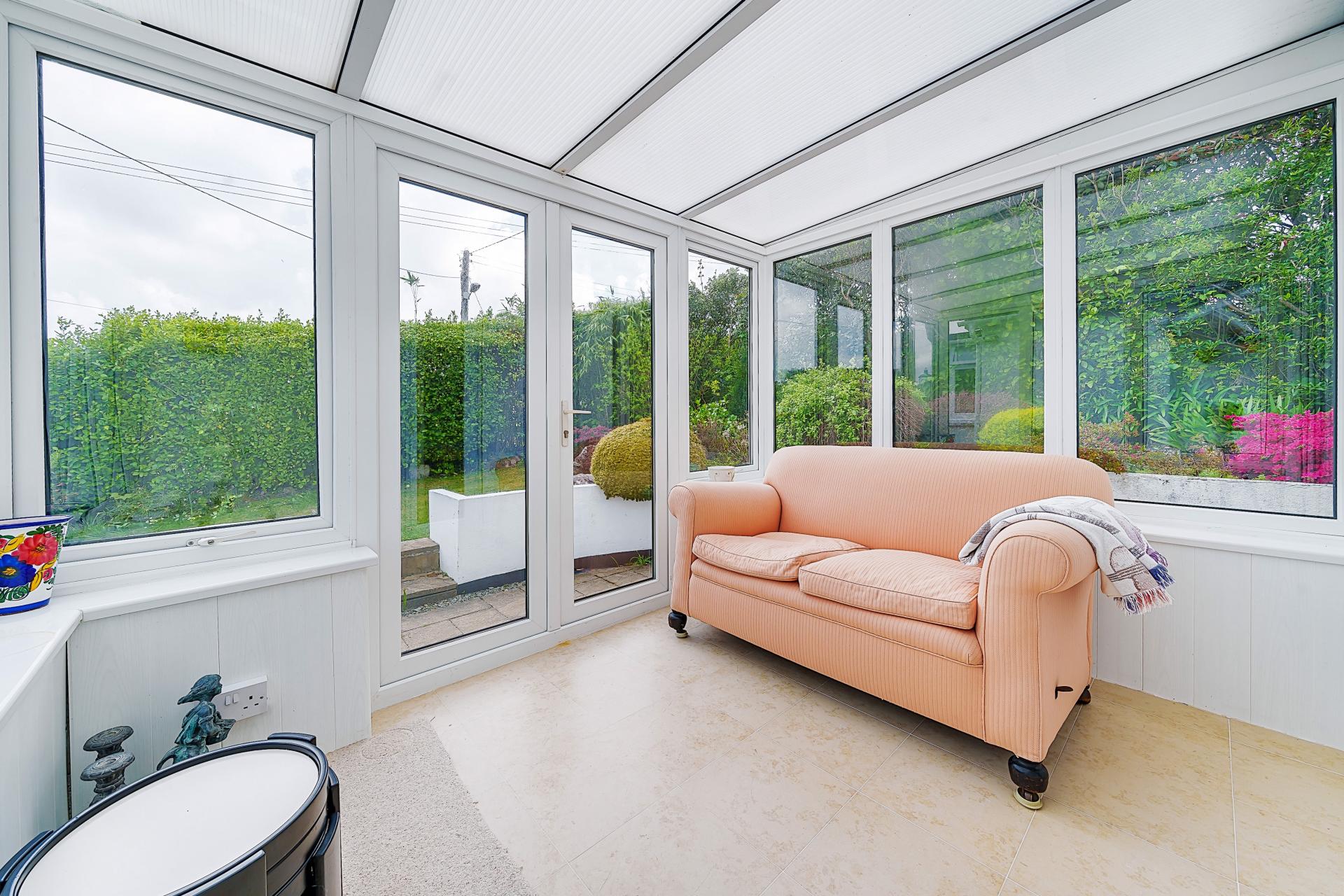 Polycarbonate roofing, glazing to 3 sides, double doors opening out to the enclosed front gardens, power points