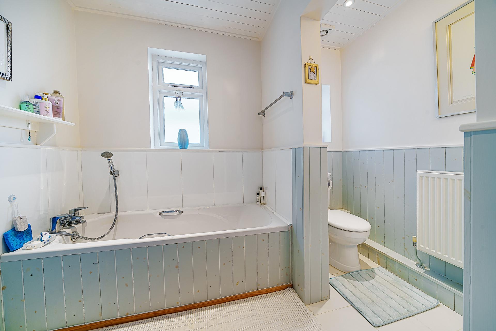Tiled flooring, panelled bath, window to the side, heated towel rail, built in airing cupboard. Part separation to the close coupled WC and wash hand basin inset small vanity unit with further window to the side, radiator