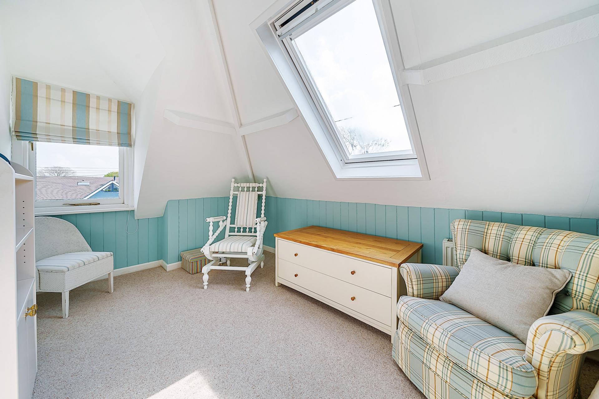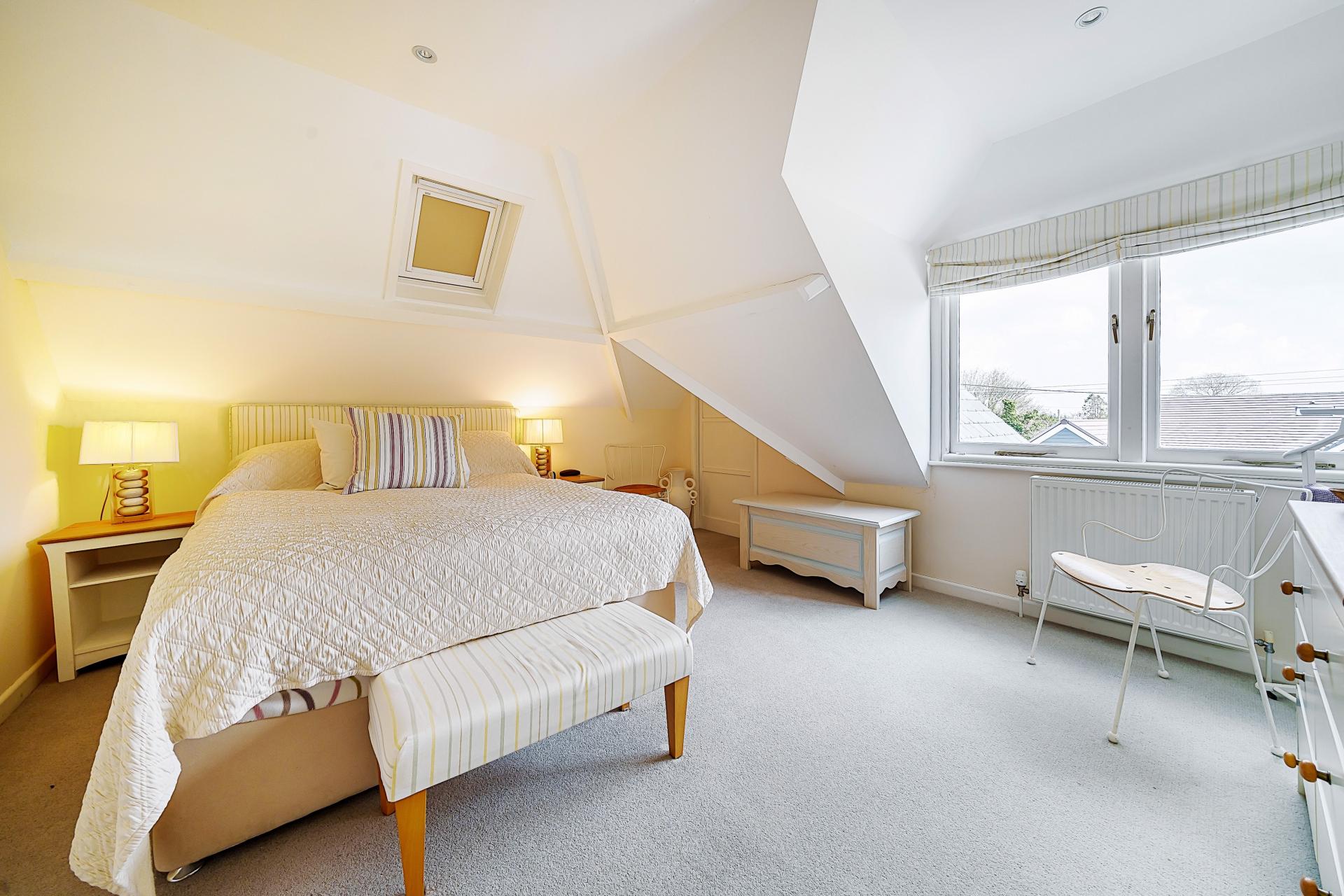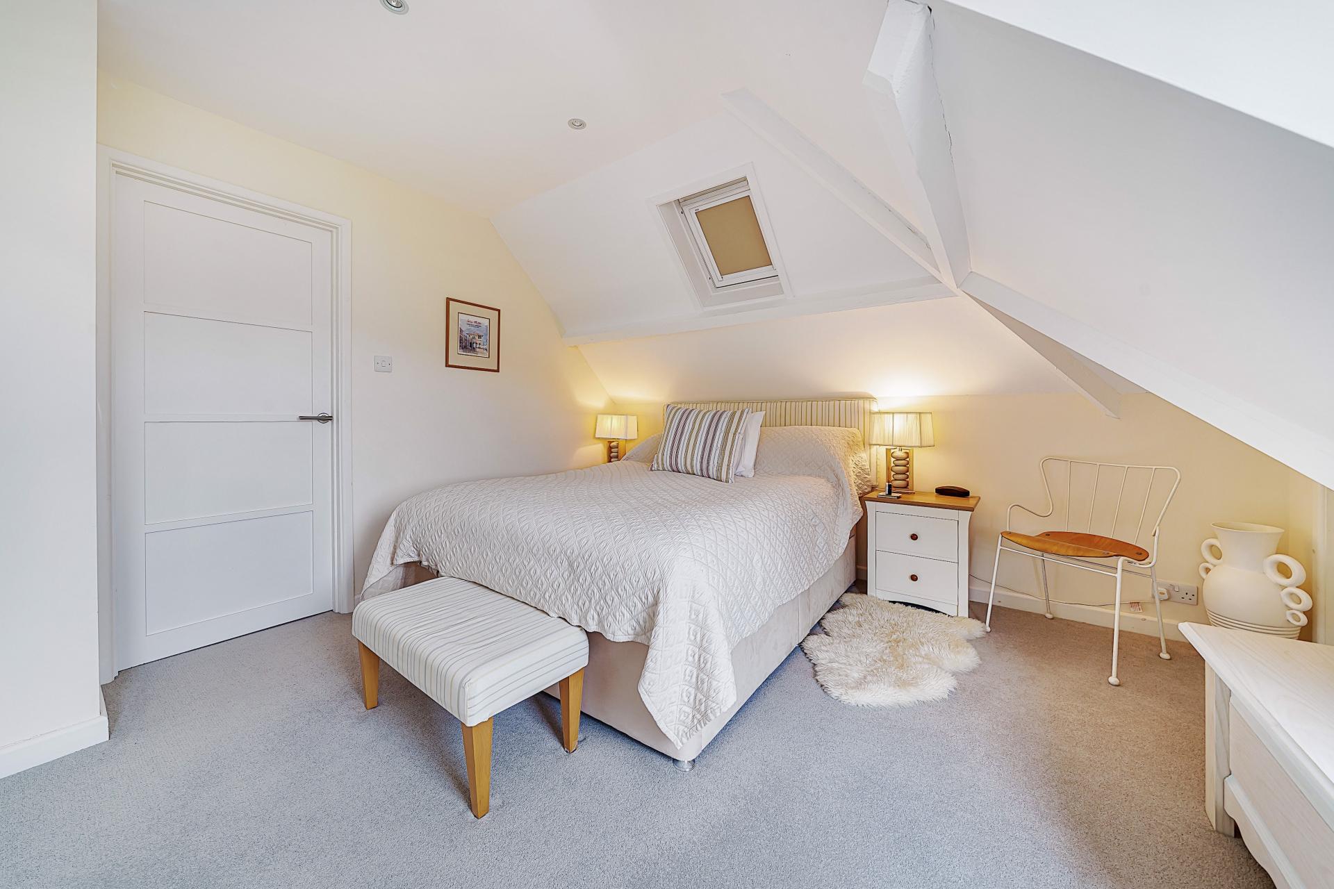 Two Velux windows, radiator, power points, storage under the eaves