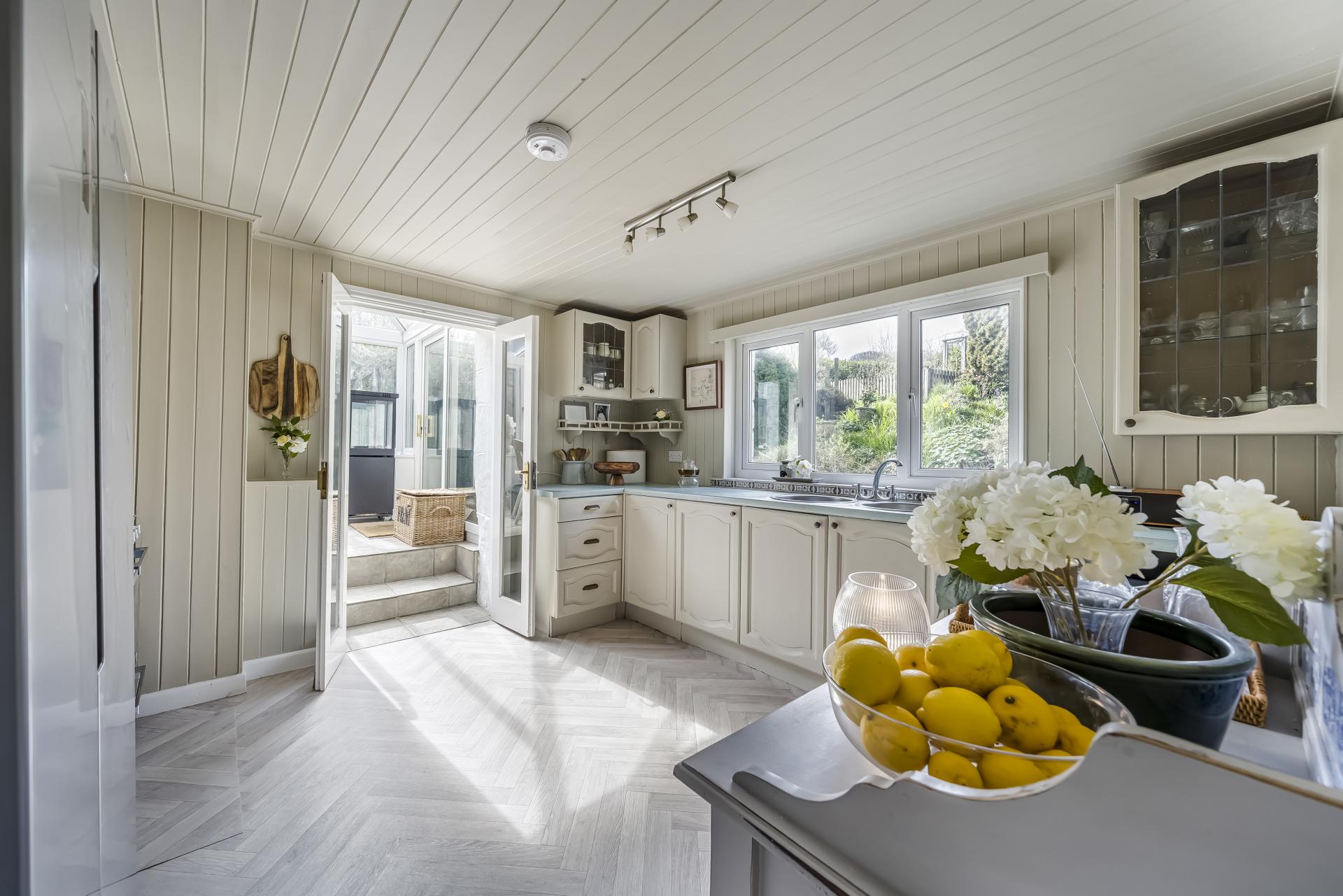 Delightful conservatory that flood not only the room with light but also the kitchen and living room. Looking out over the side garden, there is a tiled floor, windows to to side and front with sliding doors opening out to the garden and large pavilion style glass roof