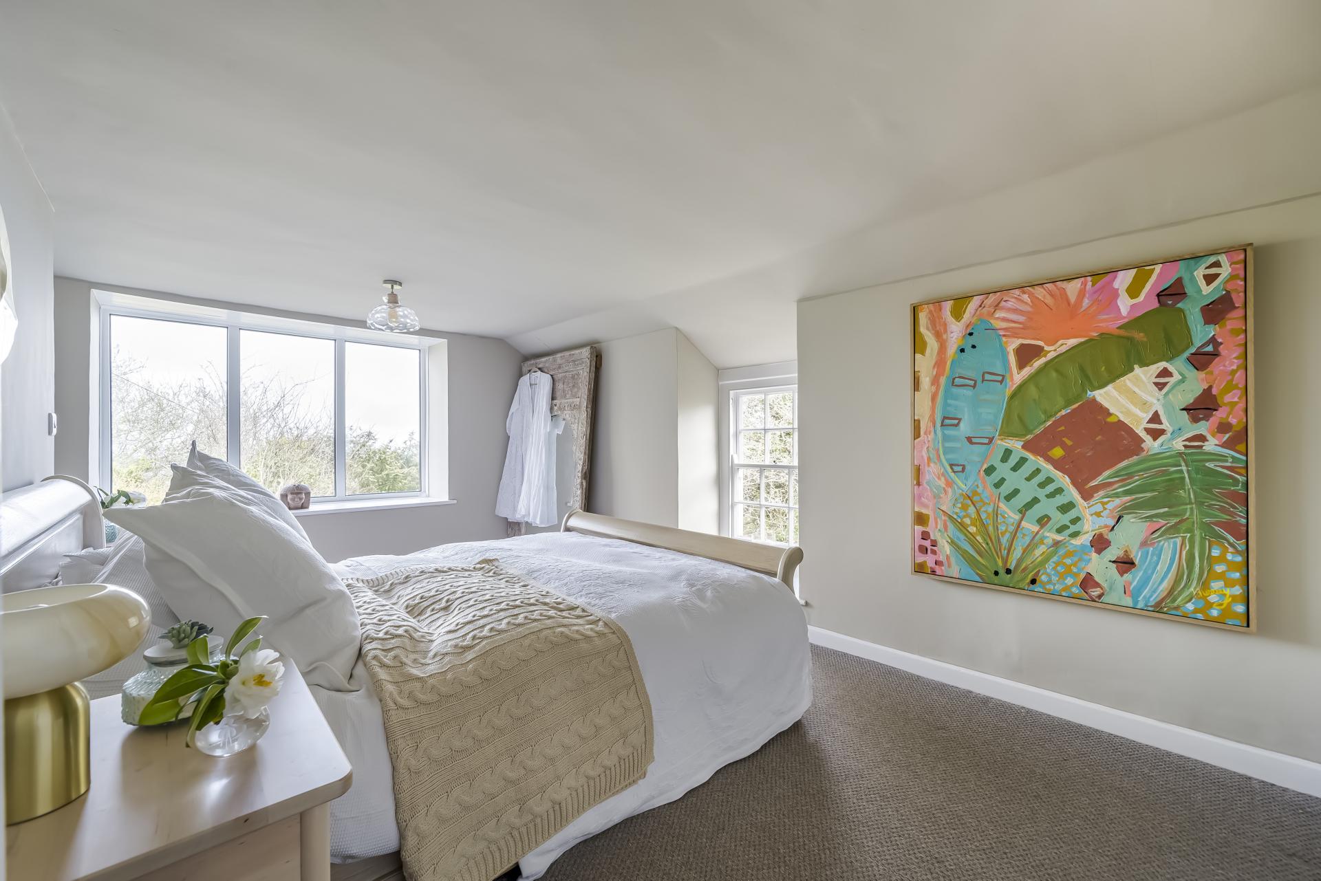 Beautiful, light, bright and spacious room with multi paned window to the front and a large picture window to the side offering super views over towards the sea and Godrevy Lighthouse. , sink unit inset small vanity unit, radiator, power points