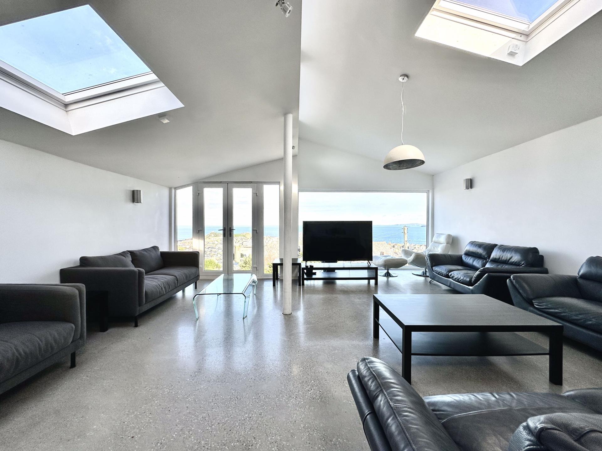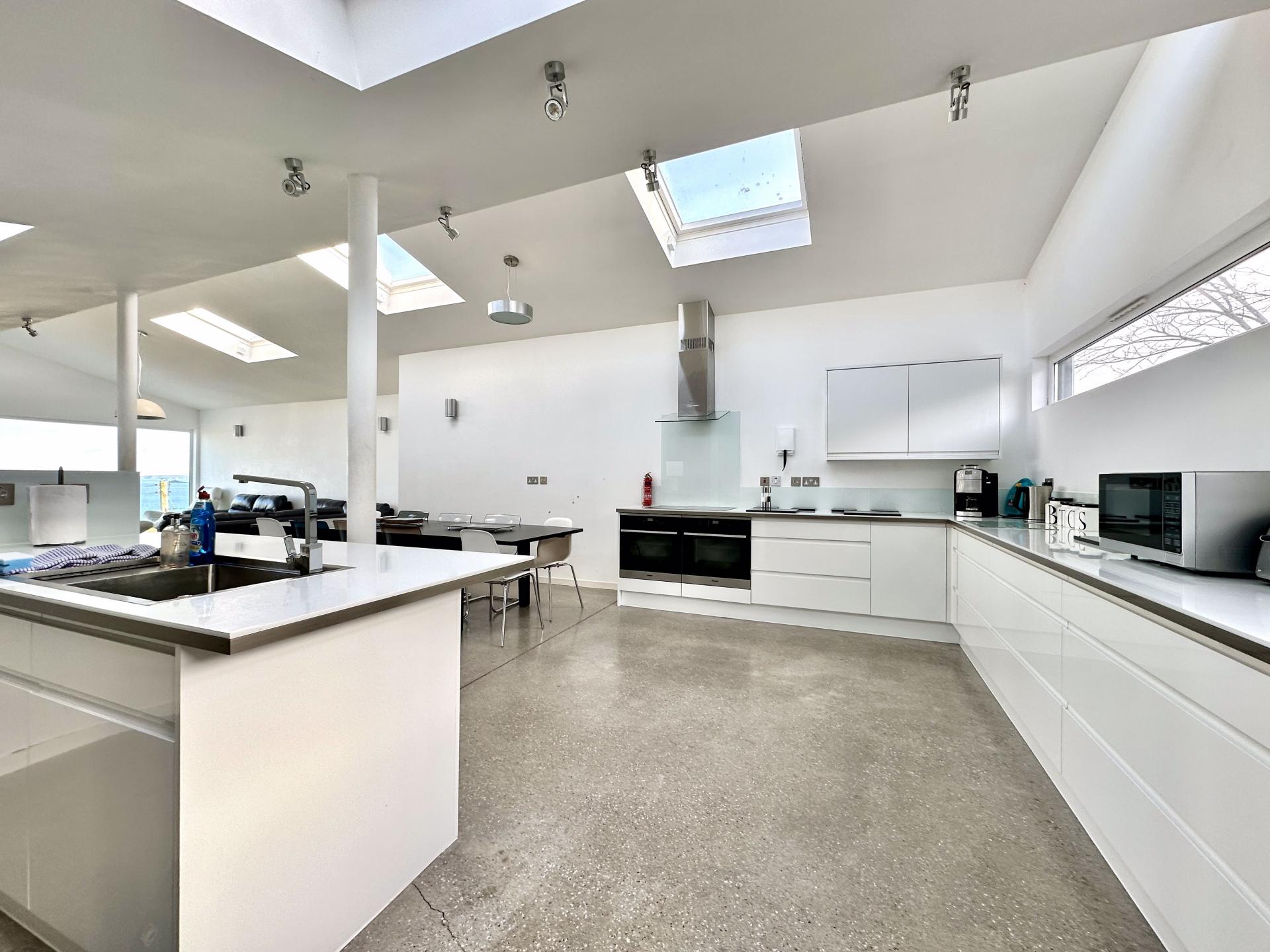 Superb room, open plan with large floor to ceiling feature window to the front offering some of the best views that can be gained from a property is St Ives, polished concrete flooring, 6 Velux windows giving this room an huge amount of light internally. The kitchen to the rear of this super room offers an extensive range of eye and base level units with ample worktop space over. 2 Miele ovens with an integrated Miele dishwasher and integrated fridge and freezer, window to the rear overlooking the rear gardens, stainless steel sink unit and drainer with taps over, 4 ring Miele induction hob with Miele extractor fan over. This is a great room and kitchen for entertaining