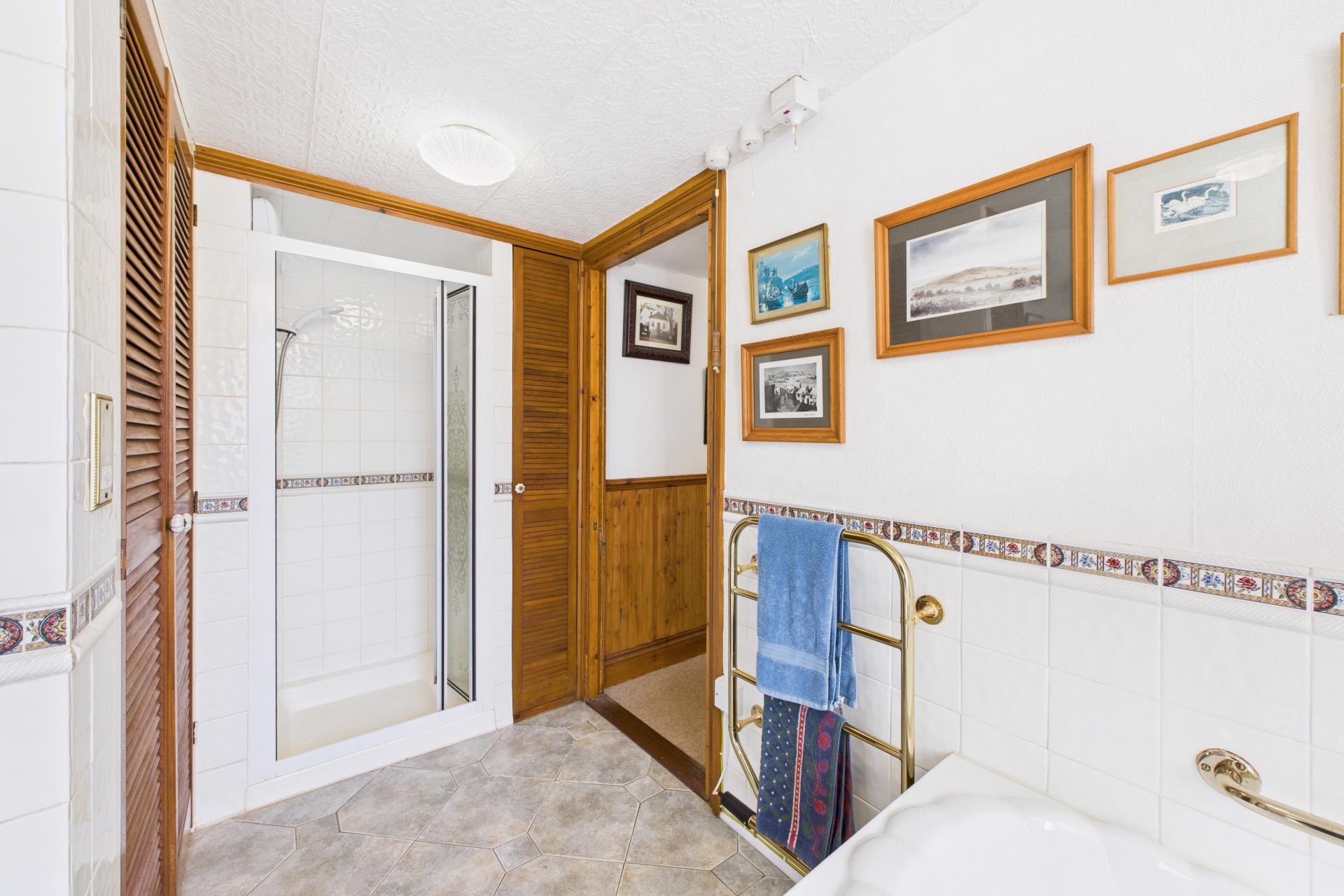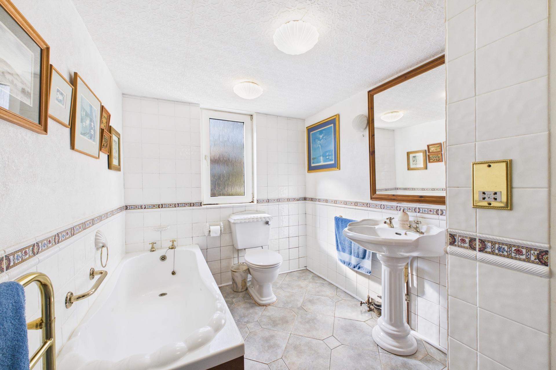 Part tiled walls, walk in shower cubicle with electric shower inset, heated towel rail, pedestal wash hand basin, panelled bath, close coupled WC, frosted double glazed window to the rear, built in airing cupboard housing the water tank and hot water tank