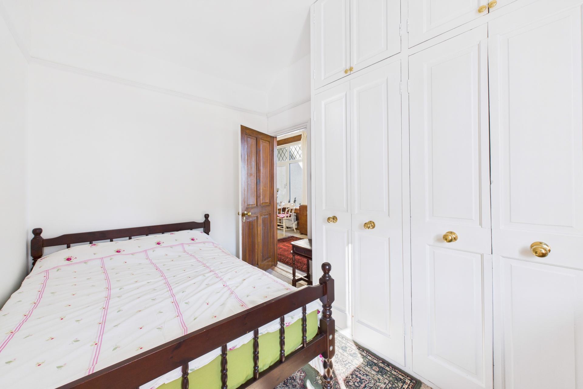 With doors to bedroom, kitchen and bathroom, wood panelling to dado height