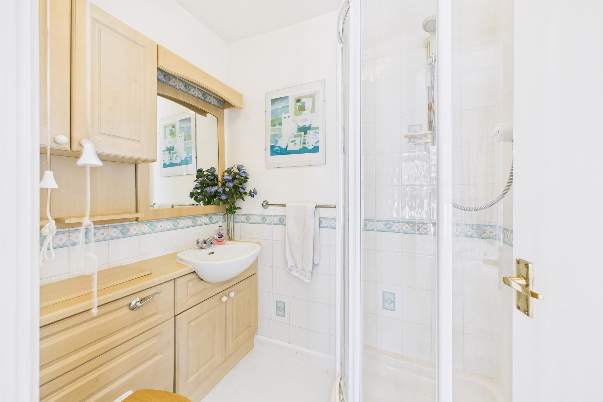 Laminate tiled floor, ceiling light, extractor fan , WC with hidden cistern, inbuilt vanity unit with inset wash hand basin with mixer tap, mirror over inset spotlights, tiled corner shower cubicle with sliding glazed doors and integrated shower over.