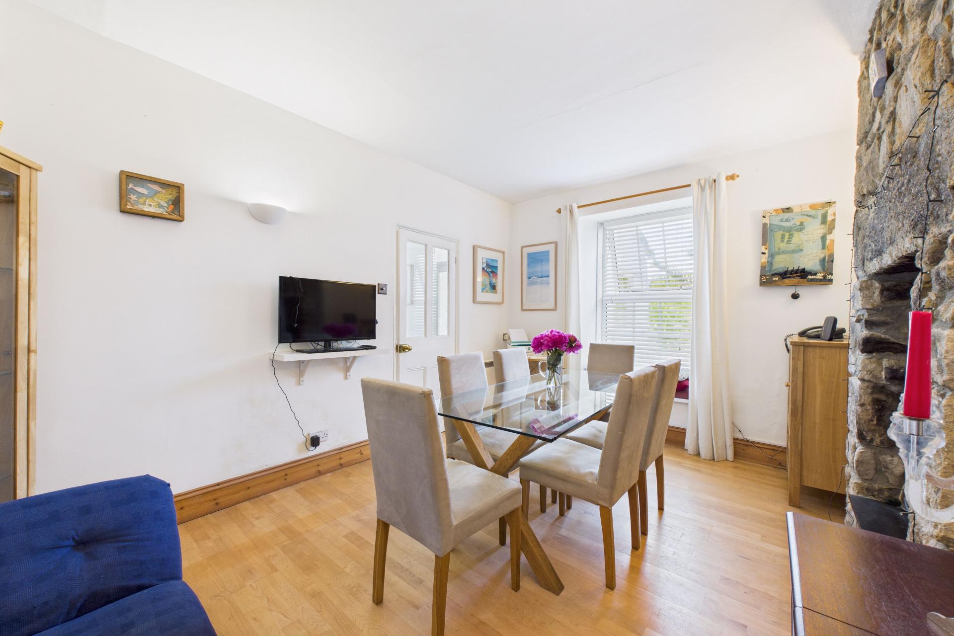 UPVC double glazed window to the front elevation with good views into the harbour, to the Island and St Ives bay. Further UPVC double glazed window to the side elevation. Maple wood floor, inset gas fire with slate hearth and wood mantle over, ceiling light, recess to side of fireplace with down lighting, wall lighting, power points, cupboard housing electric consumer unit and shelving, staircase rising to the first floor half landing and door to dining room.