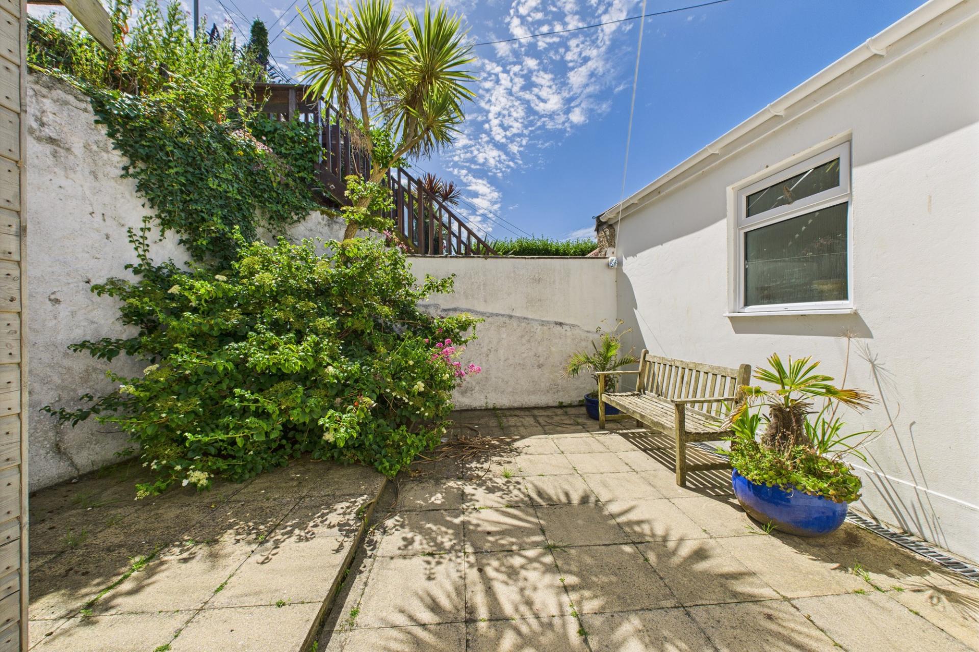 From Parc Avenue there is gated access and steps leading to a paved side courtyard with mature shrubs and enclosed with hedging, a further step up to a raised area with artificial grass, a path leading to the rear porch with further steps leading to the raised terrace with mature shrubs, shed and a sea view. Step from the side courtyard leading to the front porch door.