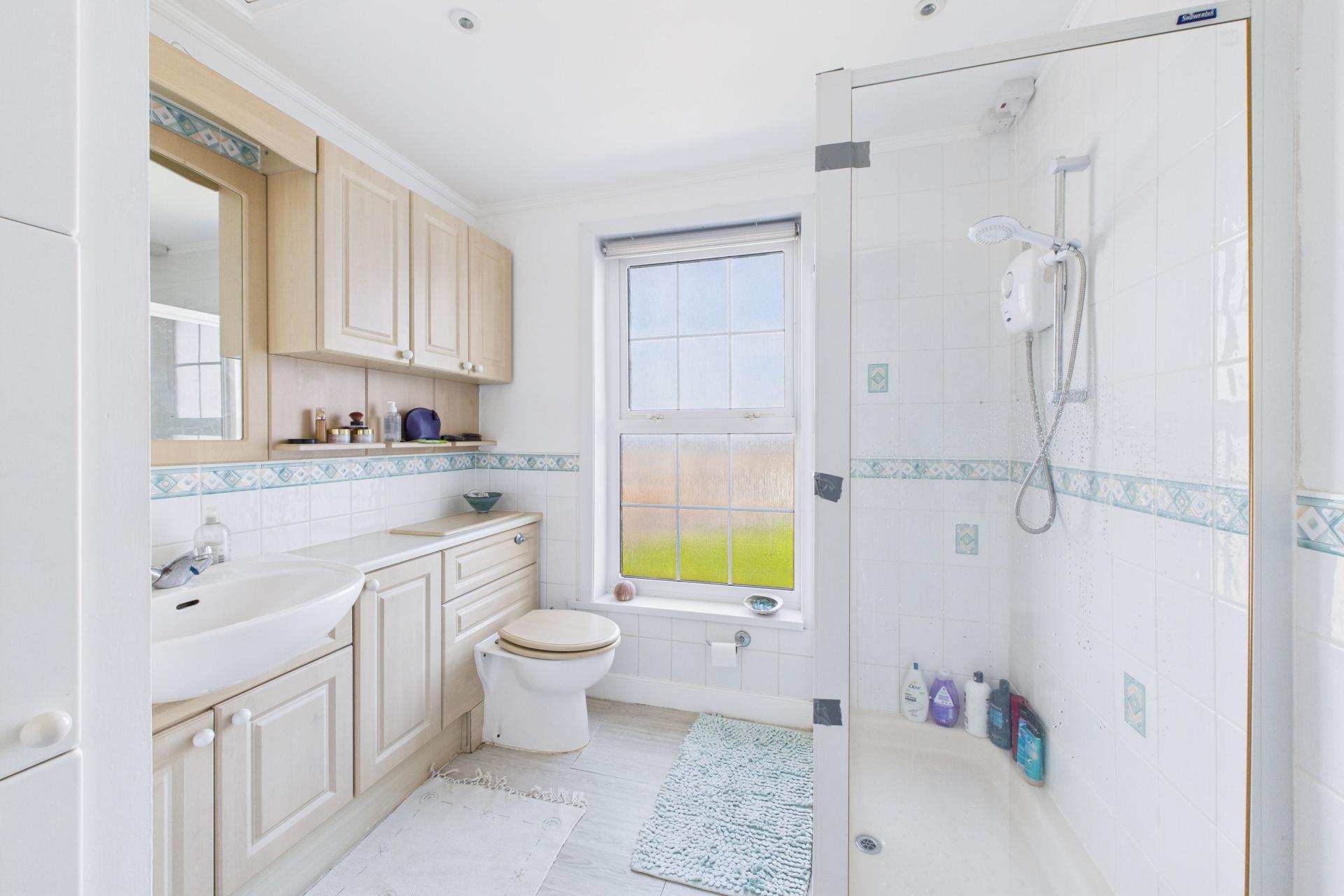 Obscure Double glazed window to side elevation, laminate flooring, spotlights, full wall vanity unit with hidden cistern WC and inset wash hand basin with mixer taps, cupboards above with shelving and mirror. Fully tiled double shower cubicle with electric shower over and glazed doors, towel rail, airing cupboard with hot water cylinder, shelving over and loft access.